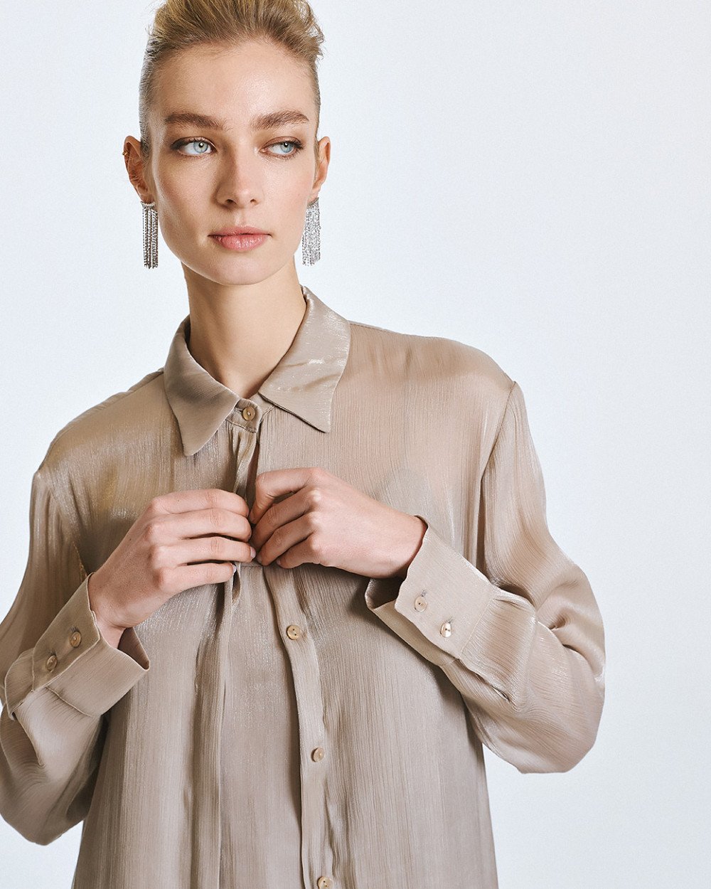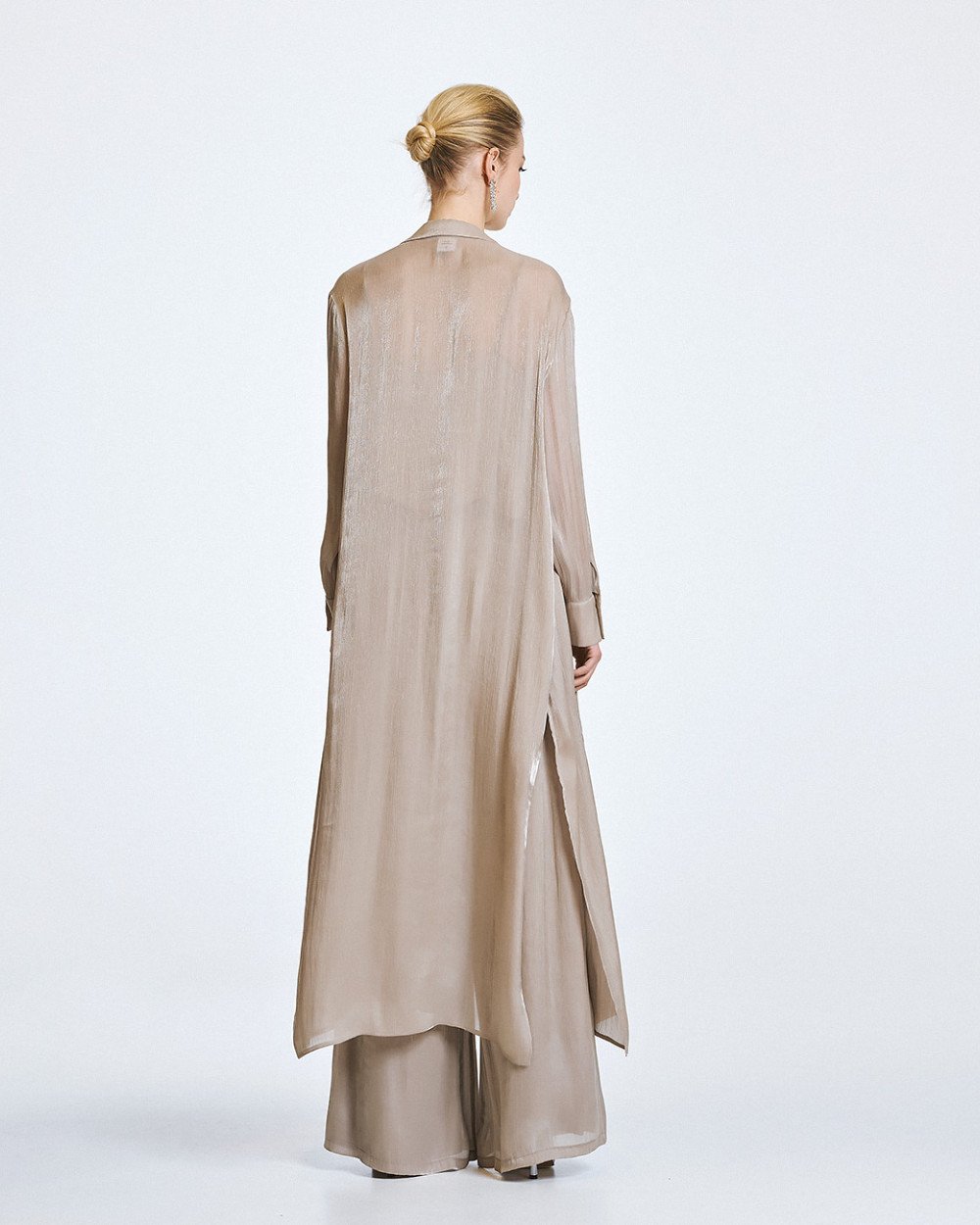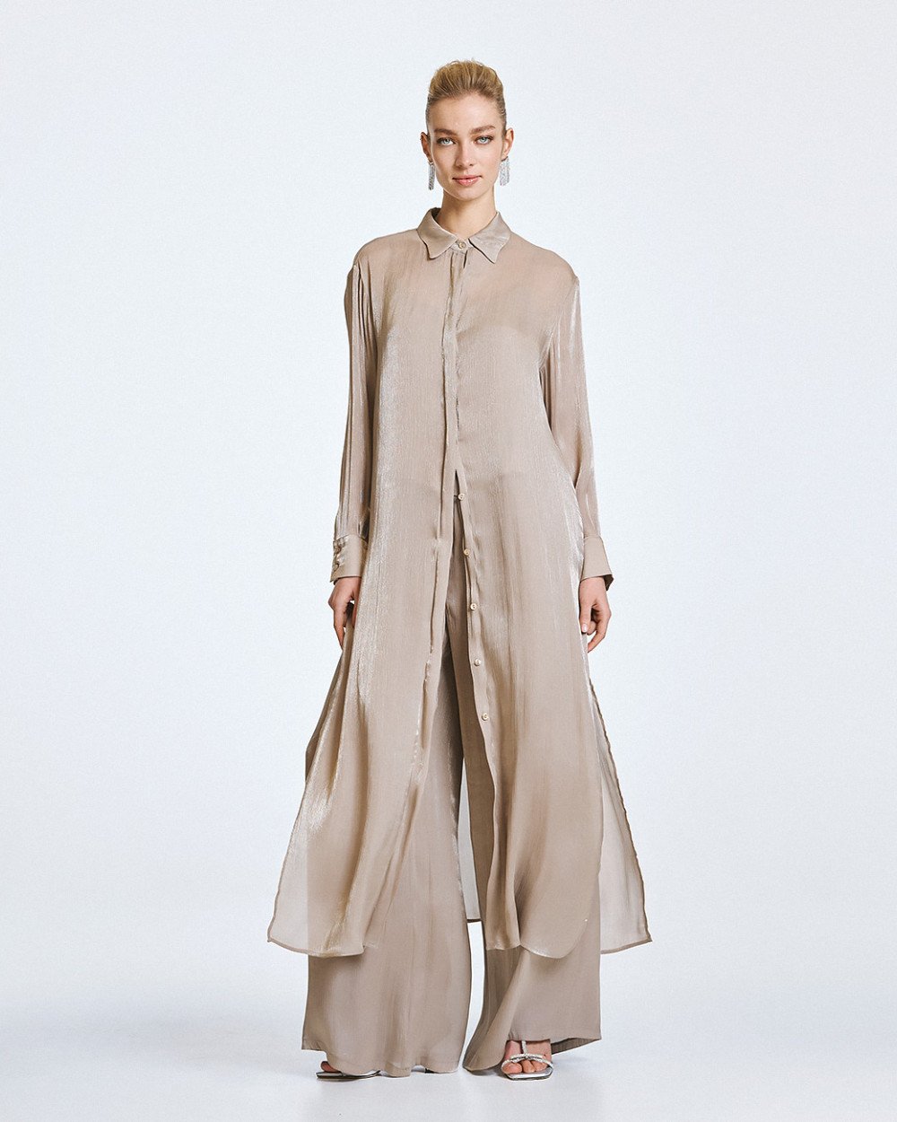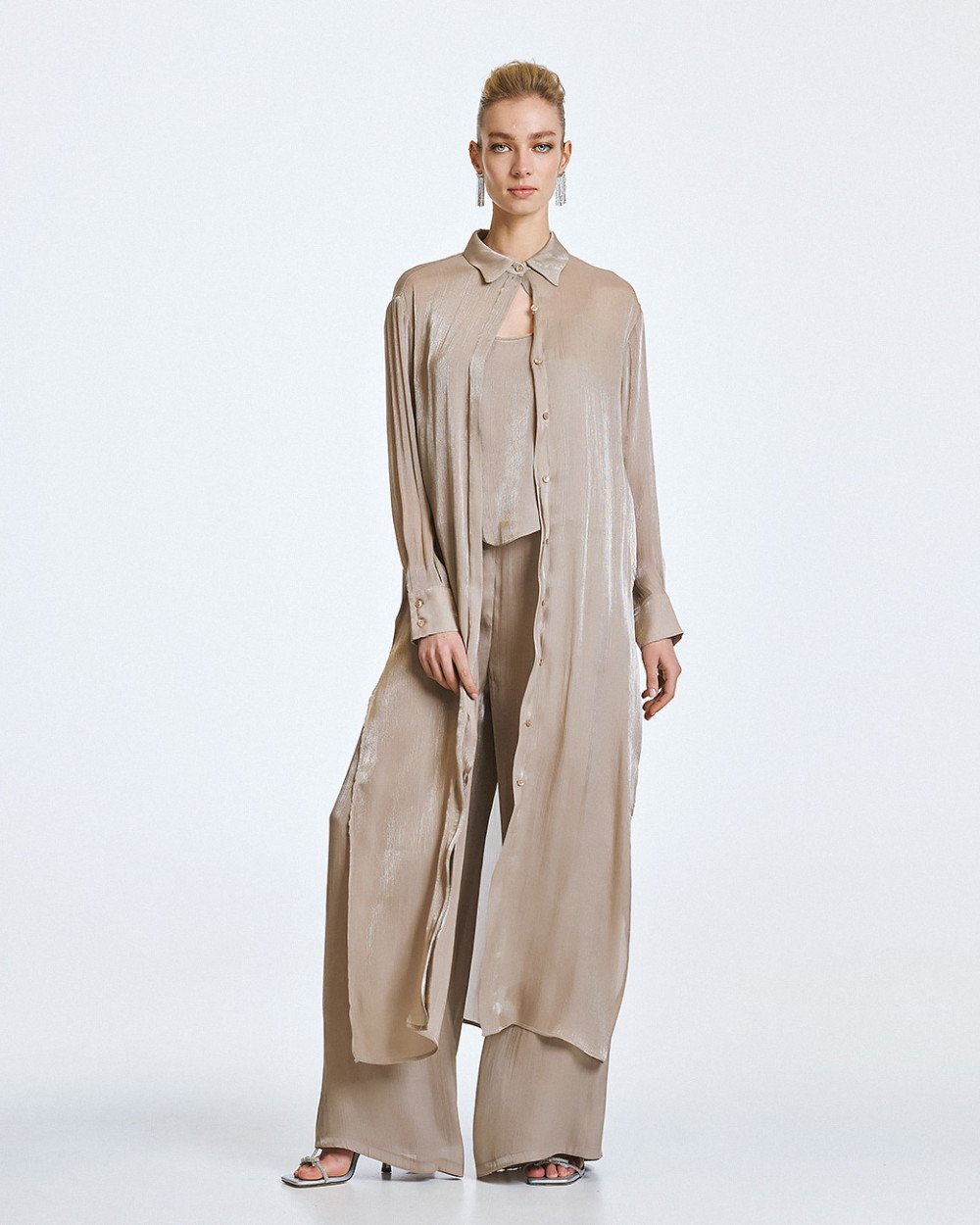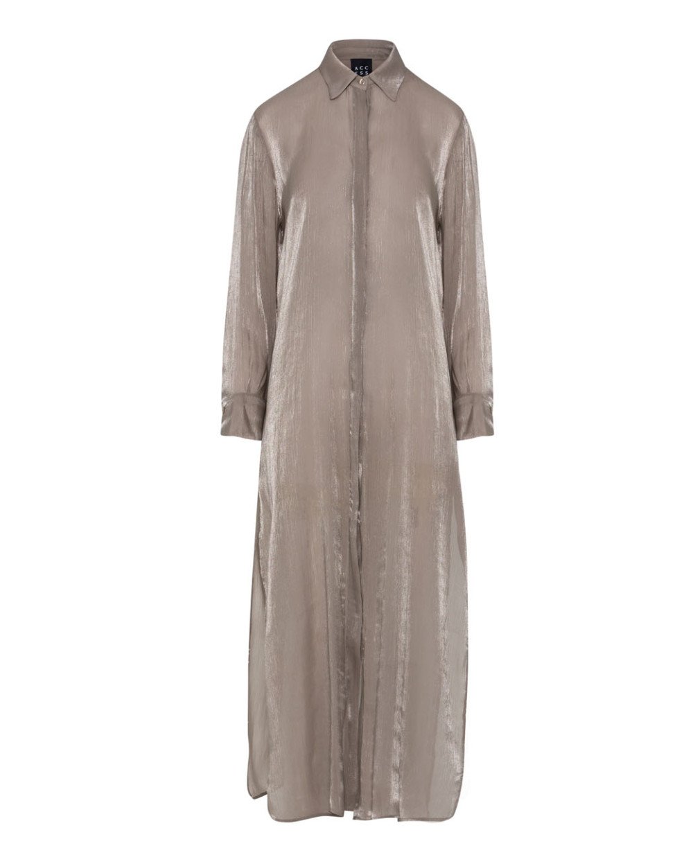 Abito camicia Midi con finitura lucida, colletto e maniche lunghe. Caratteristiche spacchi laterali e chiusura a bottone nella parte anteriore e presso i polsini.