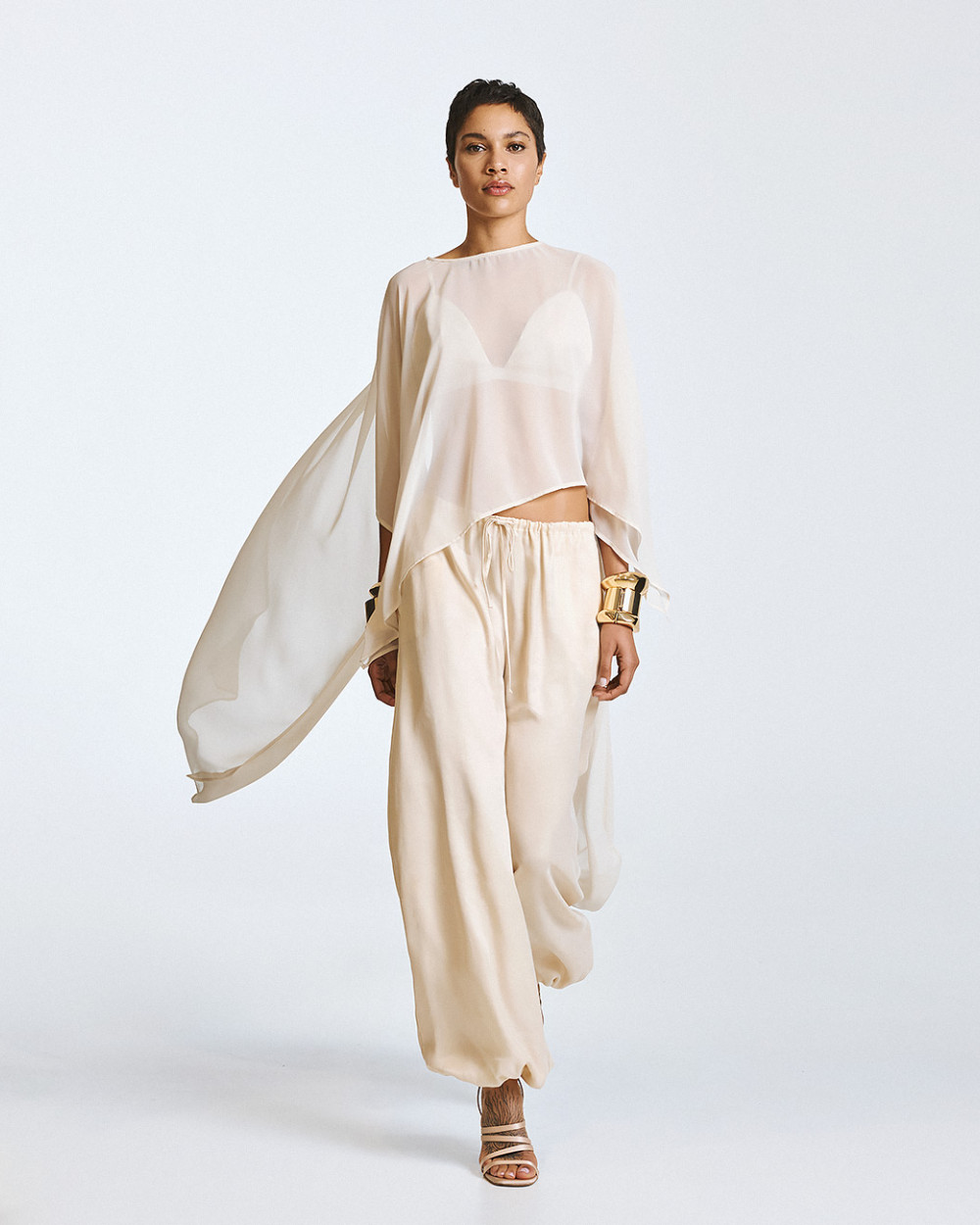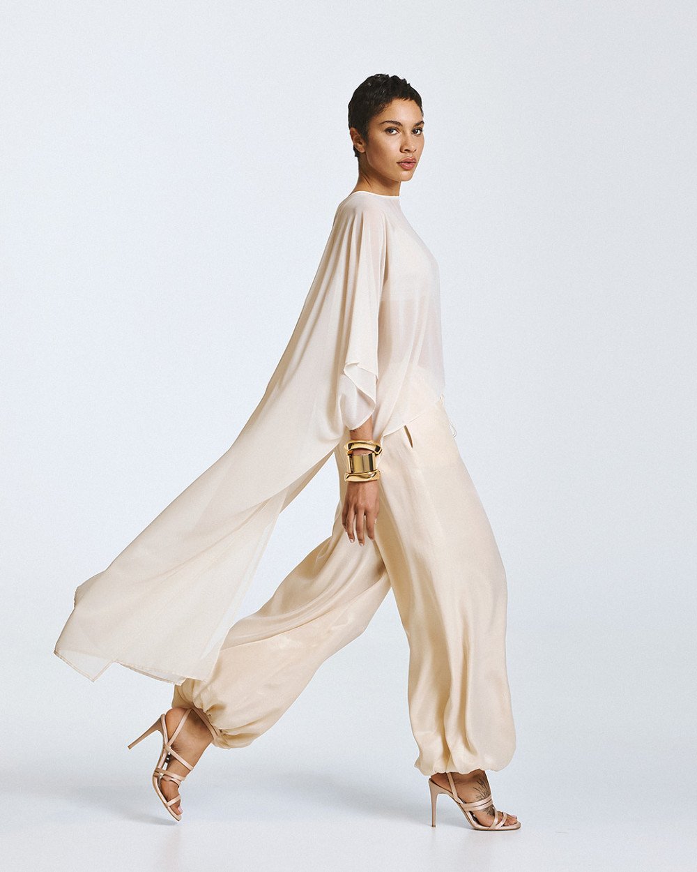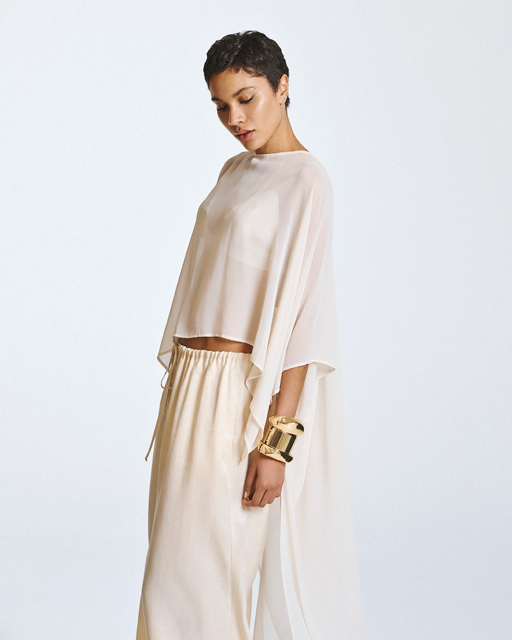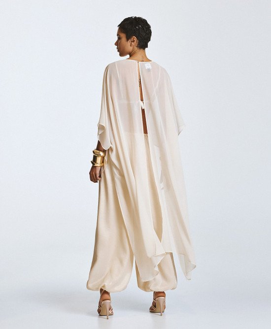 Blusa semi-trasparente in stile mantello con scollo a barca e maniche corte. Dispone di un orlo asimmetrico, più lungo sul retro e più corto nella parte anteriore, con una chiusura a bottone sul retro.