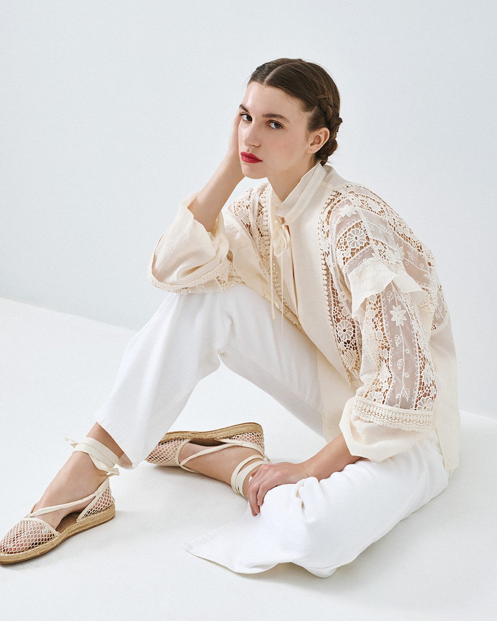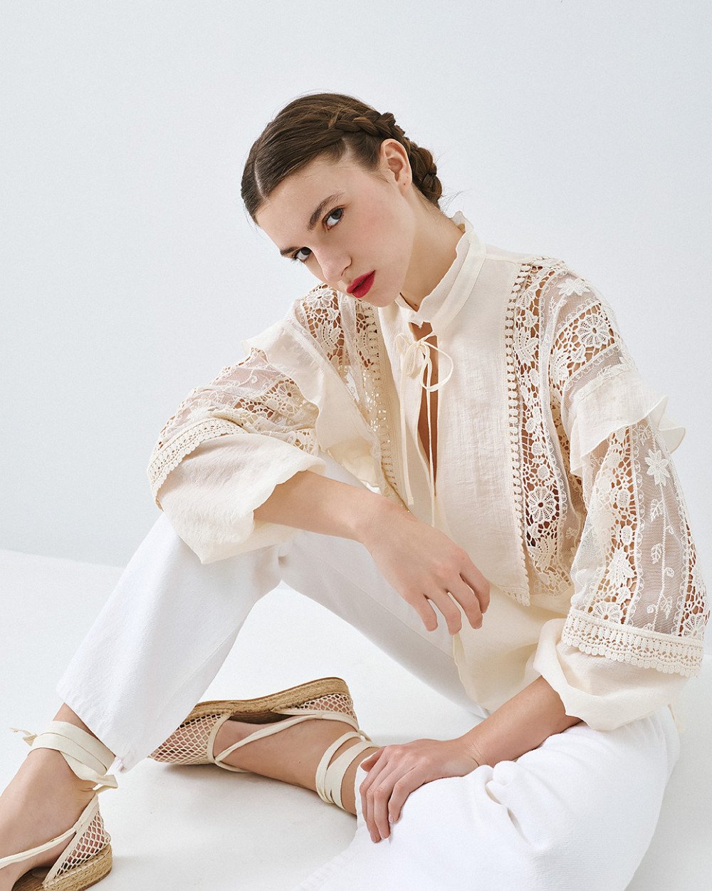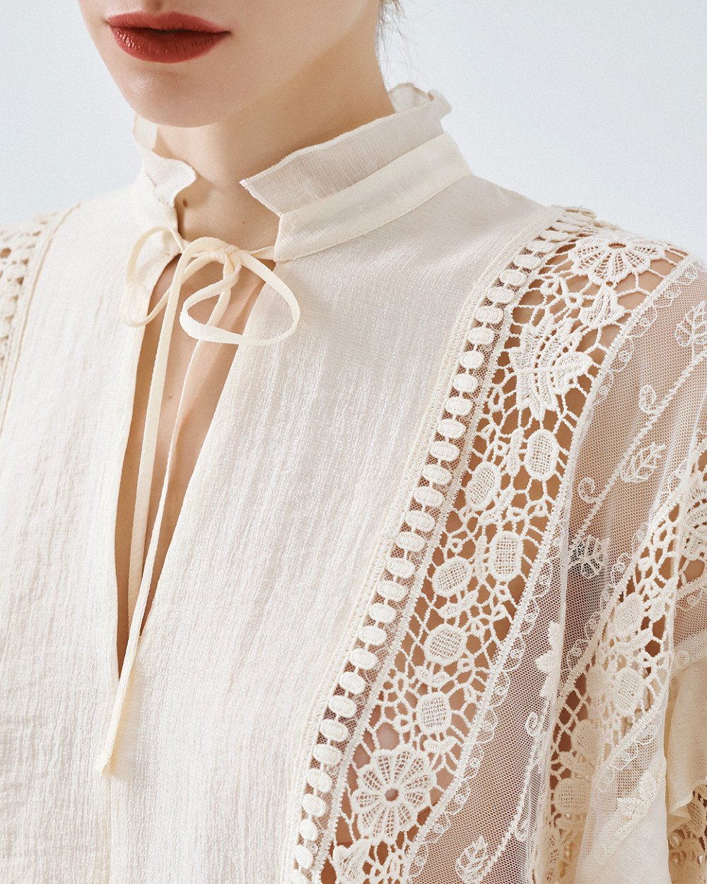 Camicetta con scollo a V, collo alto con fissaggio a cravatta e lunghe maniche a sbuffo con polsini elastici. Caratteristiche dettagli del pizzo all'uncinetto, piccole fessure laterali e dettagli del volant.