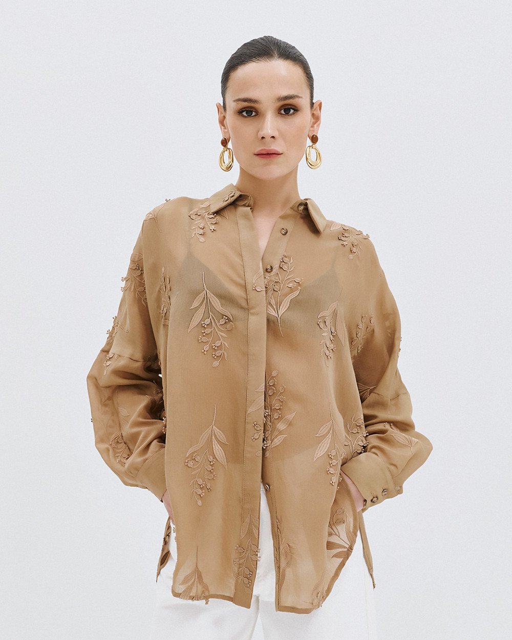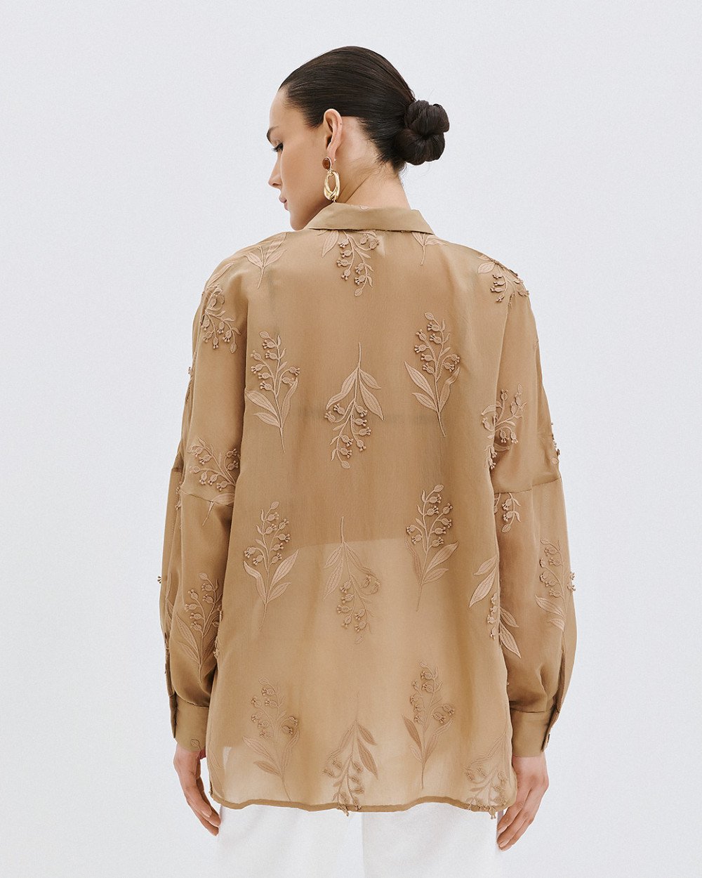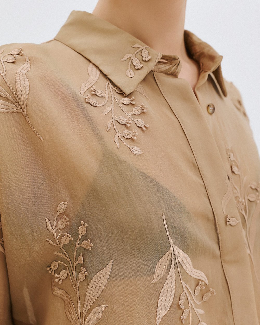 Camicia a maniche lunghe con colletto, dettagli ricamati e chiusura frontale e a bottone a polsino.