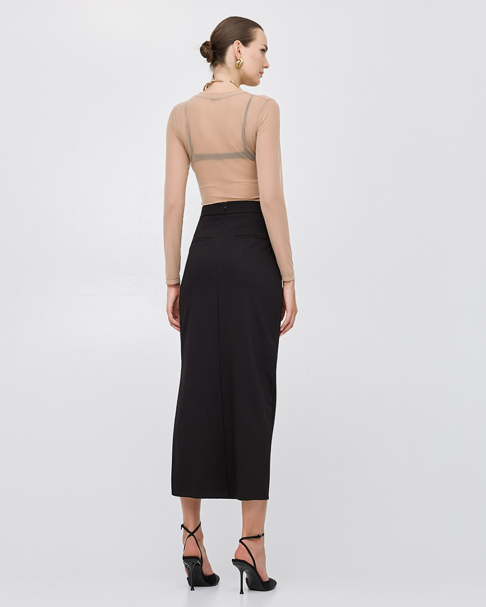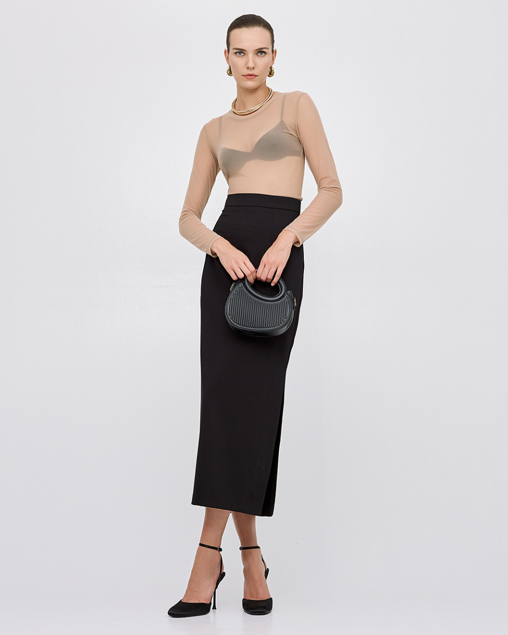 Gonna a matita con cuciture decorative e una fessura regolabile con cerniera sui lati. Accoppia con la camicetta abbinata della nostra collezione per un look chic.
