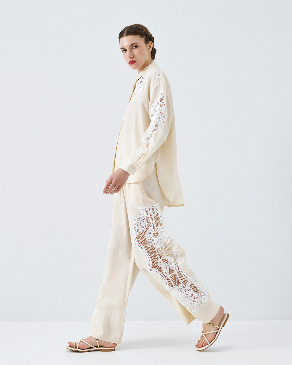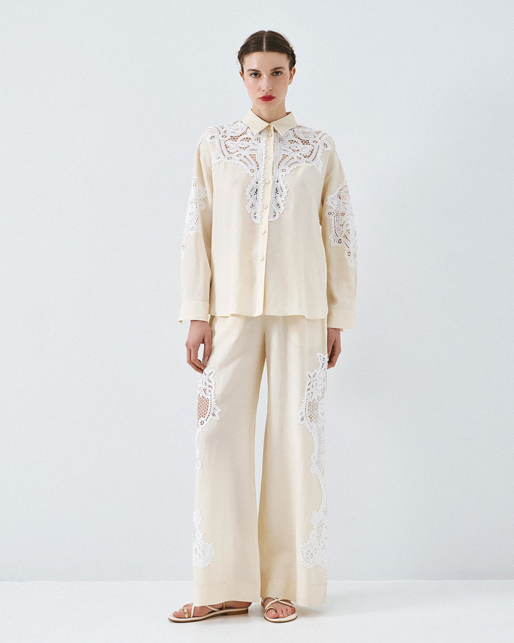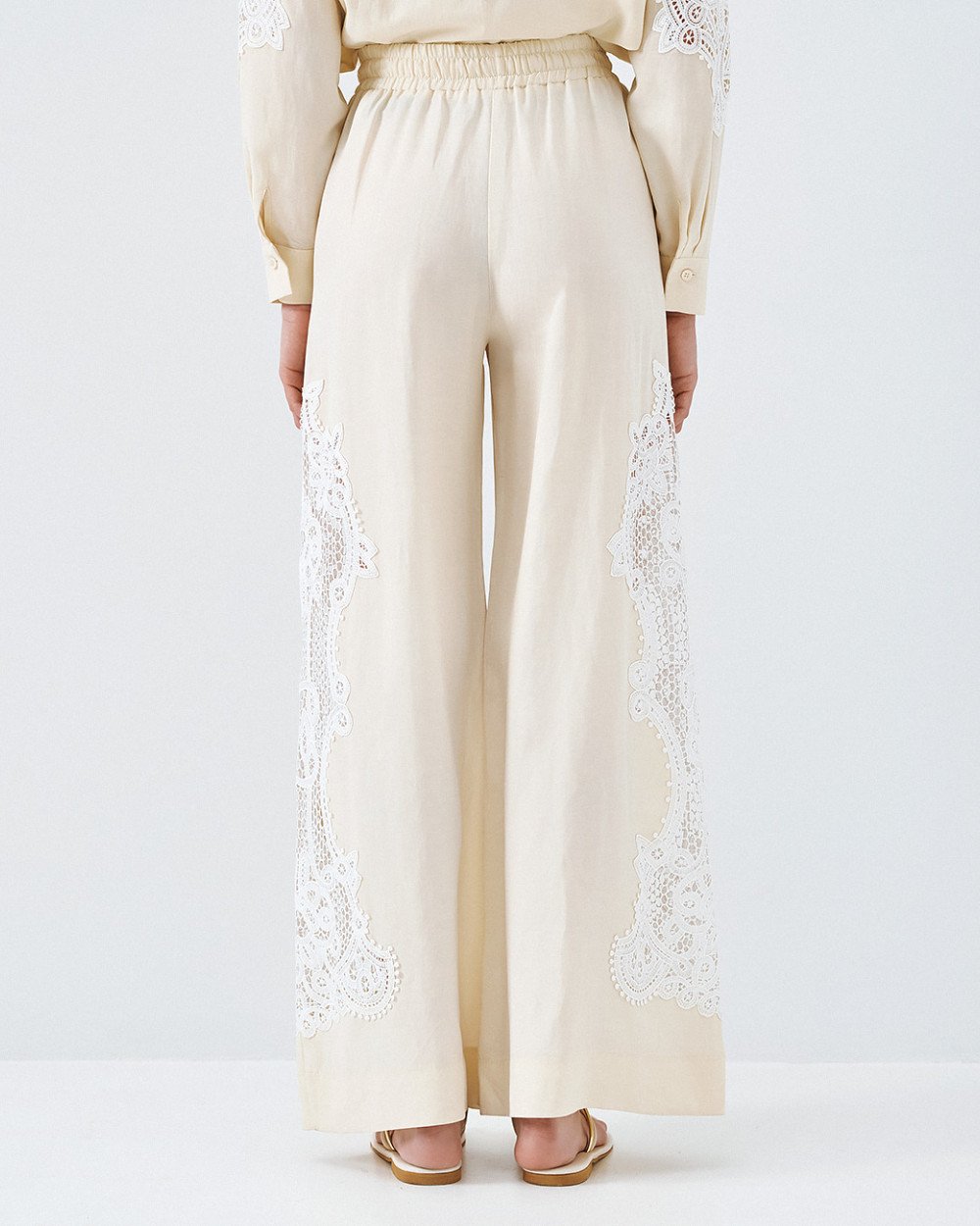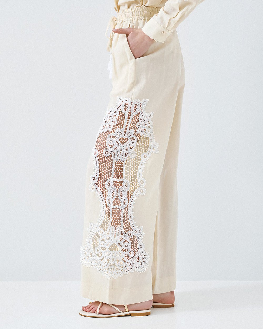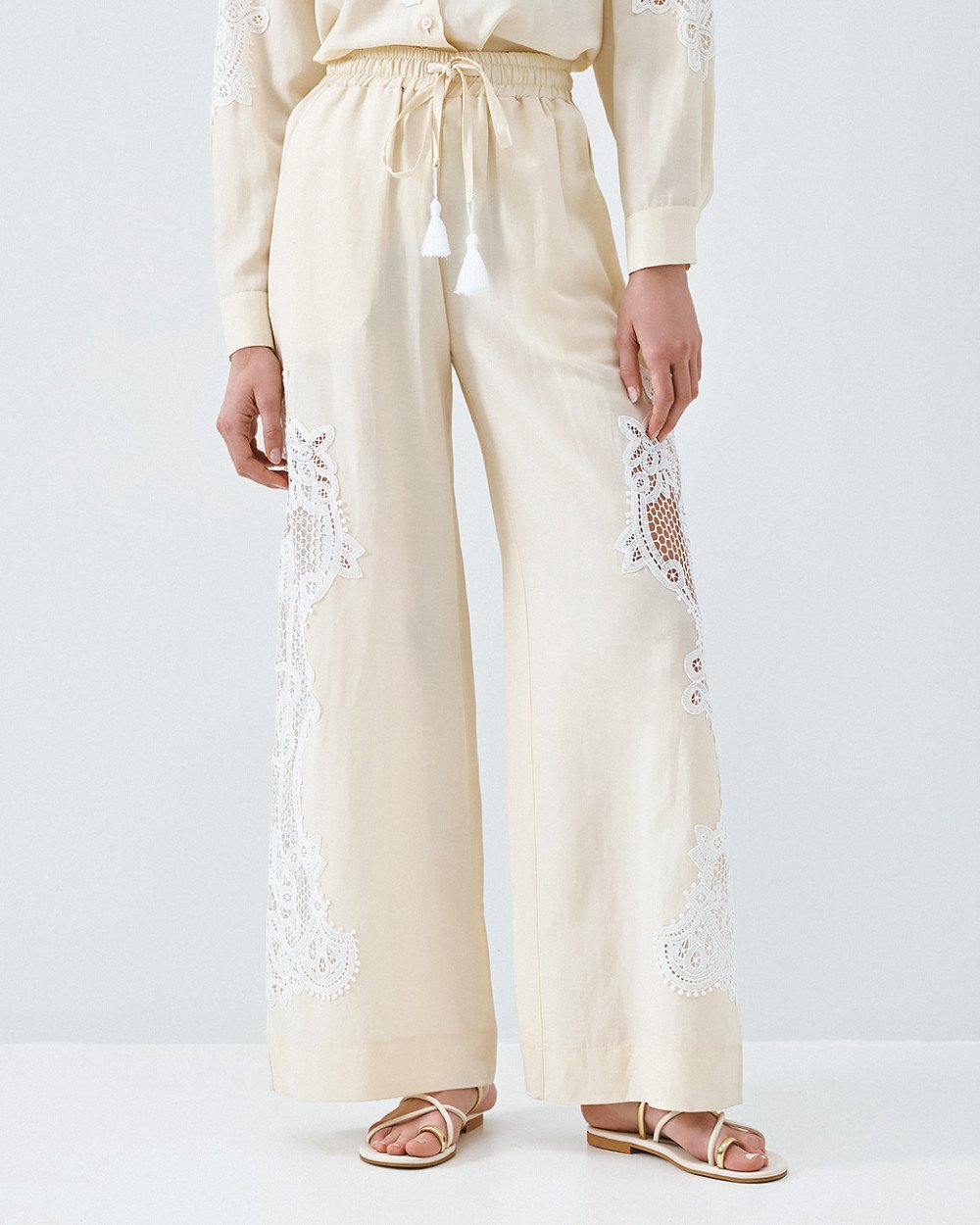 Pantaloni a gamba larga con tasche laterali e un elastico in vita con coulisse. Caratteristiche dettagli in pizzo all'uncinetto e nappe decorative sui coulissi.