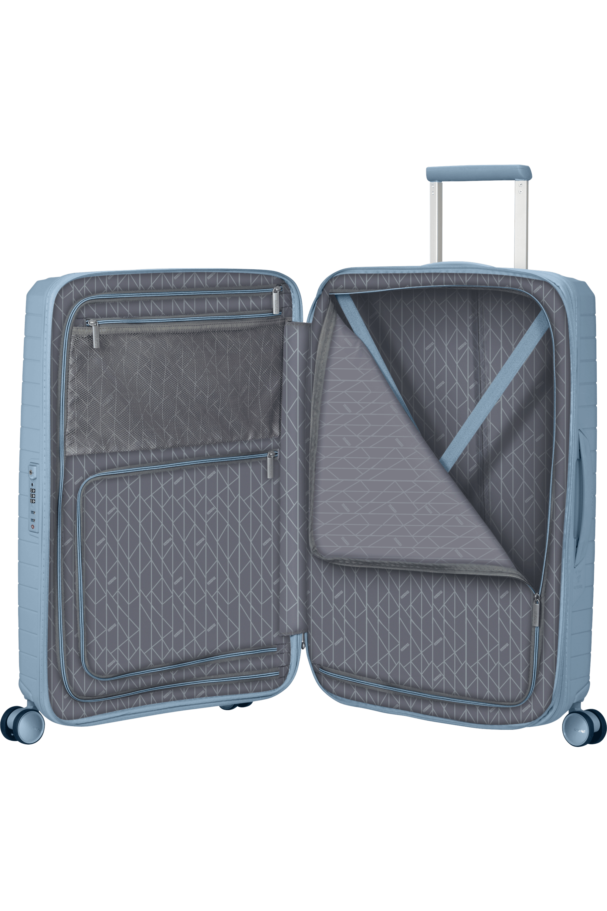 - Il 100% in peso della fodera interna, dell'espandibilità e delle cerniere è realizzato con plastica PET riciclata post-consumo utilizzando 10 bottiglie riciclate da 500 ml
