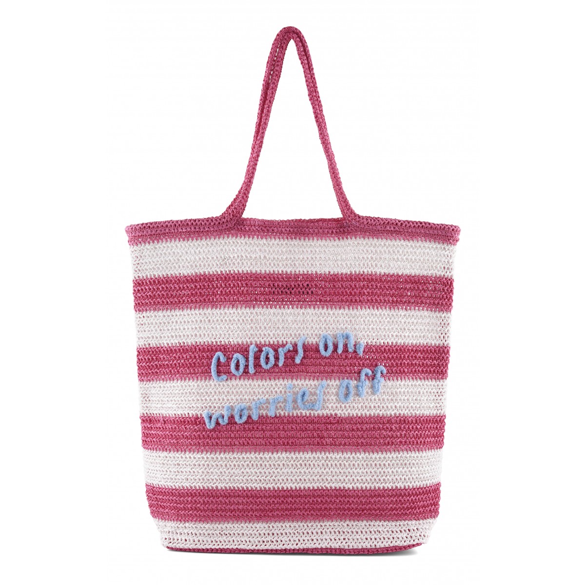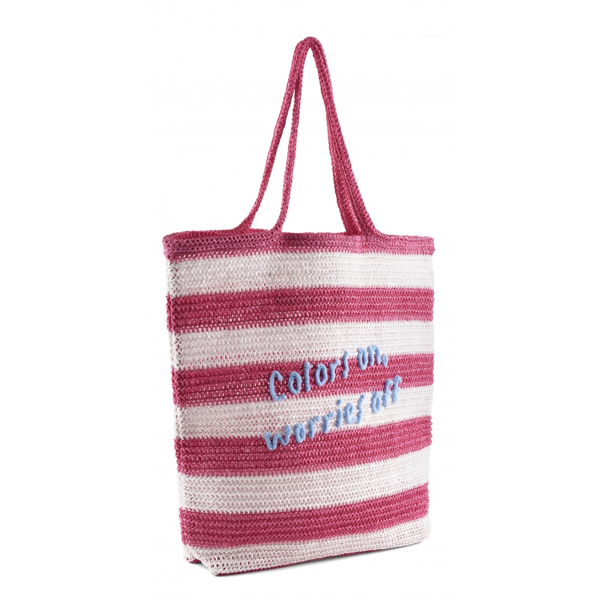Borsa mare in rafia a righe bianche e blu, dal mood estivo e spensierato. La scritta ricamata a contrasto Colors on, worries off aggiunge un tocco ironico e positivo, perfetto per accompagnare le giornate di sole. Capiente e leggera, è dotata di doppi manici comodi da portare a spalla, ideali per un utilizzo pratico e confortevole. Dalla spiaggia alla city, completa il look sandali flat e abiti leggeri.