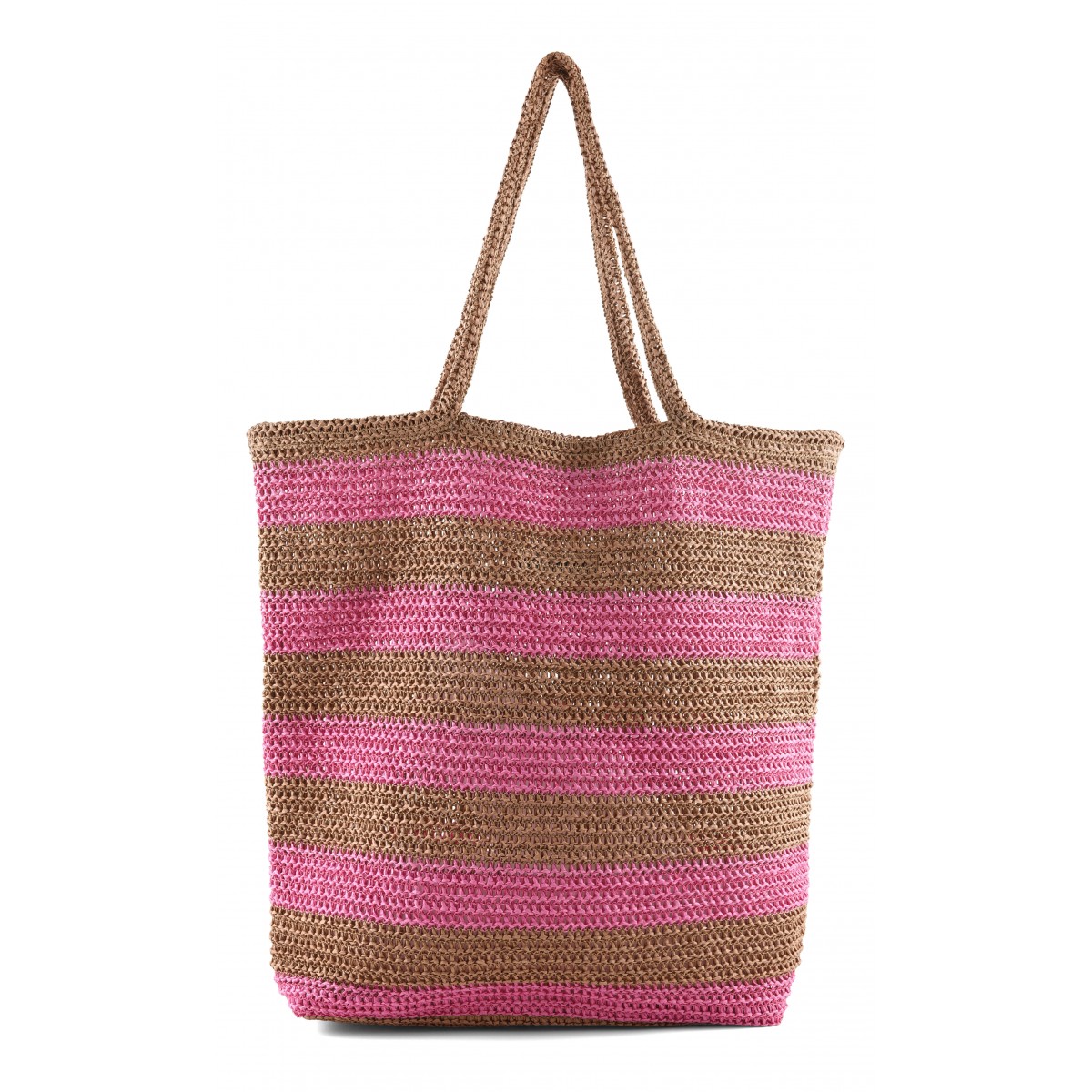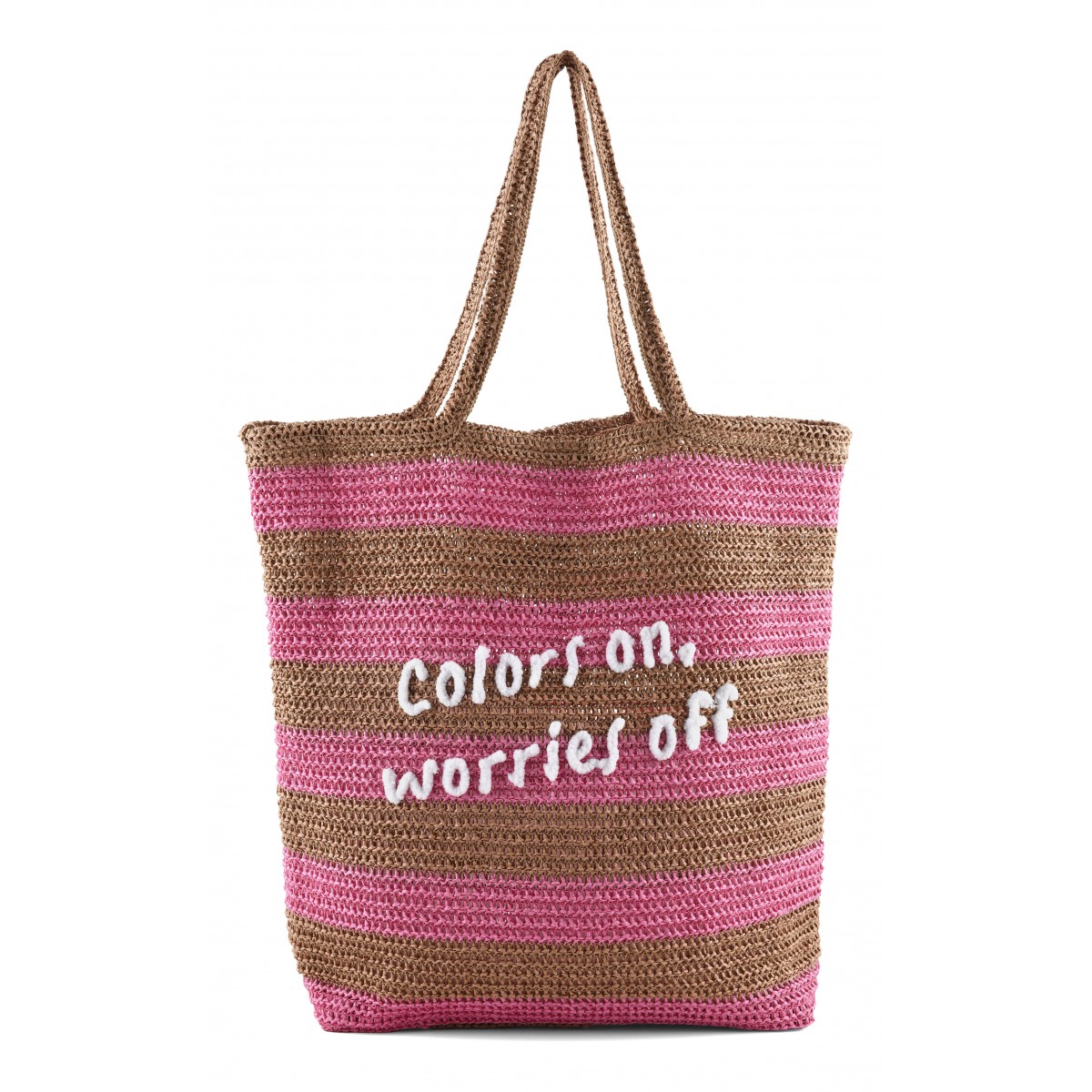 Borsa mare in rafia a righe bianche e blu, dal mood estivo e spensierato. La scritta ricamata a contrasto Colors on, worries off aggiunge un tocco ironico e positivo, perfetto per accompagnare le giornate di sole. Capiente e leggera, è dotata di doppi manici comodi da portare a spalla, ideali per un utilizzo pratico e confortevole. Dalla spiaggia alla city, completa il look sandali flat e abiti leggeri.