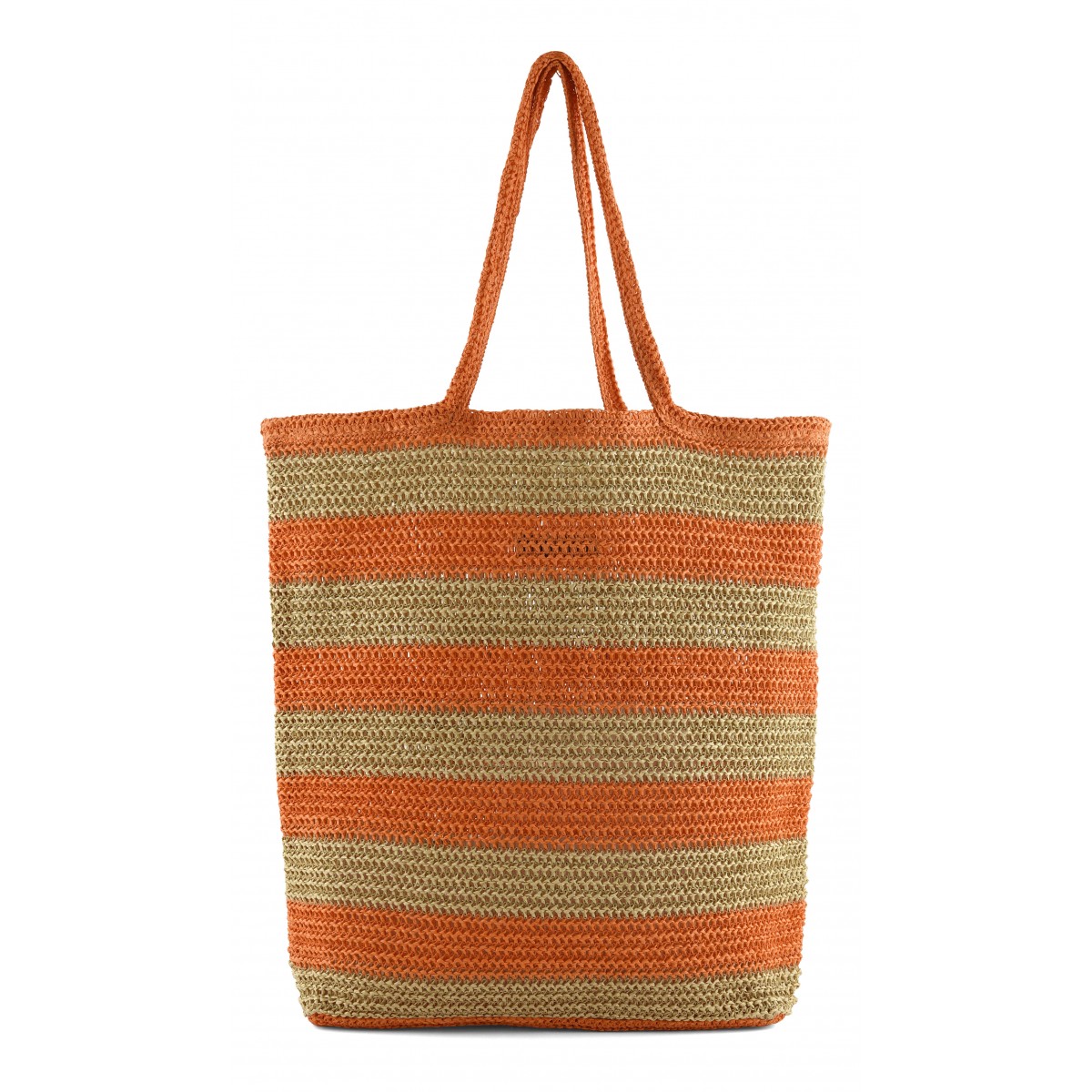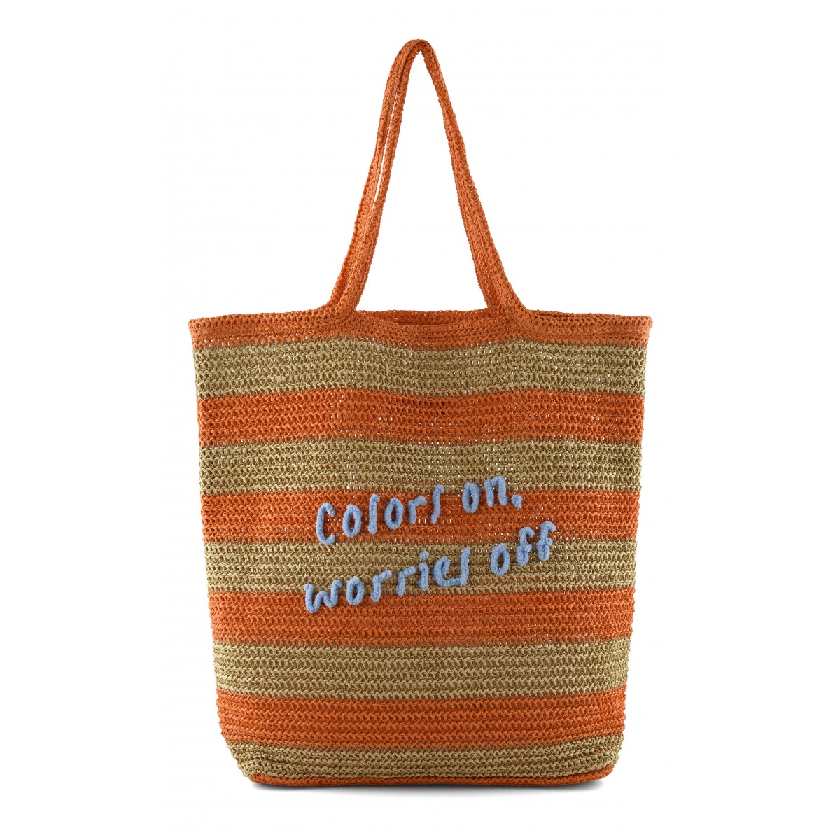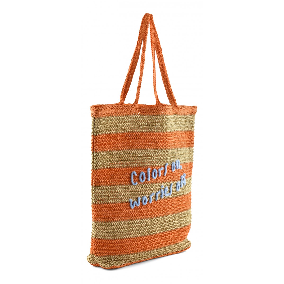 Borsa mare in rafia a righe bianche e blu, dal mood estivo e spensierato. La scritta ricamata a contrasto Colors on, worries off aggiunge un tocco ironico e positivo, perfetto per accompagnare le giornate di sole. Capiente e leggera, è dotata di doppi manici comodi da portare a spalla, ideali per un utilizzo pratico e confortevole. Dalla spiaggia alla city, completa il look sandali flat e abiti leggeri.