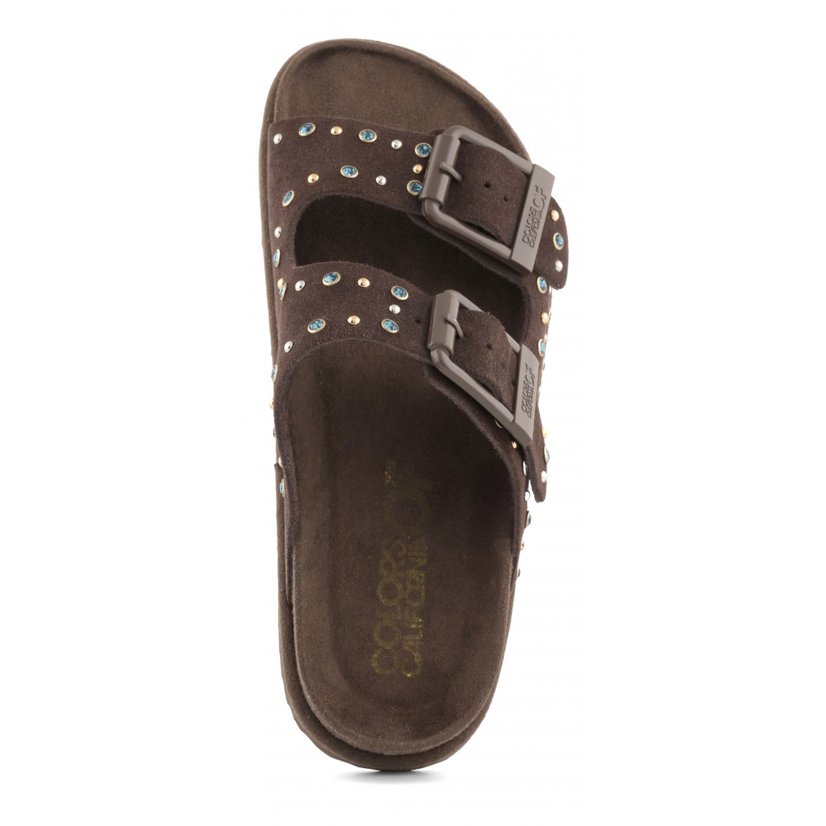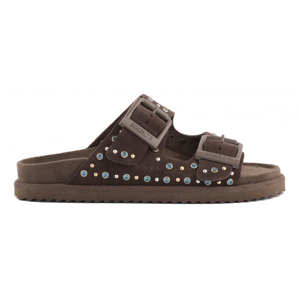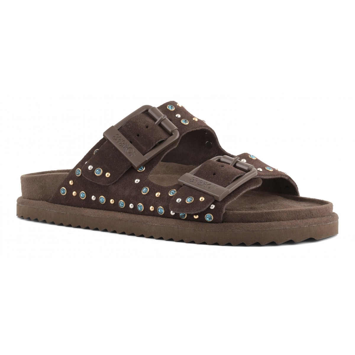 Sandalo a doppia fascia in pelle, arricchito da fibbie logate in metallo e borchie decorative. Dal design grintoso e disinvolto, esprime un atteggiamento casual che strizza locchio al mondo Coachella style. Un modello perfetto per completare look estivi dallo spirito libero e cool. Abiti ampi e leggeri stampa Paisley o denim e pelle scamosciata completano il look.