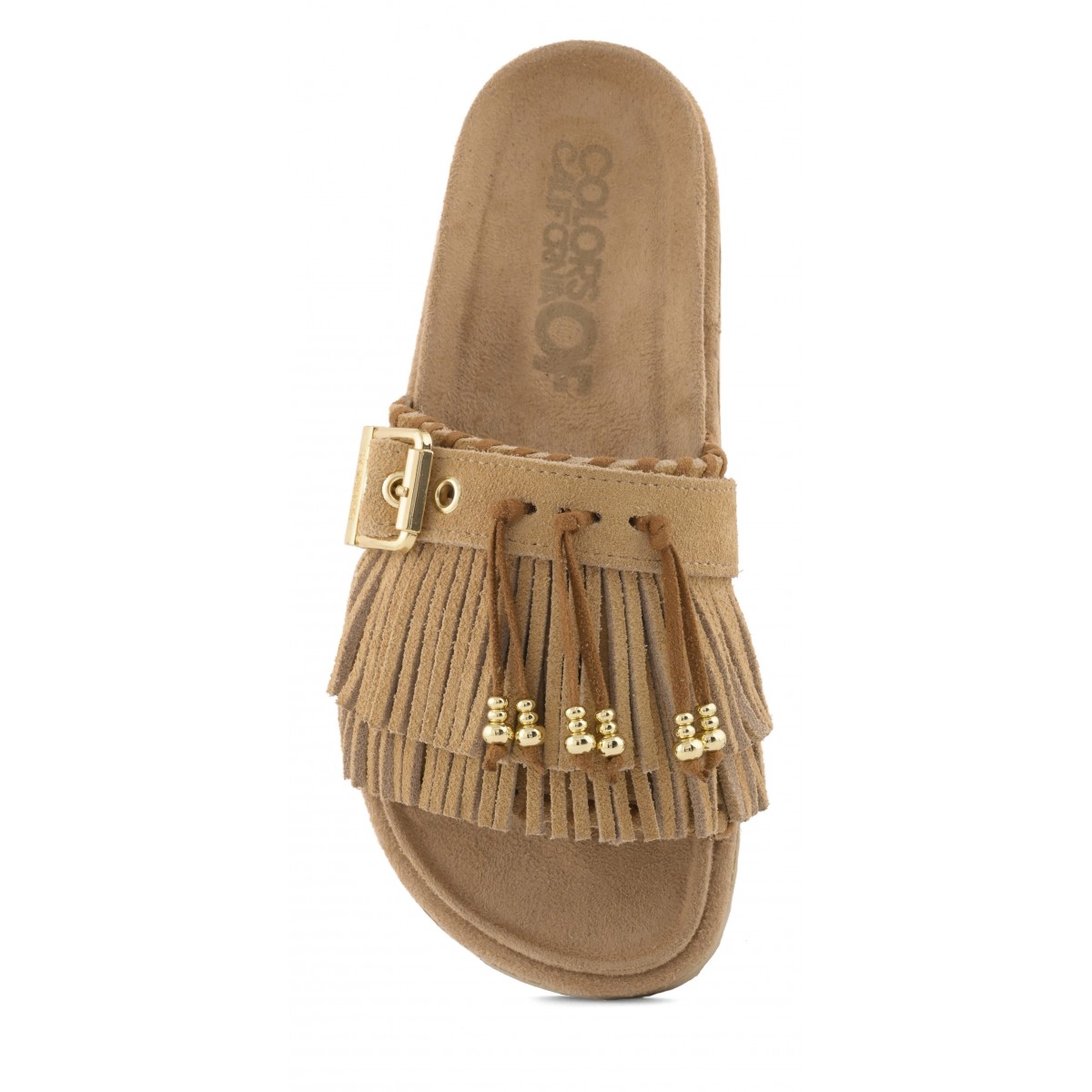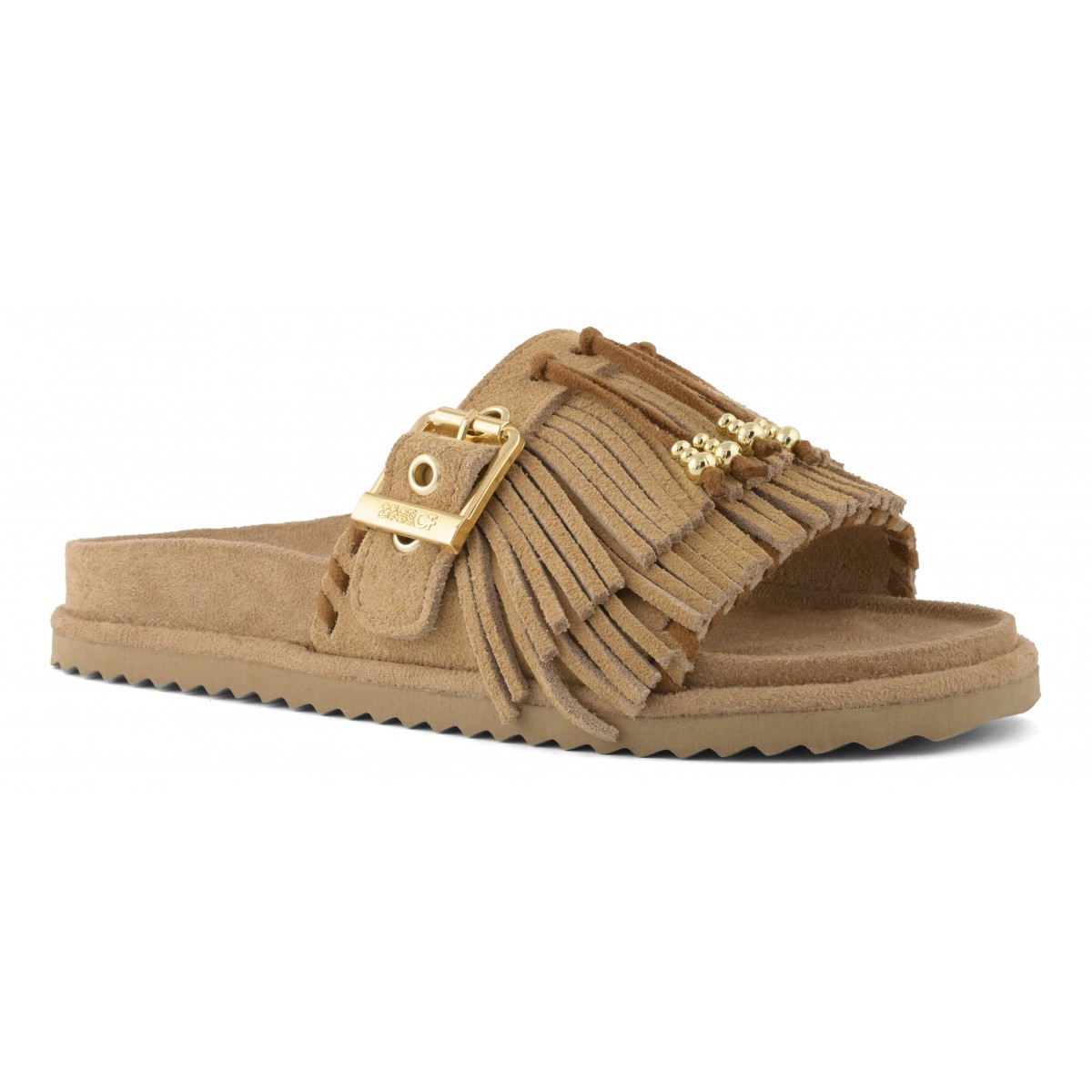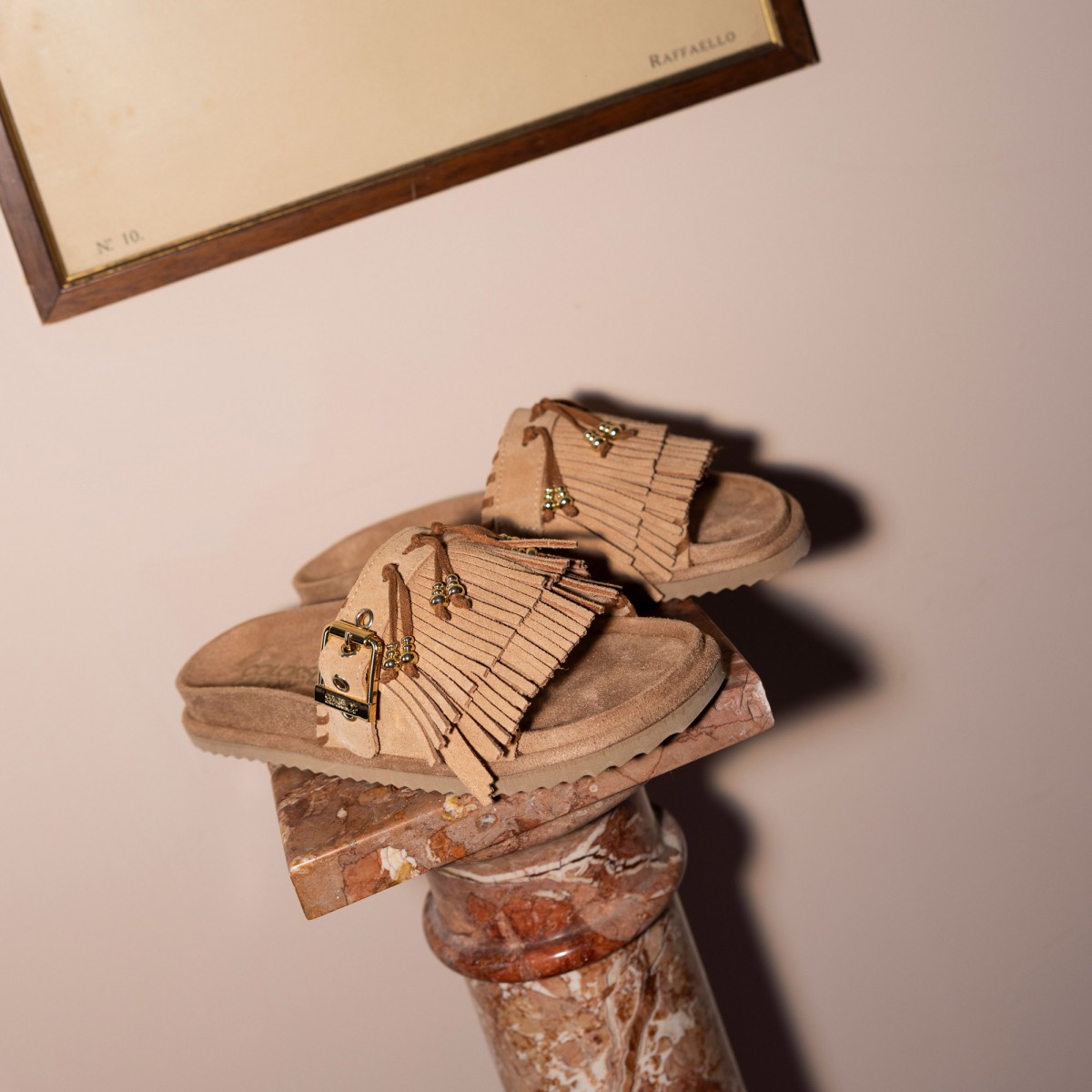 Sandalo in morbida pelle scamosciata, pensato per chi ama uno stile autentico e ricercato. La fascia è decorata da una ricca cascata di frange che dona movimento e carattere, evocando suggestioni di ispirazione navajo. La fibbia in metallo valorizza il design con un accento contemporaneo, mentre le cuciture a contrasto sottolineano la qualità originale e moderna di questo modello. Dal fascino boho-chic, è ideale per interpretare con eleganza e personalità i look estivi più modaioli.