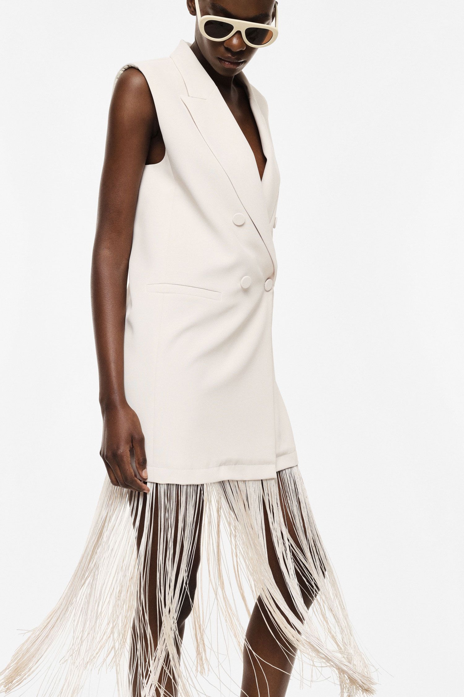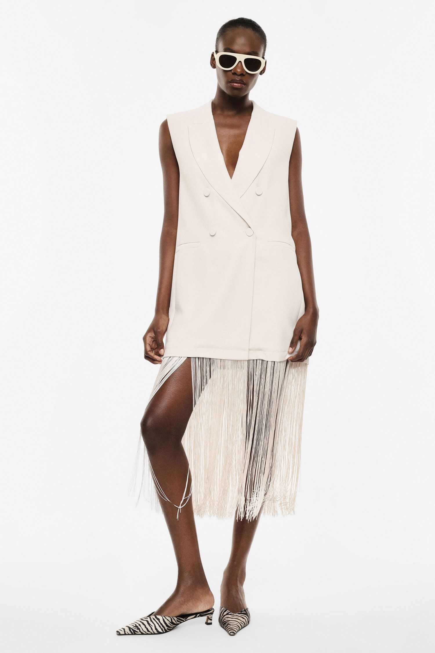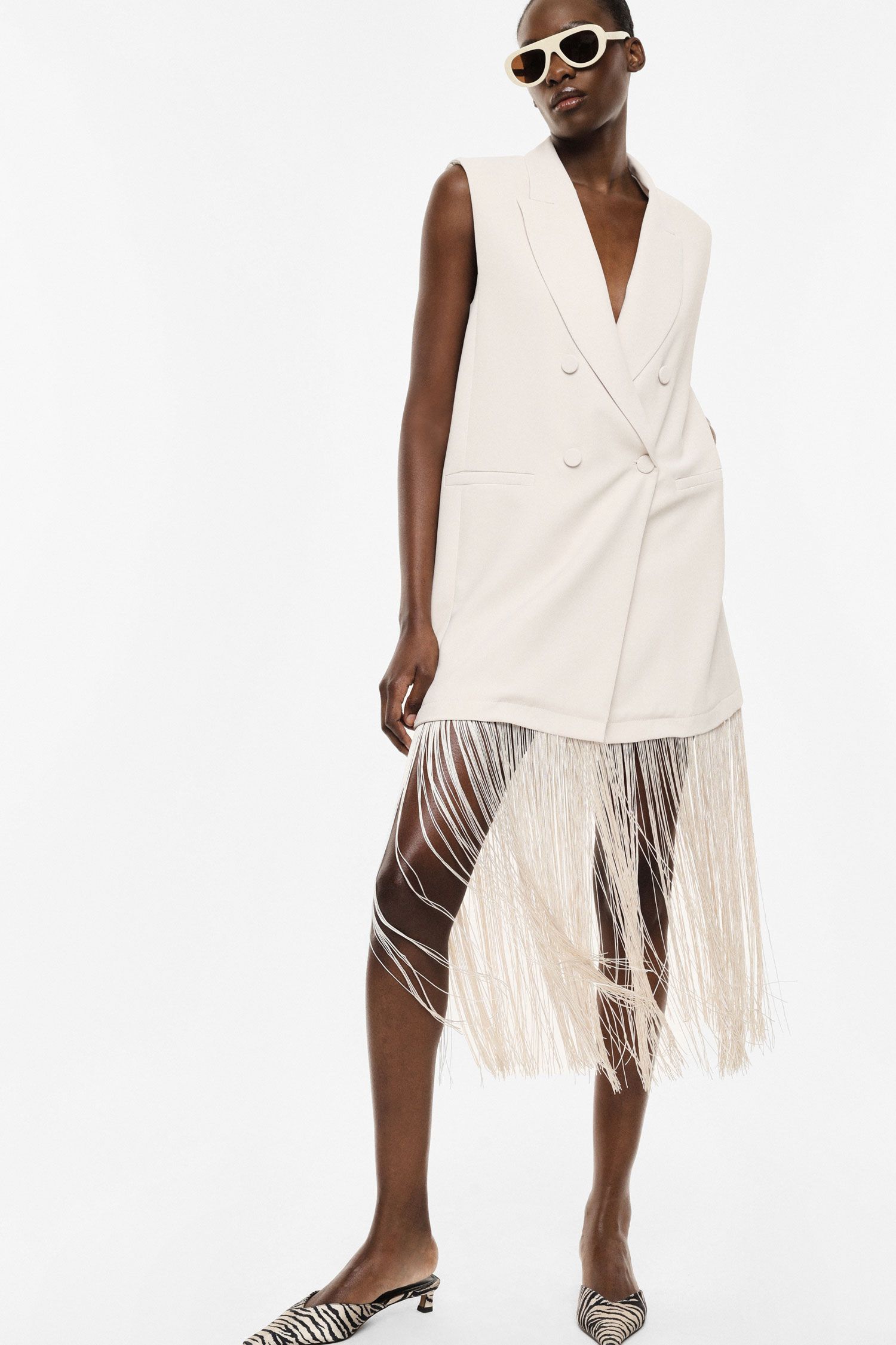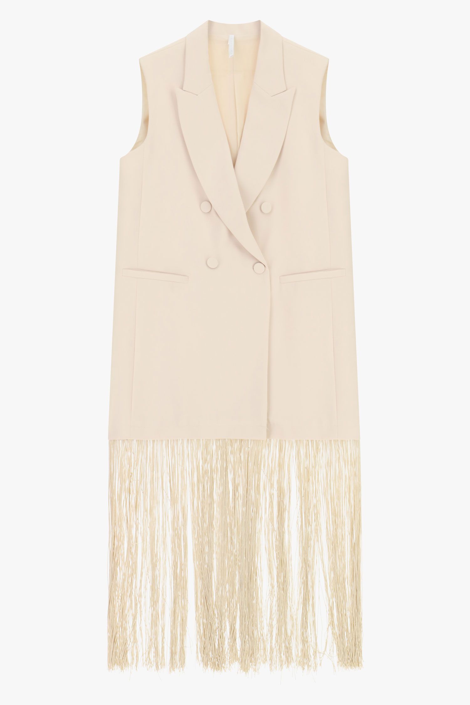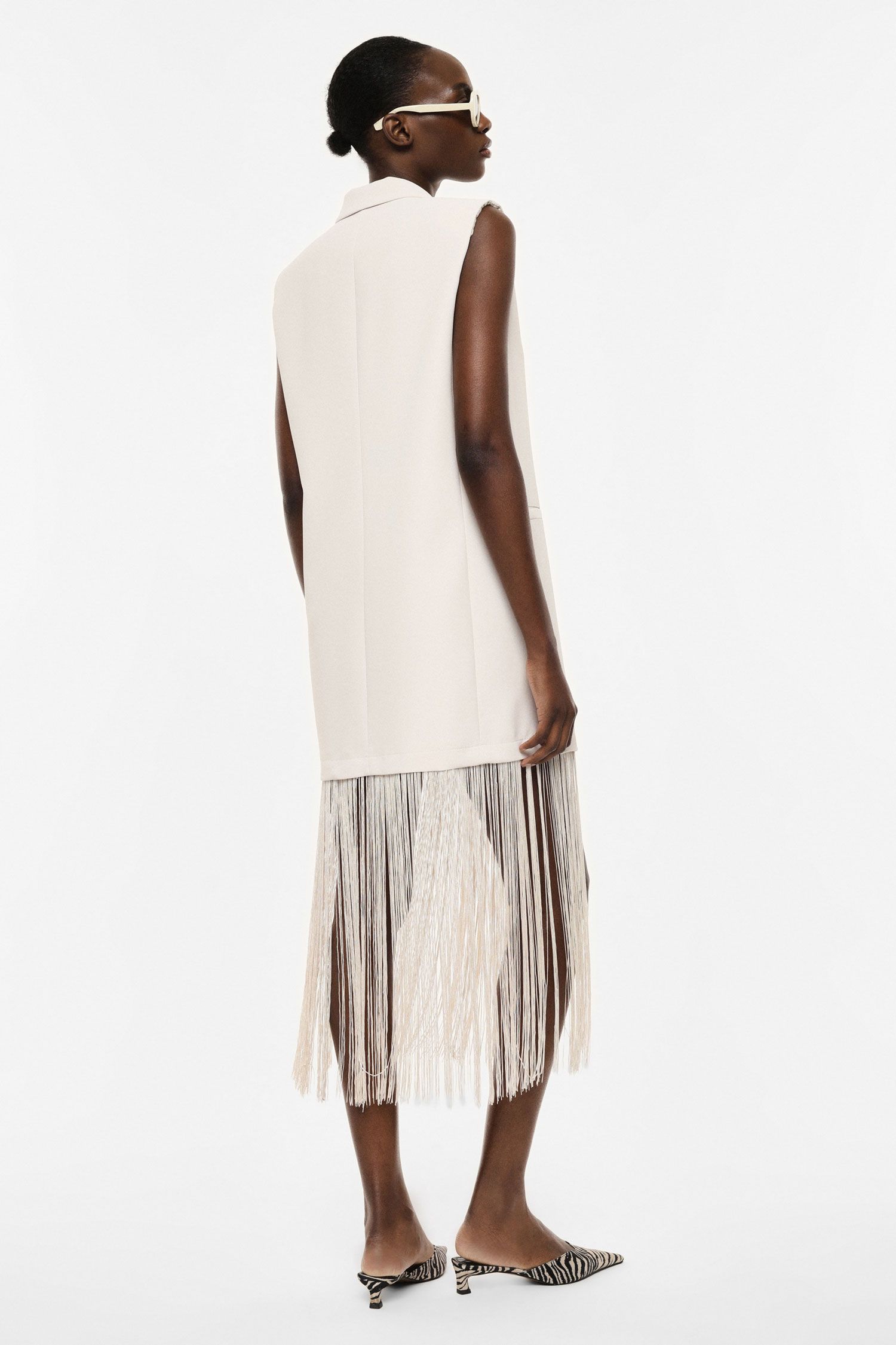 Abito lungo caratterizzato da taglio smanicato e silhouette dritta, impreziosito da doppia abbottonatura e profondo scollo a v. Linnovativo orlo con frange lunghe dona movimento e originalità. La versatilità della linea permette interpretazioni sofisticate per chi ricerca design contemporaneo ed esclusivo.