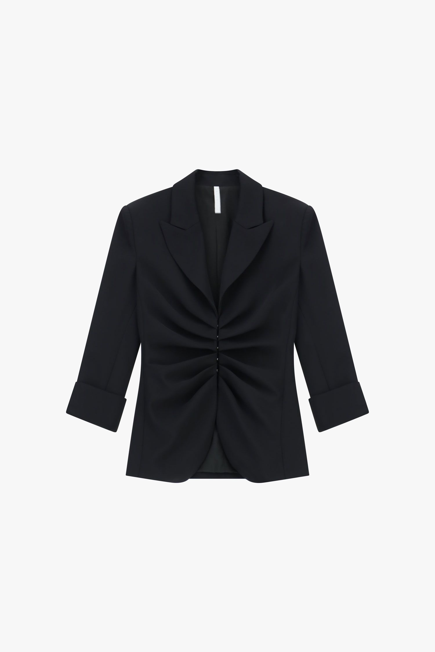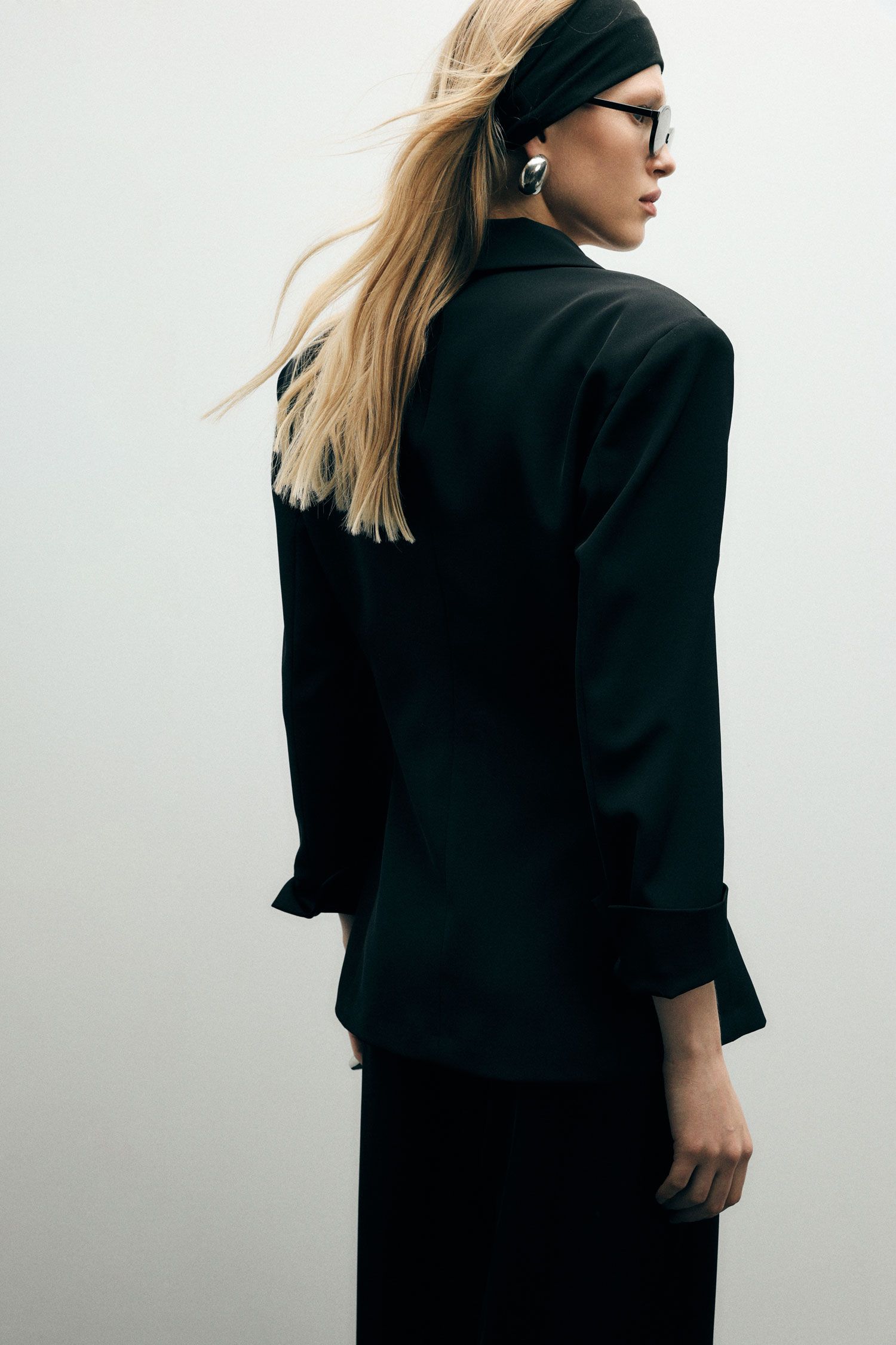 Taglio sartoriale per questo blazer dal design contemporaneo, caratterizzato da una silhouette aderente e spalle definite. L'abbottonatura frontale valorizza la linea del busto, offrendo una soluzione sofisticata per contesti formali e appuntamenti urbani. Ideale per creare look distintivi e personalizzati.