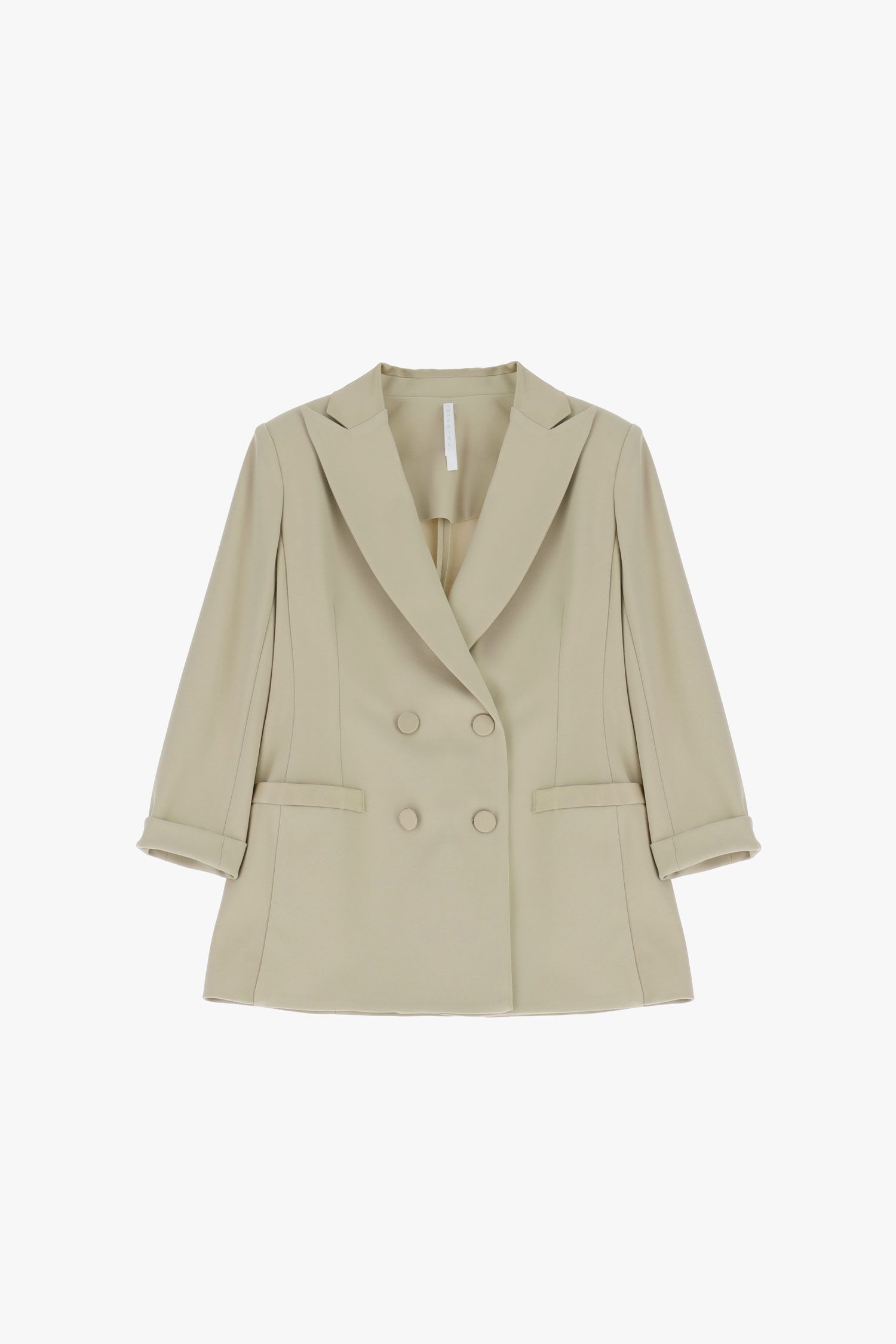 Blazer doppiopetto caratterizzato da maniche tre quarti e linee essenziali, con revers classico e tasche a filetto. Il design pulito e la chiusura frontale con bottoni tono su tono valorizzano un guardaroba attuale, adatto sia per occasioni formali sia per look da ufficio distintivi.