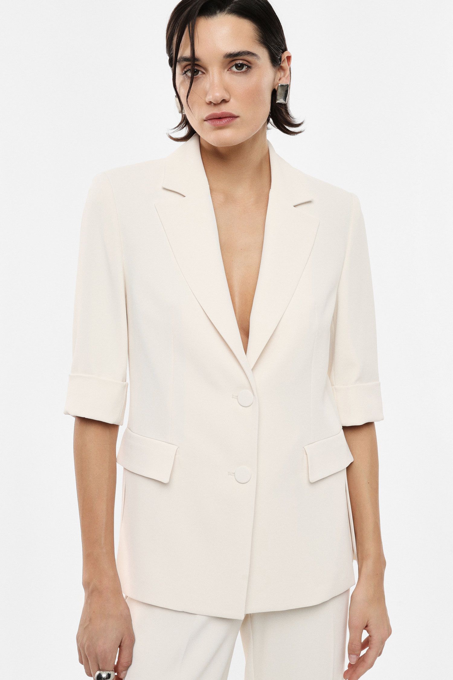 Blazer con design monopetto, caratterizzato da maniche corte con risvolto e spacchi laterali che aggiungono dinamismo alla silhouette. Le ampie tasche con patta esprimono funzionalità e attenzione ai dettagli, ideale per un guardaroba versatile e contemporaneo. Perfetto per creare molteplici abbinamenti grazie alla vasta gamma di colori proposti.