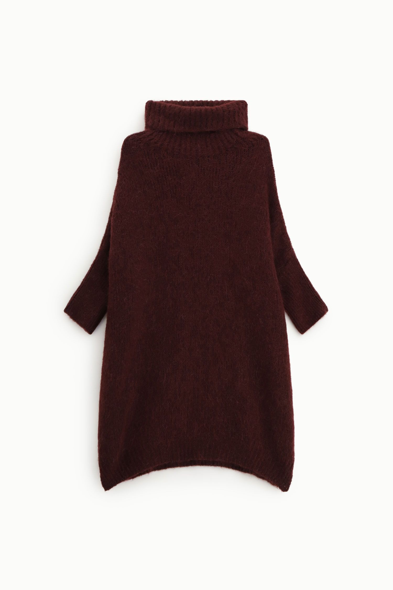 Linee avvolgenti e fit oversize distinguono questo maglione a collo alto, con maniche tre quarti e bordi rifiniti a costine. Proposto in diverse varianti di colore, offre una silhouette contemporanea che rivoluziona la maglieria tradizionale, invitando a esplorare nuove possibilità di personalizzazione del guardaroba.