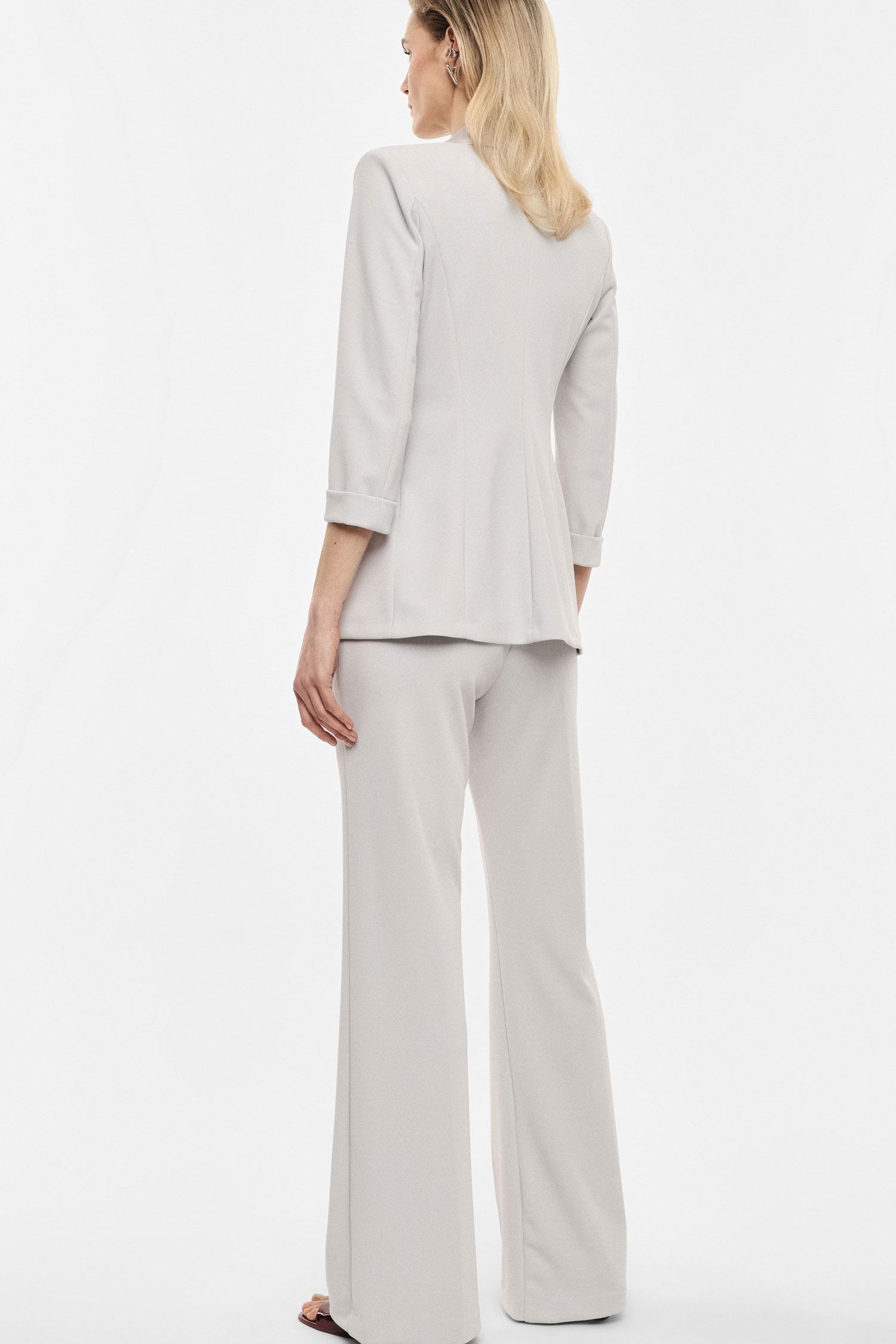 Linee allungate e struttura sartoriale per questi pantaloni flare a vita alta, arricchiti da pinces frontali e vestibilità scivolata. Il taglio valorizza la figura e offre versatilità, ideali per chi ricerca uno stile contemporaneo e sofisticato. Completa la proposta una silhouette impeccabile, perfetta per ogni occasione formale.