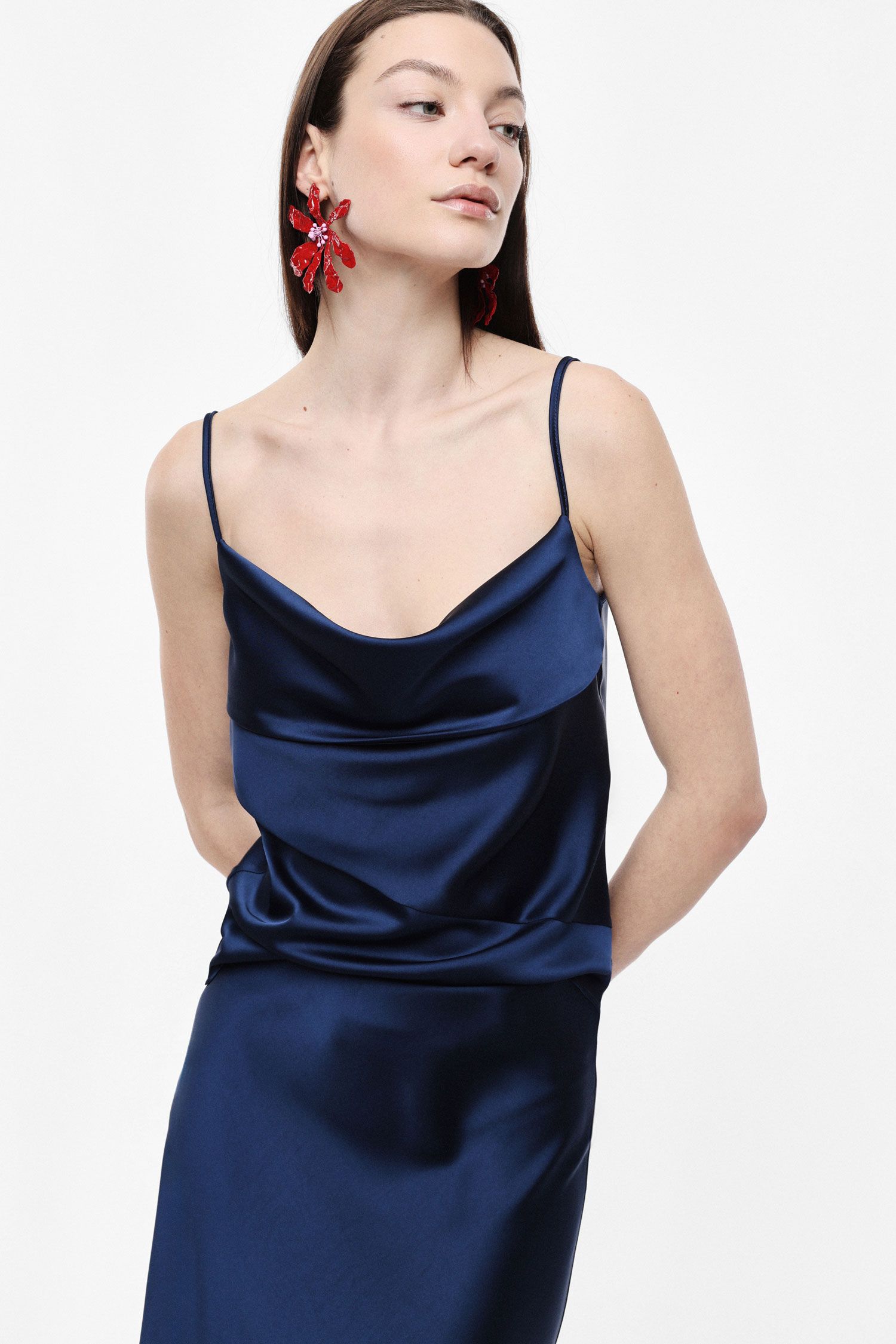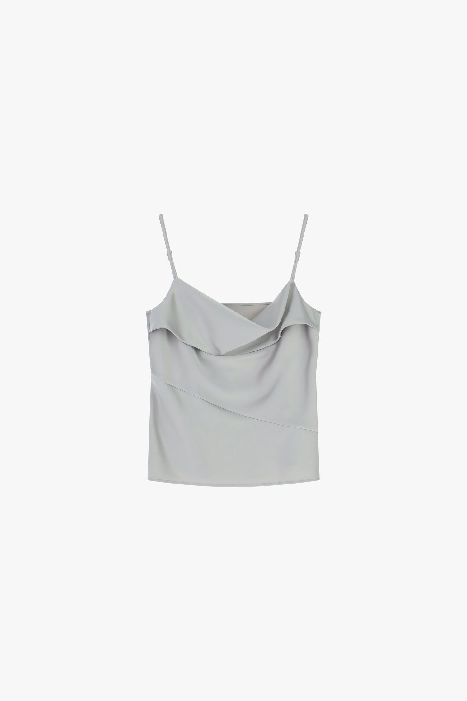 Top dal design essenziale arricchito da uno scollo a cascata che dona movimento ed eleganza. Le sottili spalline valorizzano la linearità della silhouette e rendono il capo ideale per essere abbinato a pantaloni sartoriali o gonne, offrendo infinite possibilità creative per comporre look urbani sofisticati.