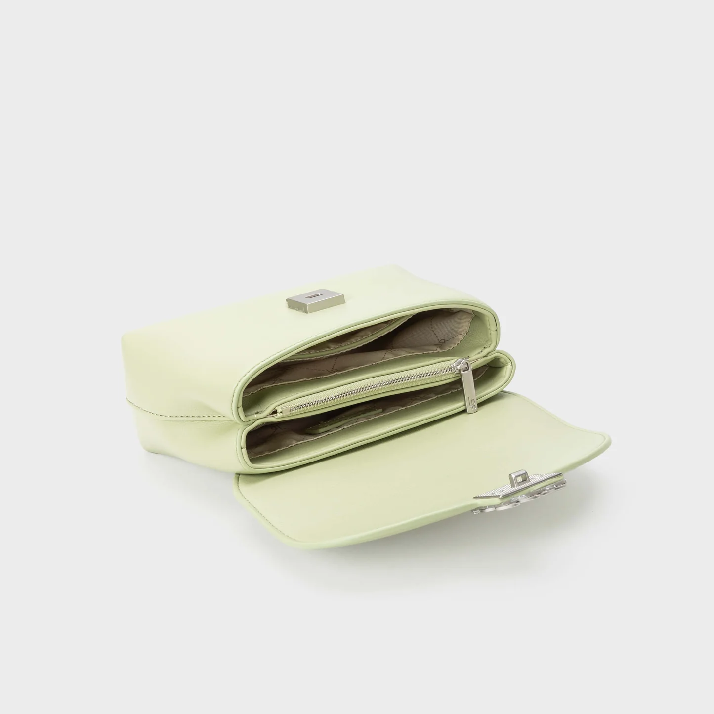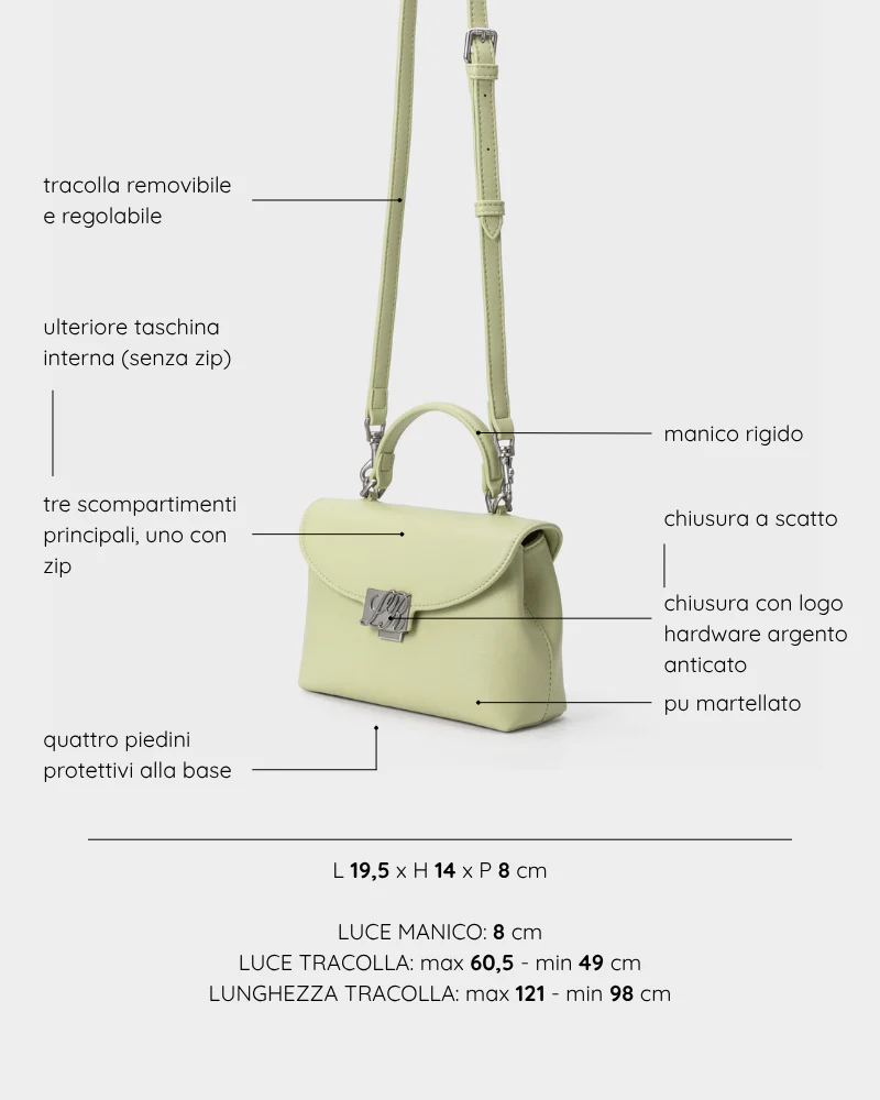 La borsa LESLIE ha un design elegante e sofisticato. Realizzata in pu martellato, ha una forma strutturata e compatta con un manico superiore rigido e una tracolla removibile e regolabile in lunghezza. La chiusura frontale è arricchita dal logo in metallo argentato, che aggiunge un tocco di lusso. All'interno sono presenti tre scompartimenti principali, di cui uno con zip. Alla base sono presenti quattro piedini che danno stabilità alla borsa.
