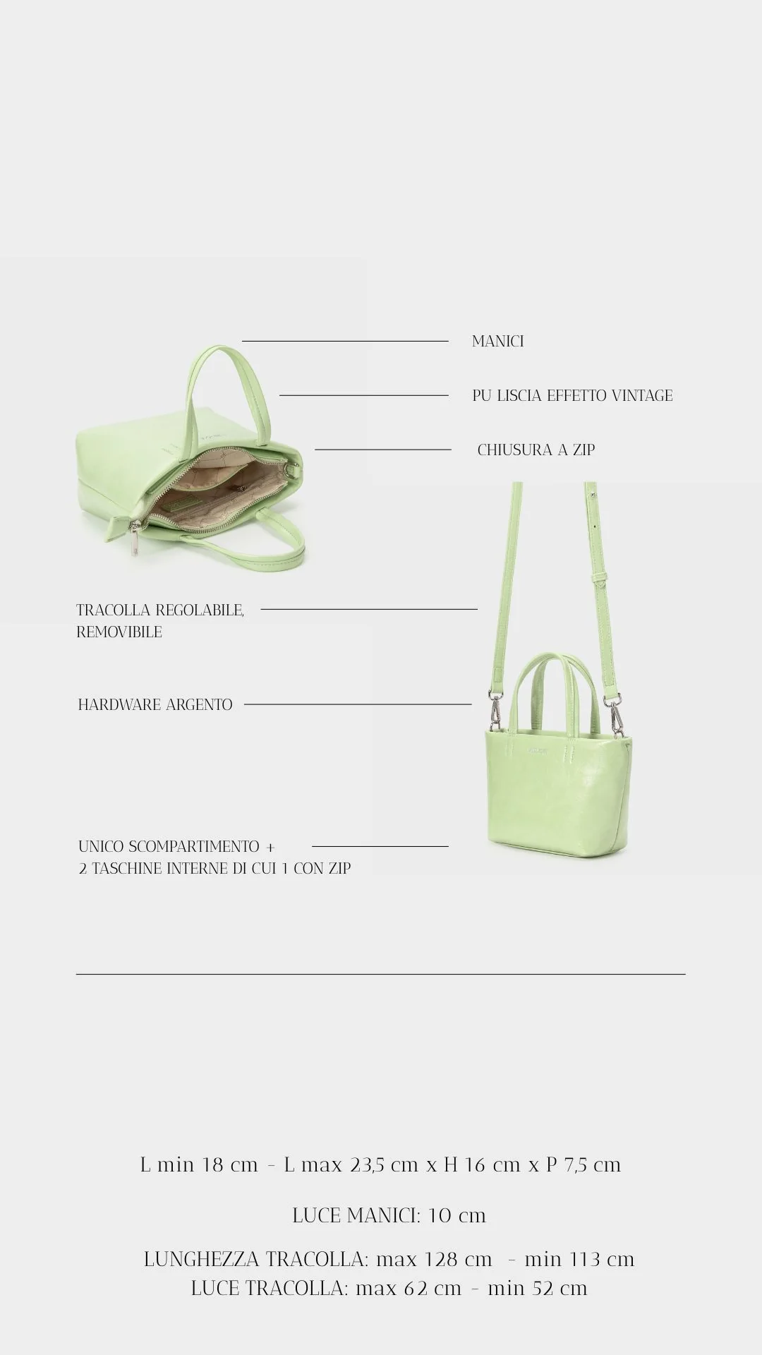 Dal fascino retrò e dalla praticità moderna, la borsa Nina è realizzata in PU con effetto vintage, perfetta per uno stile senza tempo. Dotata di manici e tracolla, può essere indossata a mano o crossbody, grazie ai moschettoni a scomparsa. Il logo in stampatello sulla parte frontale le dona un carattere deciso.