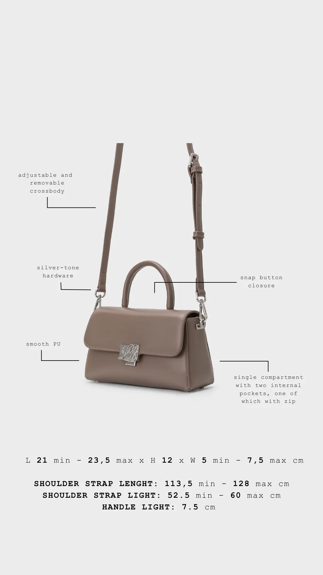 Scopri la nuova borsa Renee, elegante e funzionale. Realizzata in PU liscio con impunture tono su tono, questa borsa offre una chiusura a scatto interna e un pratico scomparto centrale, dotato di due tasche, una con e una senza zip, per tenere tutto in ordine. La tracolla è removibile e regolabile, per adattarsi al tuo stile e alle tue esigenze. Il logo frontale in corsivo aggiunge un tocco sofisticato. Perfetta per ogni occasione!