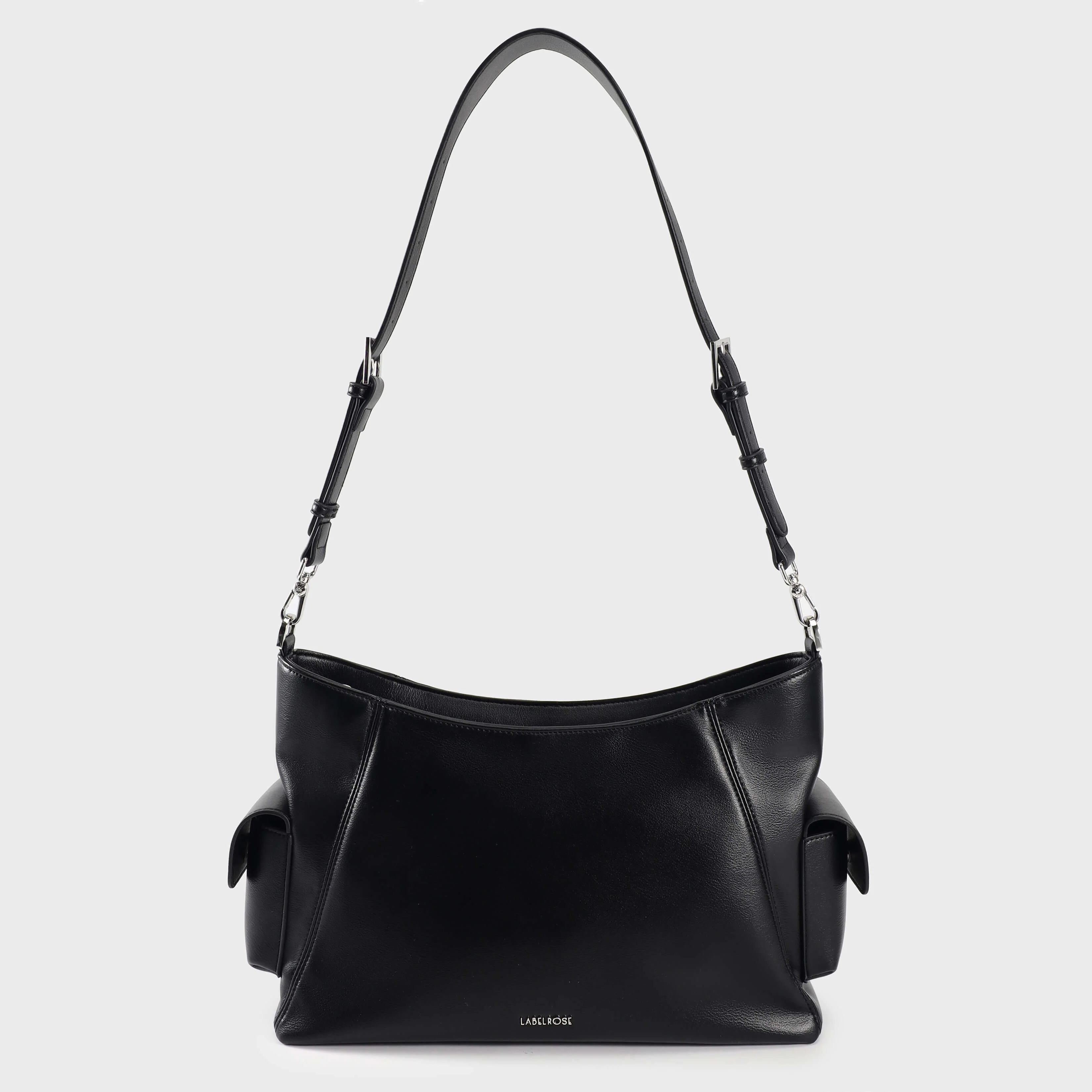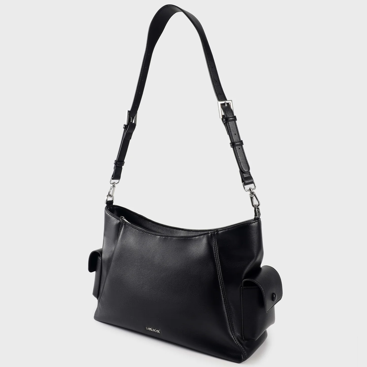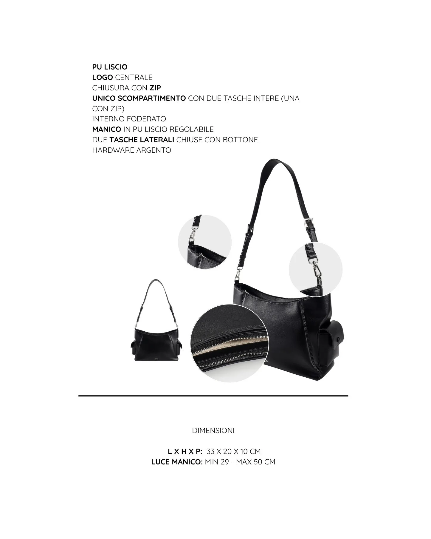 Le due tasche laterali con chiusura a bottone aggiungono funzionalità extra, ideali per tenere a portata di mano piccoli oggetti come chiavi o cellulare. Il manico a spalla regolabile, che si trasforma facilmente in una tracolla, offre versatilità e comfort, permettendoti di portarla come preferisci.