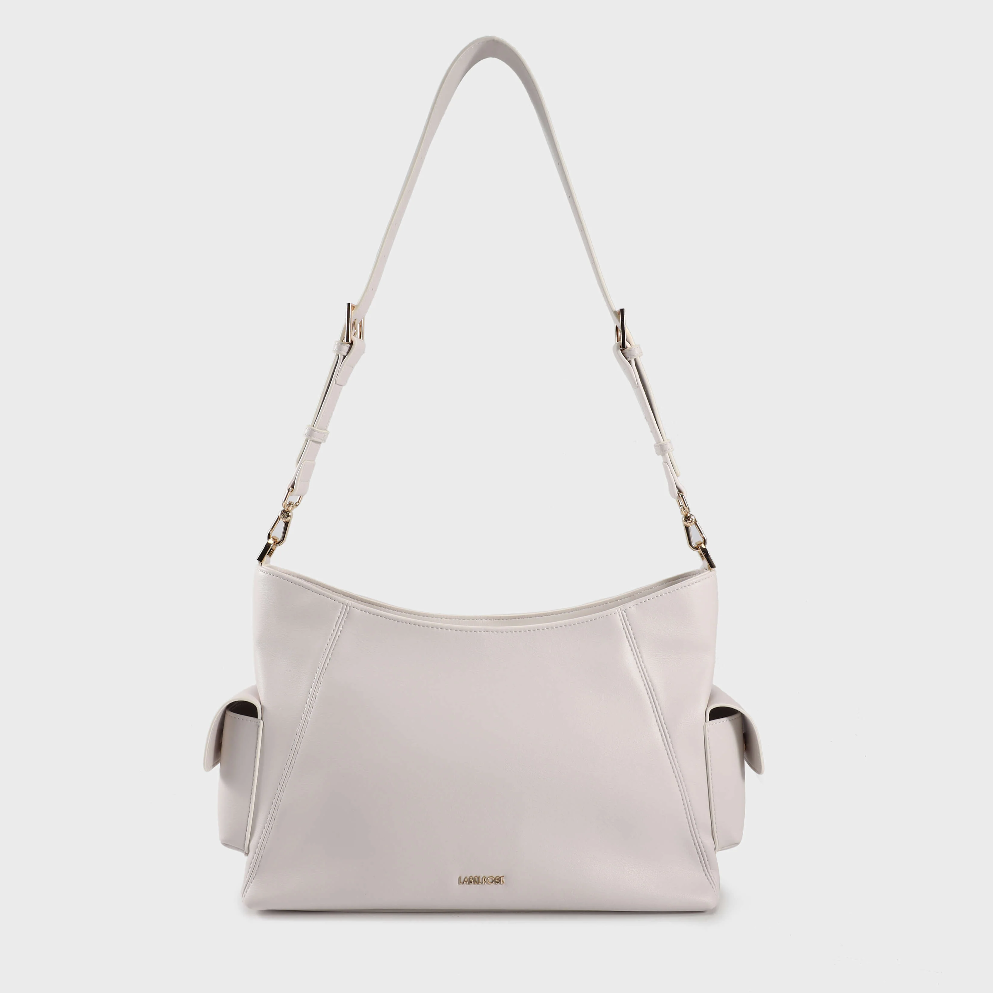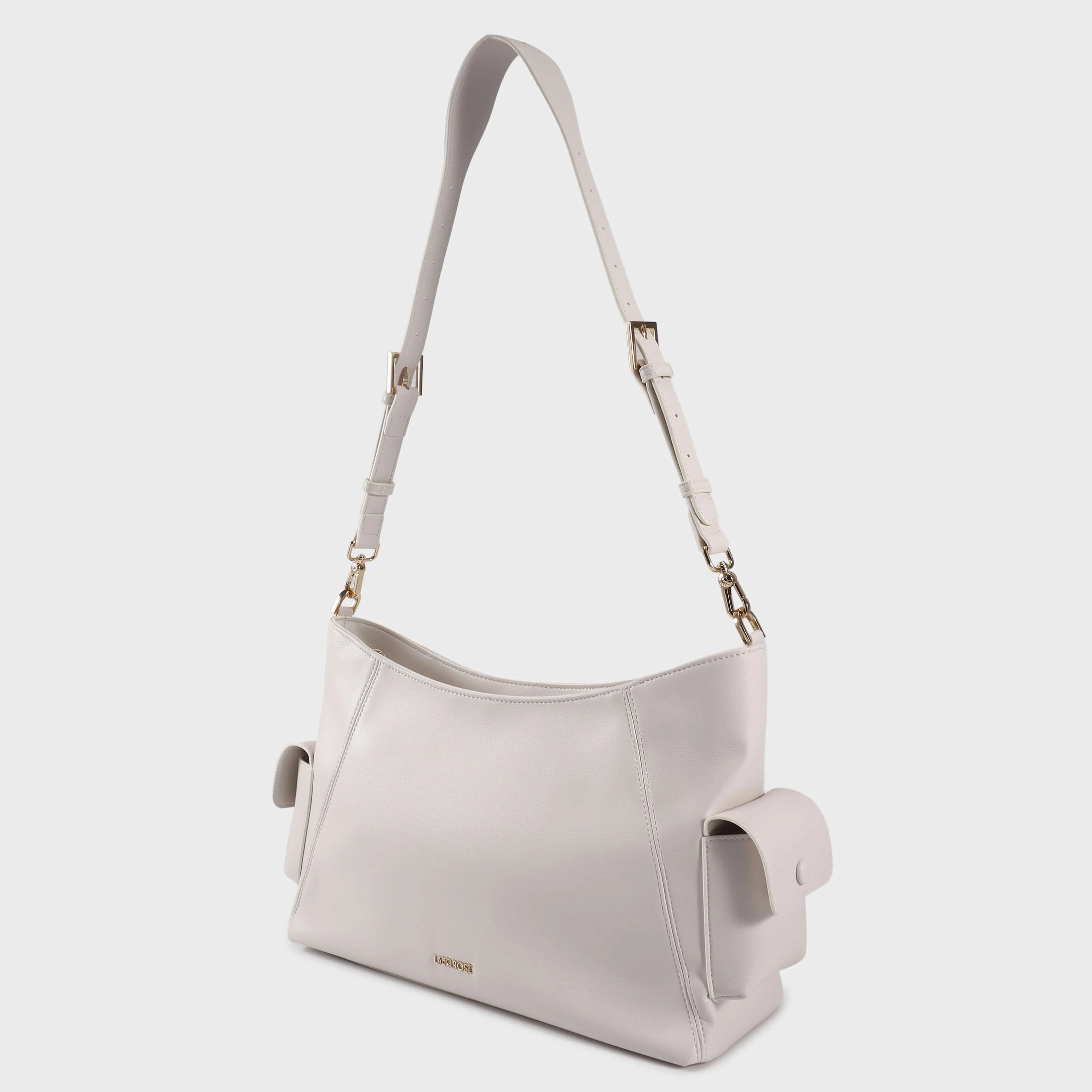 Le due tasche laterali con chiusura a bottone aggiungono funzionalità extra, ideali per tenere a portata di mano piccoli oggetti come chiavi o cellulare. Il manico a spalla regolabile, che si trasforma facilmente in una tracolla, offre versatilità e comfort, permettendoti di portarla come preferisci.