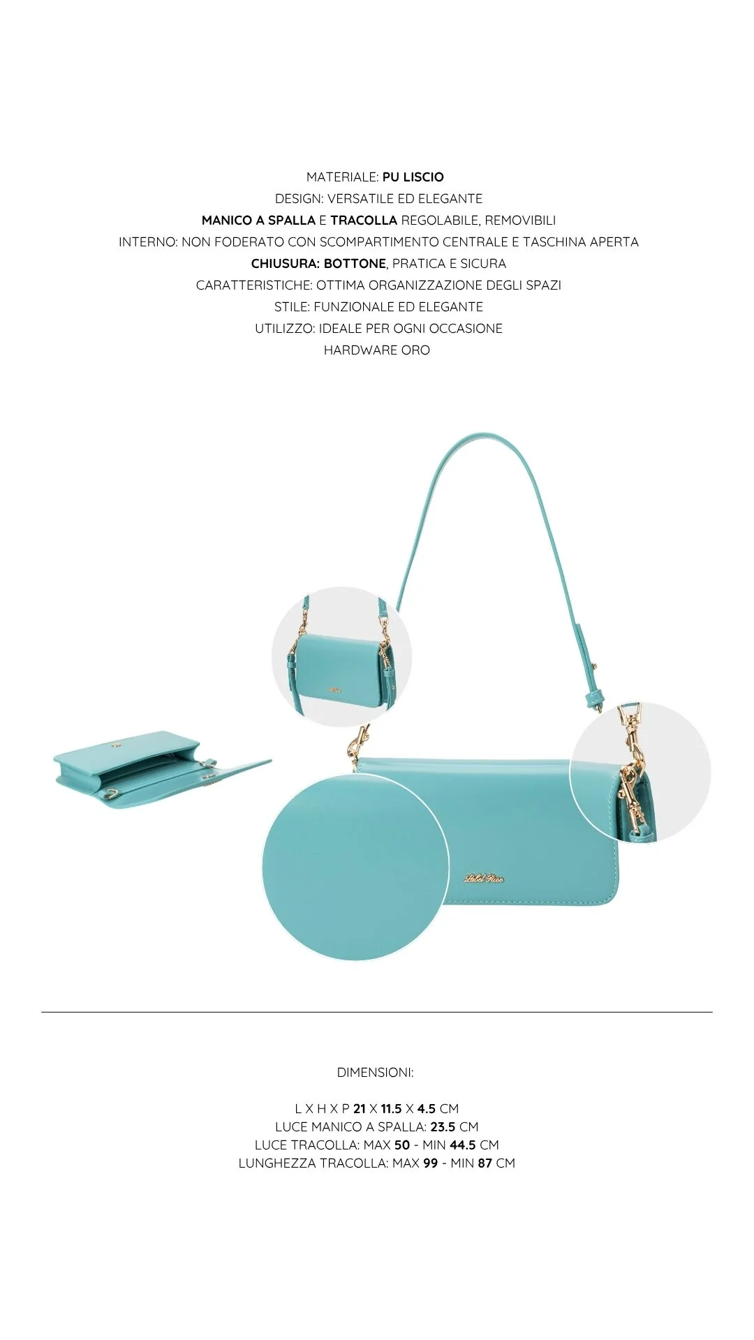 La Borsa Nicole è realizzata in PU liscio di alta qualità, caratterizzata da un design versatile con doppio manico: uno per portarla a spalla e laltro per indossarla come tracolla. Linterno non foderato è dotato di una tasca centrale e una taschina aperta per una migliore organizzazione. La chiusura, pratica e sicura, è garantita da un bottoncino. Un accessorio che unisce eleganza e funzionalità, ideale per ogni occasione.
