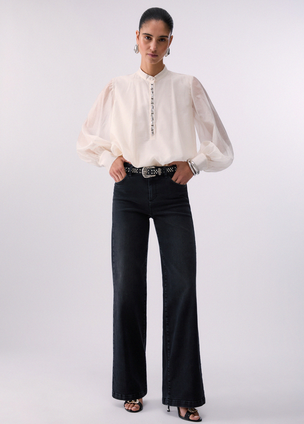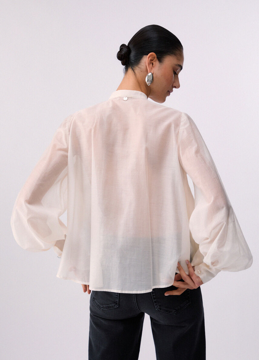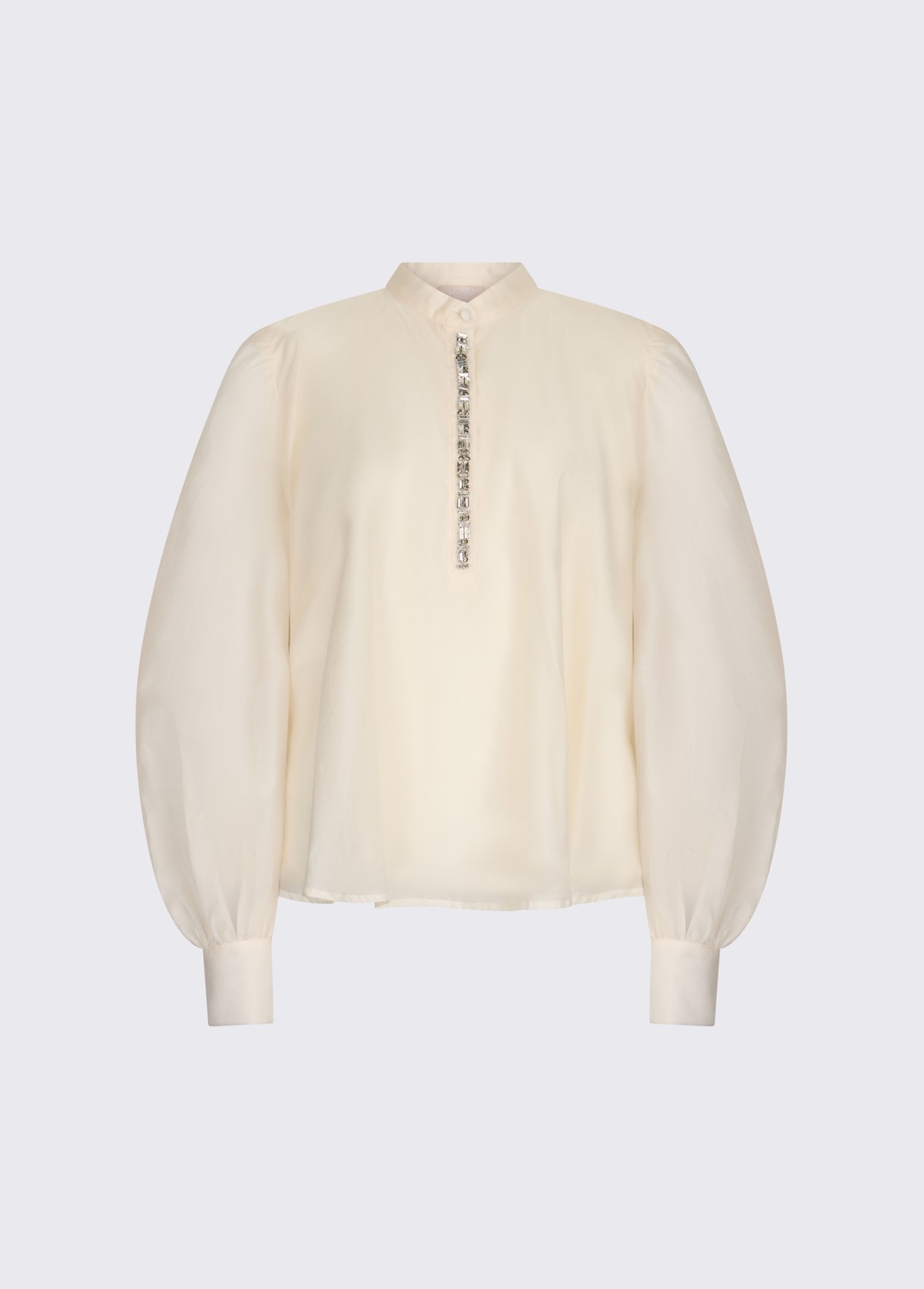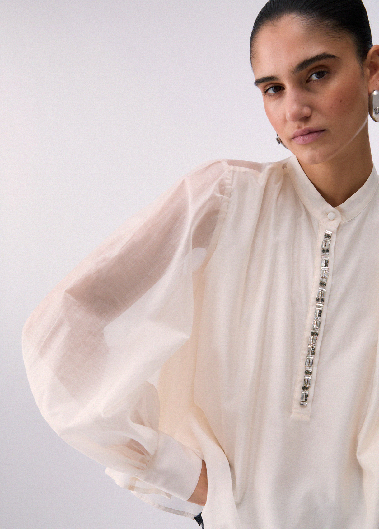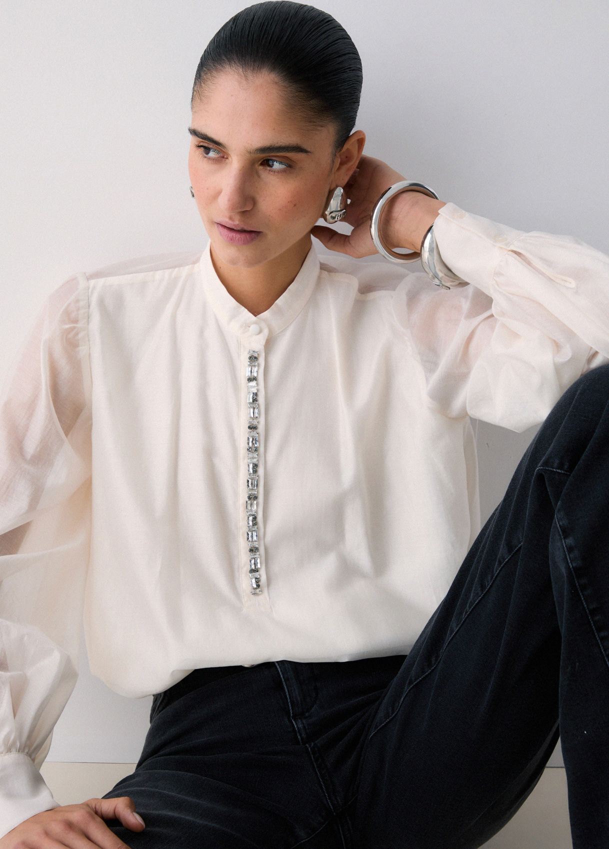 Leggera come uno soffio, luminosa come un gioiello. Questa blusa in mussola scivola morbida sulla pelle, con maniche dai volumi bold e un colletto rigoroso che si accende di ricami gioiello. Perfetta con pantaloni sartoriali, irresistibile con i denim per un contrasto più cool.