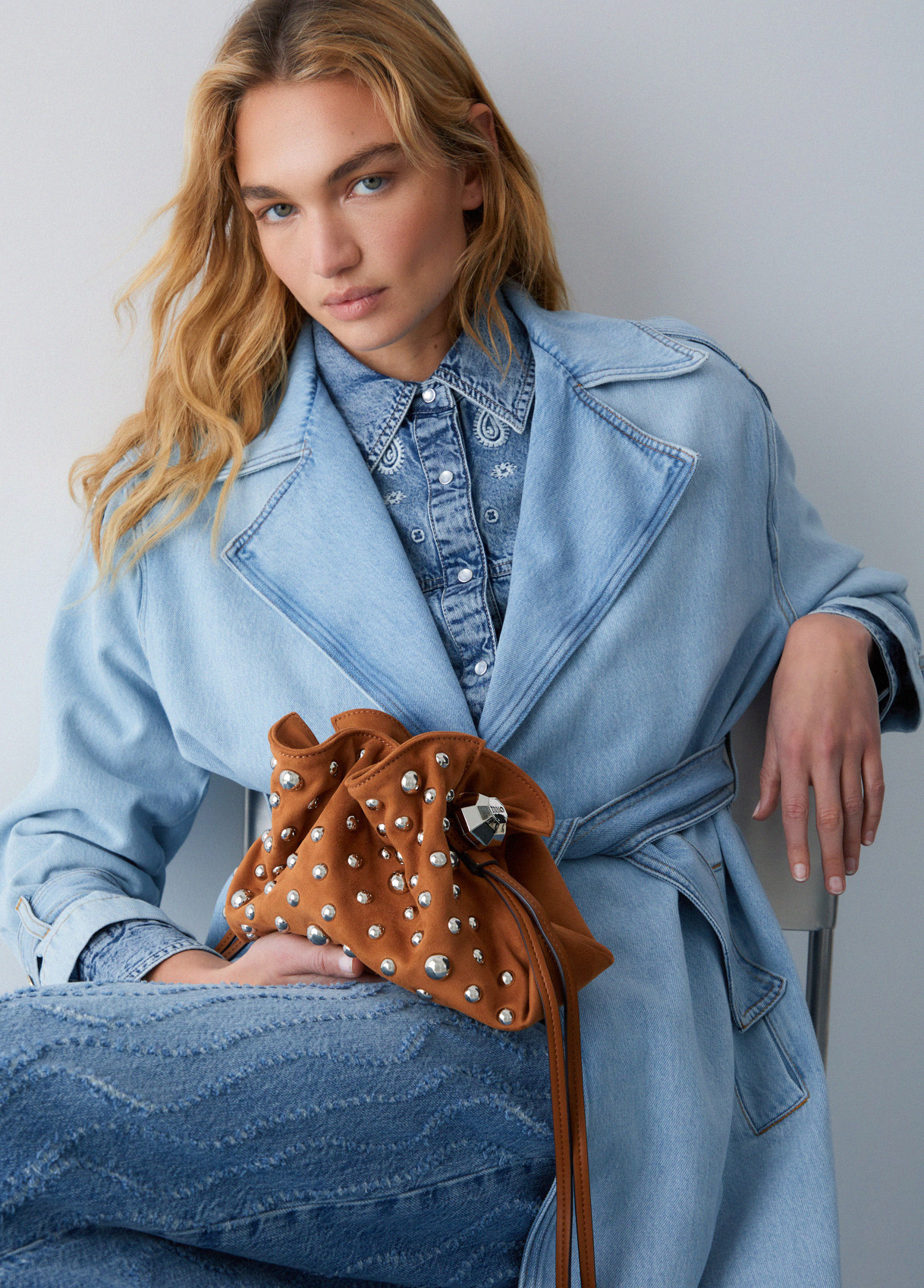 La Riccy Bag aggiunge una nuova dimensione al suo carattere grazie alla superfice morbida, vellutata, tattile. Il volume fluido si stringe nella coulisse, mentre le borchie creano un ritmo metallico che vibra sulla texture soffice.