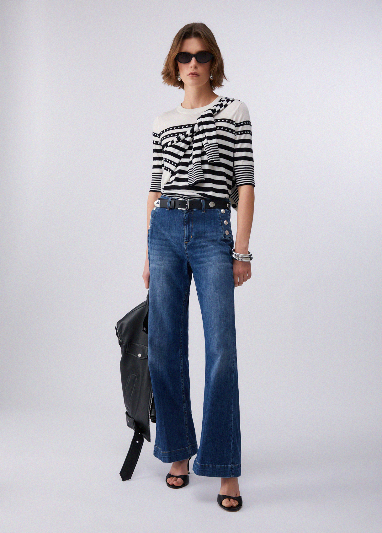 Vita alta e taglio flare: questi jeans sanno come conquistare la scena grazie all'ispirazione marinière dei bottoni gold-touch. Sceglili al prossimo aperitivo con le amiche, con un morbido pullover e un velo di mascara.