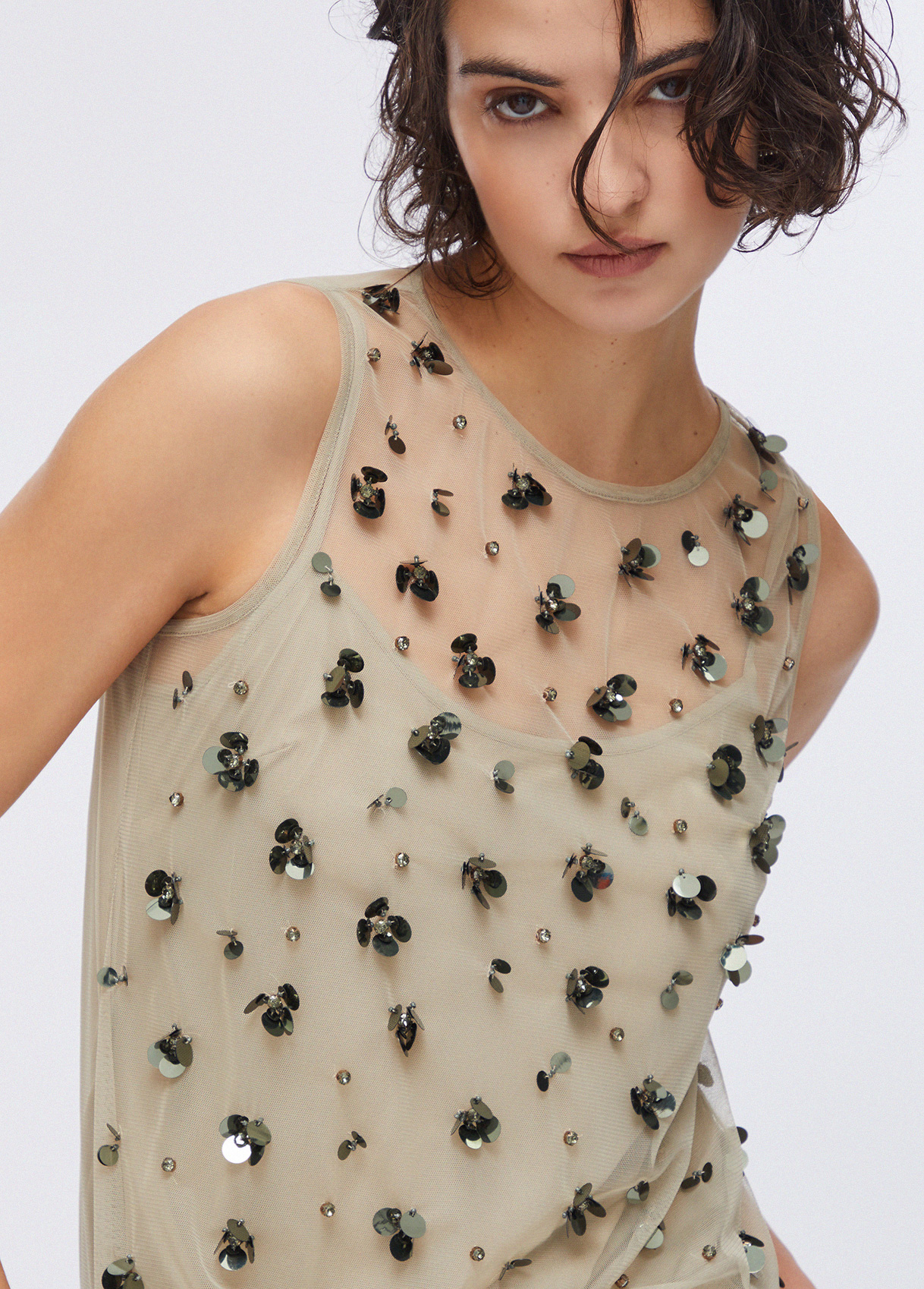 Tessuto principale: 100% Poliestere| RICAMI E DECORAZIONI: 43% PVC per uso tessile (Cloruro di polivinile), 32% Vetro, 15% Bronzo, 10% Acrilica