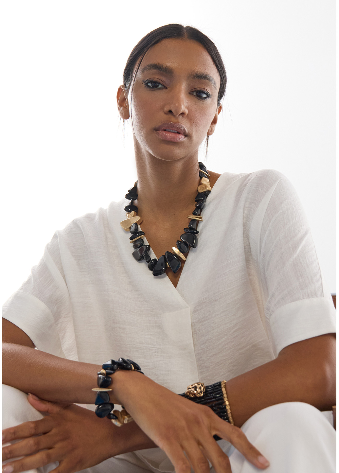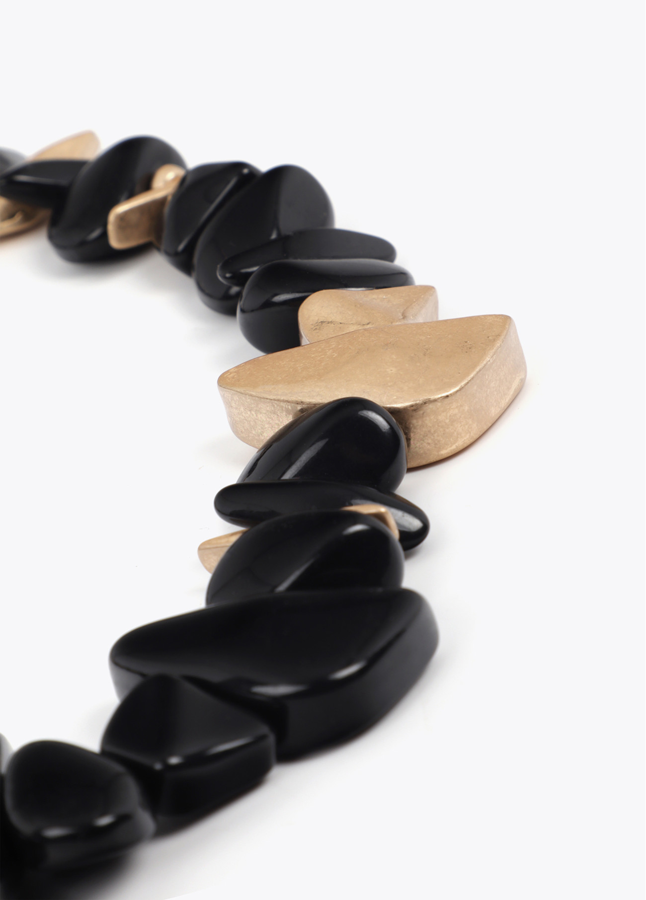 Elegante collana composta da pezzi acrilici neri ed elementi metallici in tono oro. Design versatile e contemporaneo. Chiusura regolabile per un uso confortevole. Perfetto per aggiungere un tocco sofisticato a qualsiasi outfit.