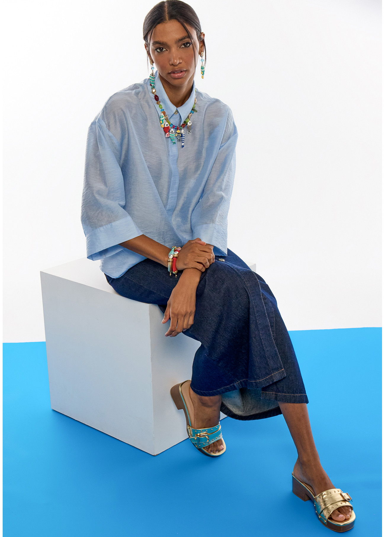 Collana vibrante con cristalli multicolori e affascinanti charms di pesce, perfetta per aggiungere un tocco di colore a qualsiasi look. Chiusura regolabile e dettagli in oro.