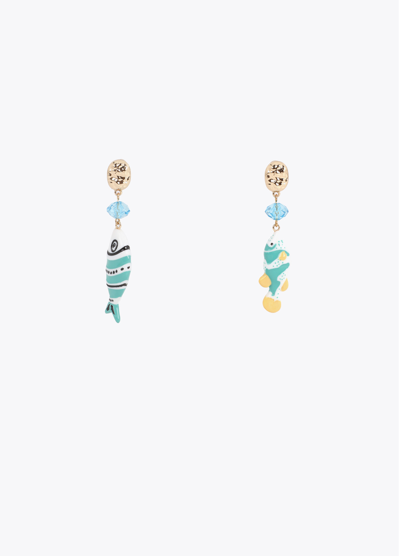 Orecchini accattivanti con design irregolare e pesce in tonalità multicolore. Realizzato in metallo oro con perline di cristallo blu. Chiusura sicura del dado.