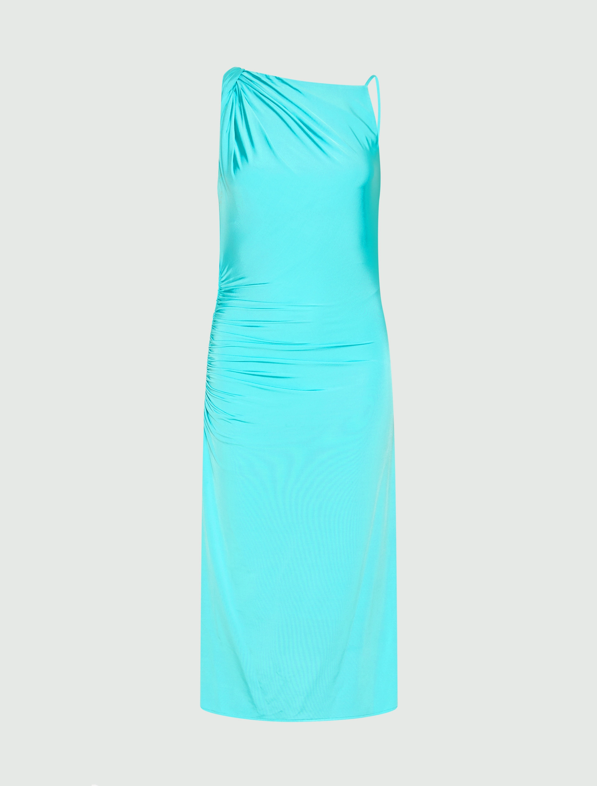 Abbraccia il busto e mette in evidenza la silhouette questo abito in jersey stretch con arricci lungo il fianco sinistro. La spallina con torchon aggiunge una nota dinamica, per un capo da indossare day to night.