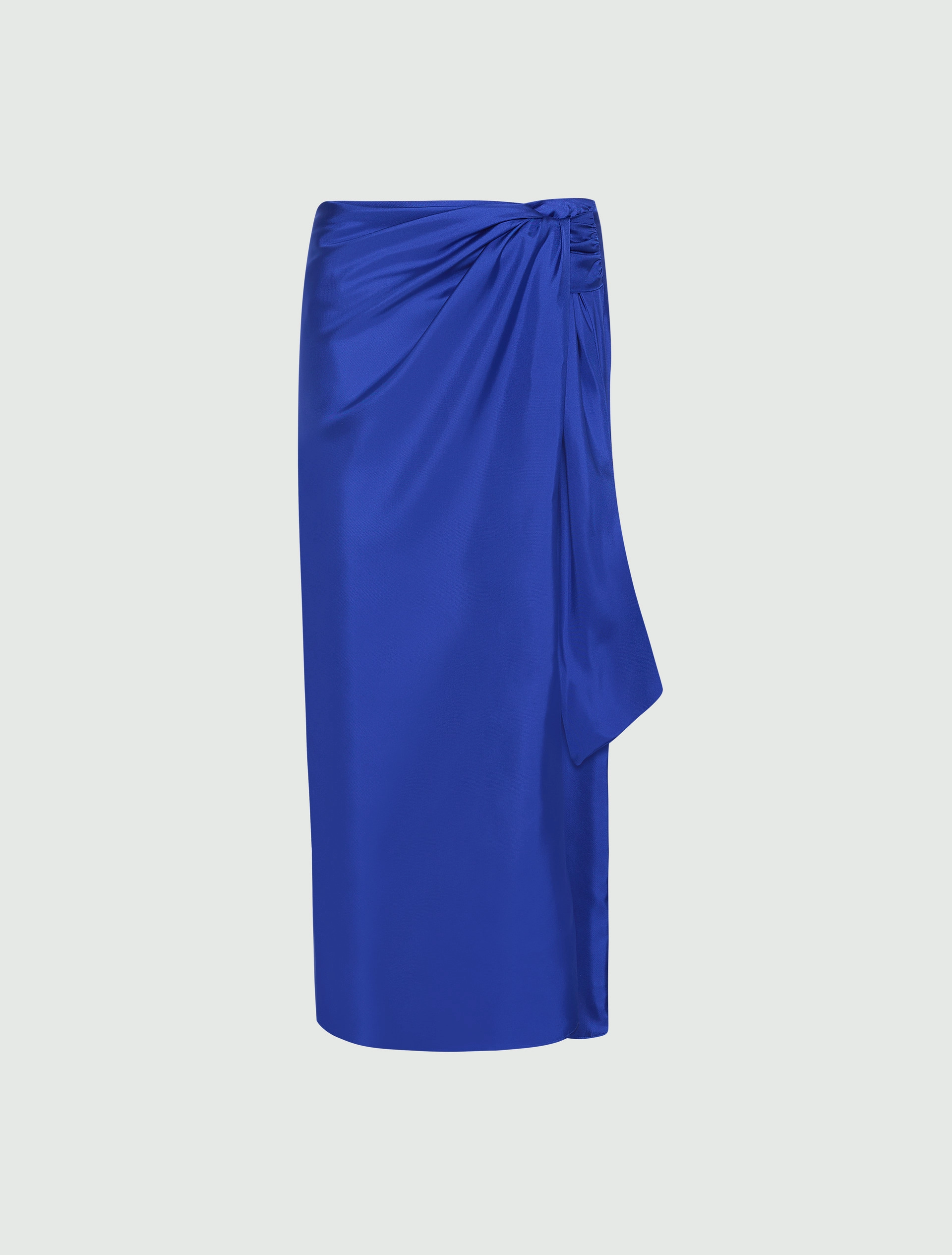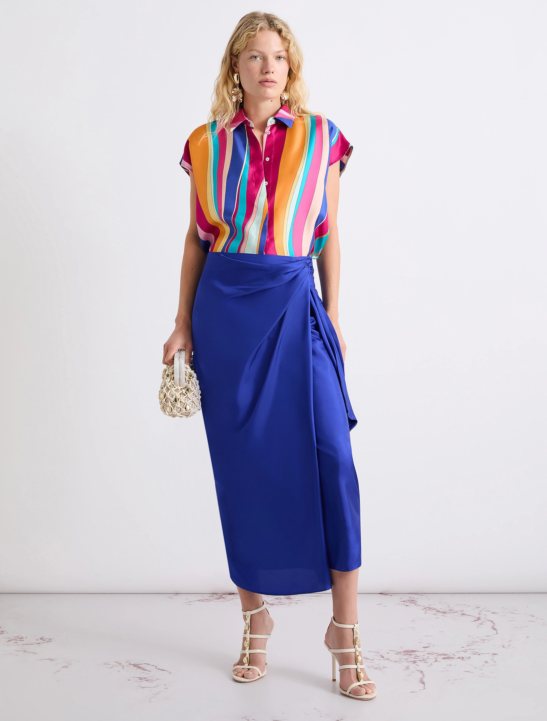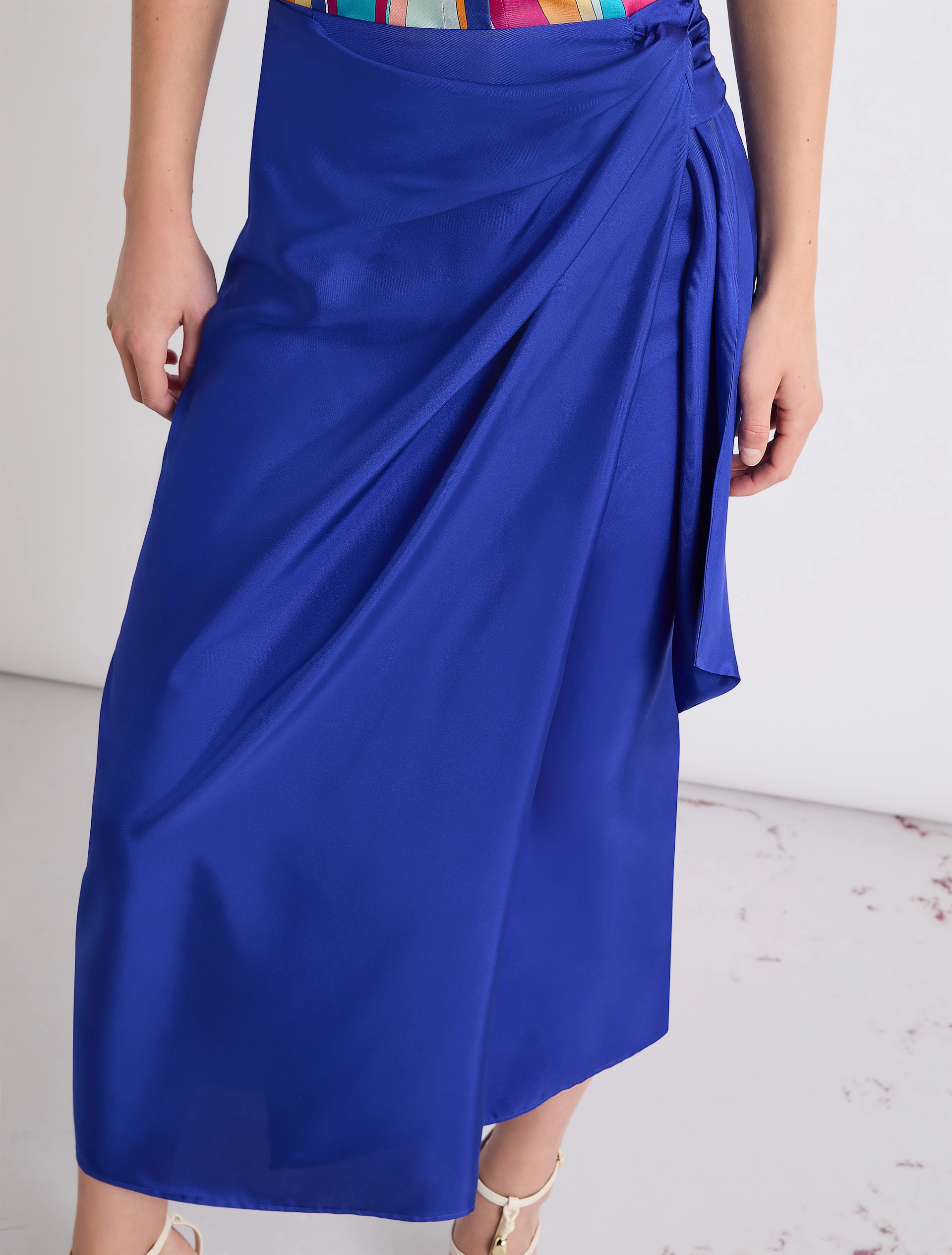 Annodata lateralmente come un elegante pareo, questa gonna aggiunge una nota luminosa ai tuoi outfit estivi. Il twill di seta è morbido e brillante, perfetto da abbinare a stampe e colori decisi.