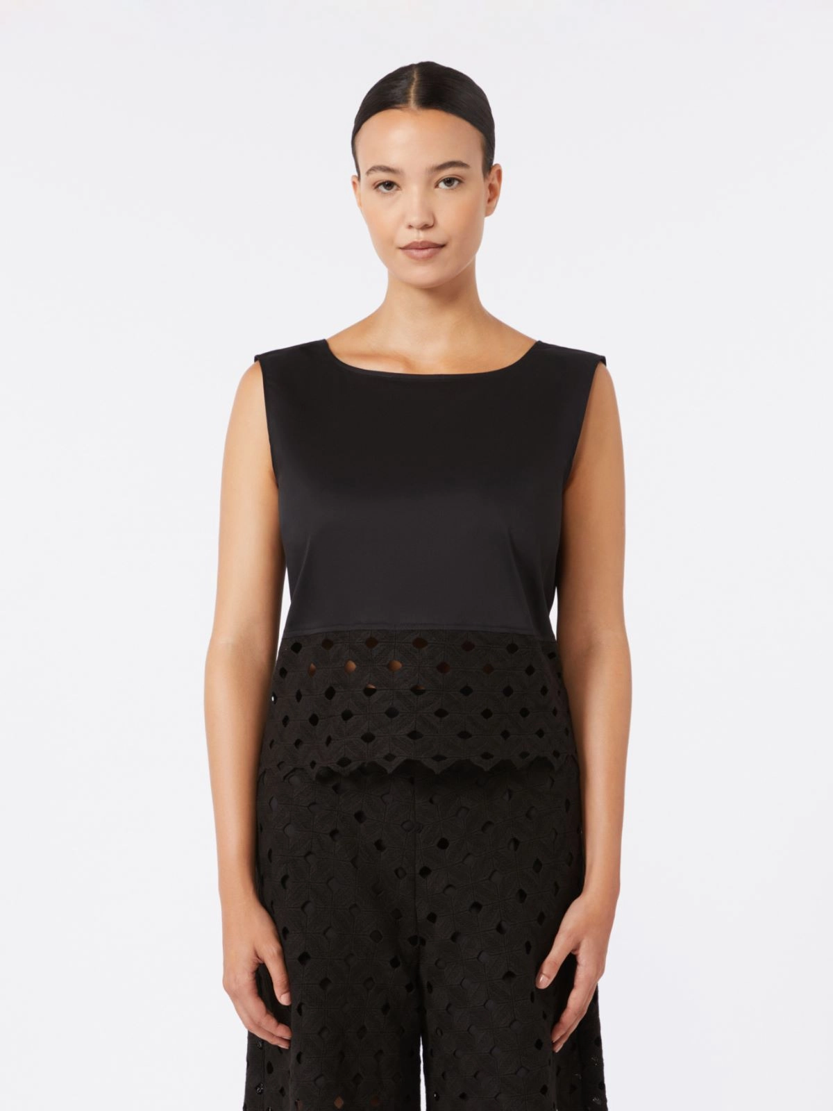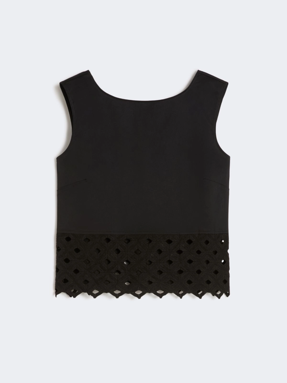 Top crop smanicato, impreziosito sul fondo da banda in pizzo macramè geometrico.