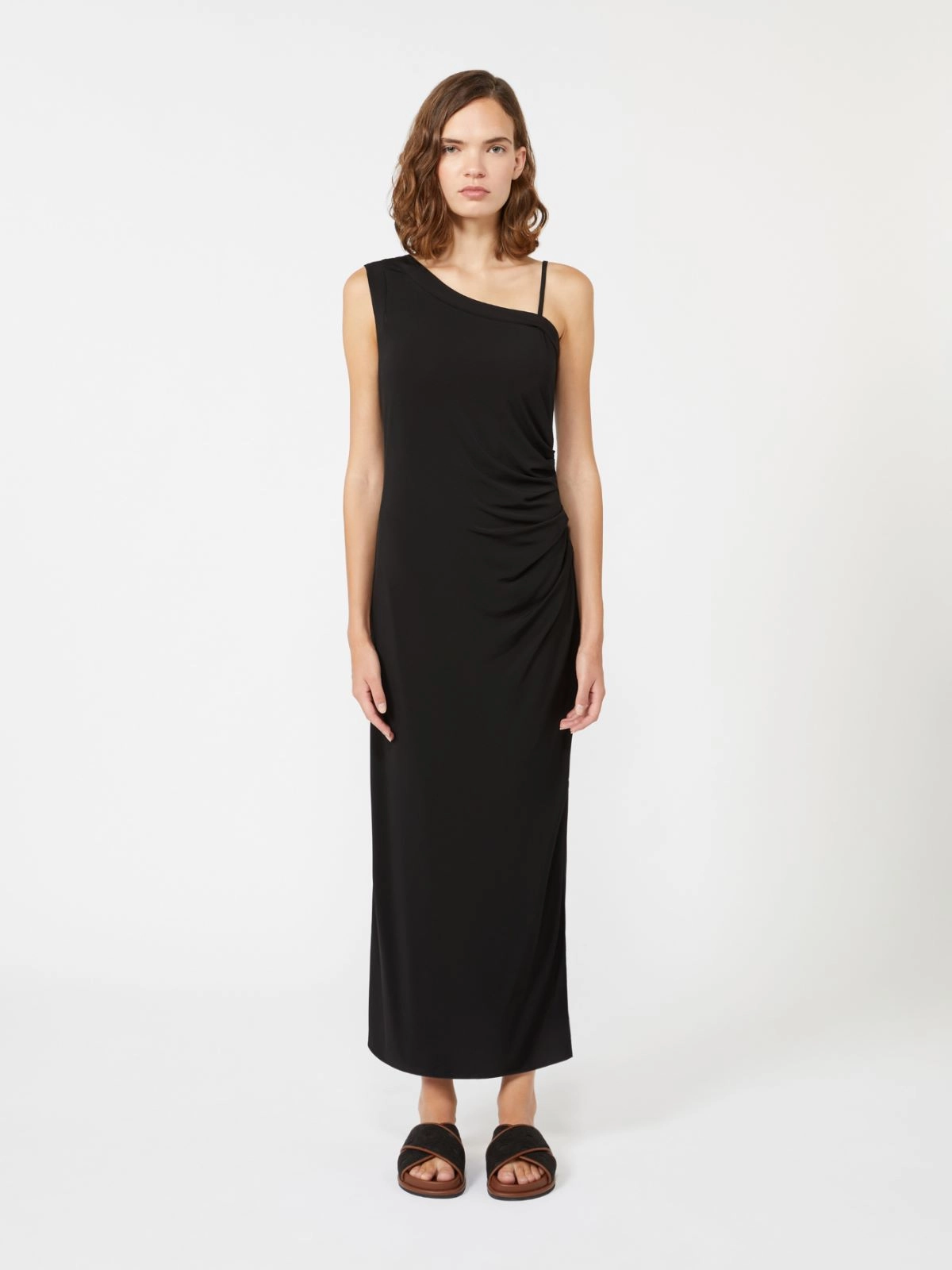 Abito longuette monospalla, caratterizzato da una silhouette aderente con motivo arricciato sul fianco sinistro.