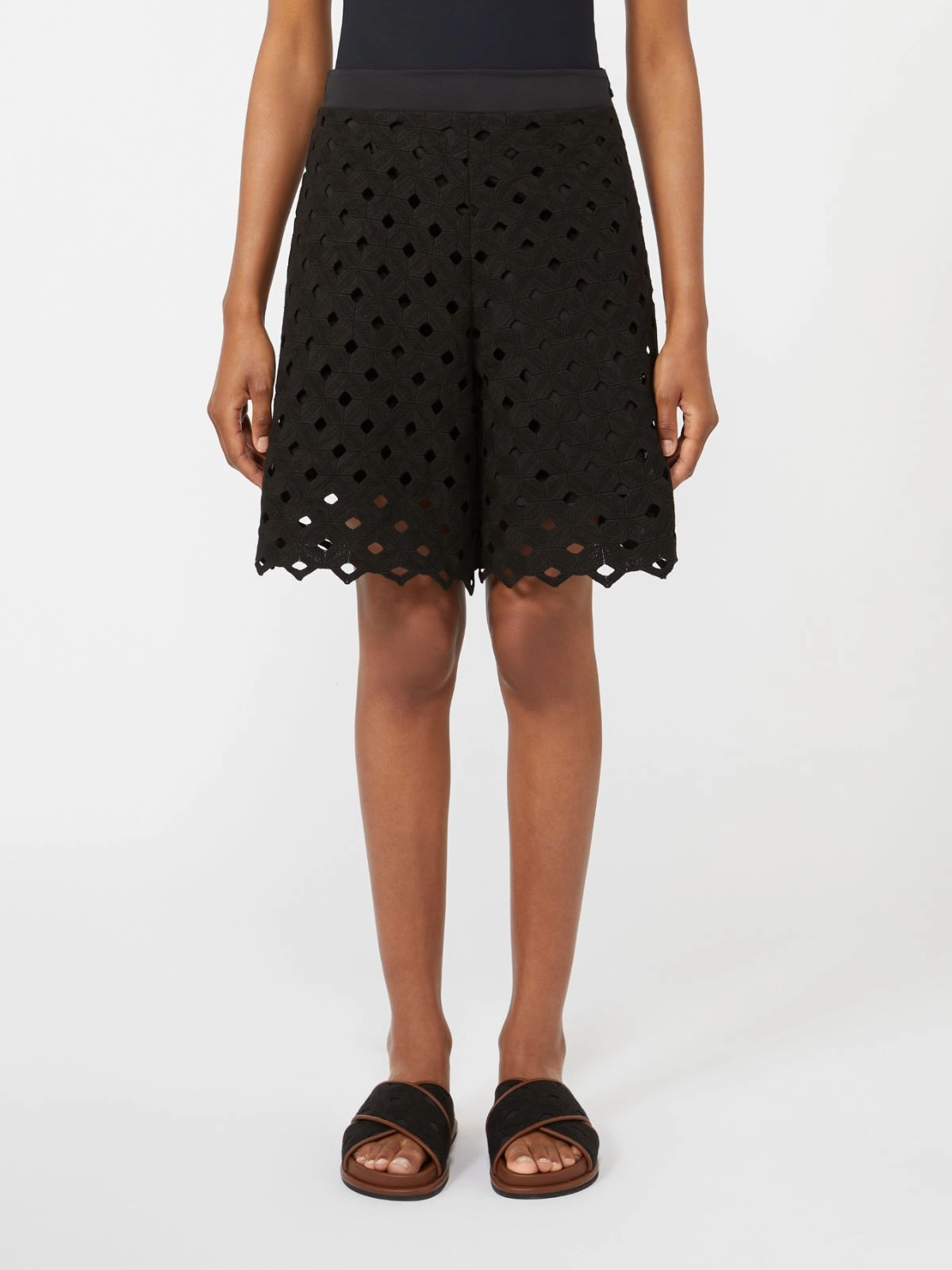 Pantalone bermuda dalla linea dritta, interamente lavorato in macramé geometrico effetto see-through.