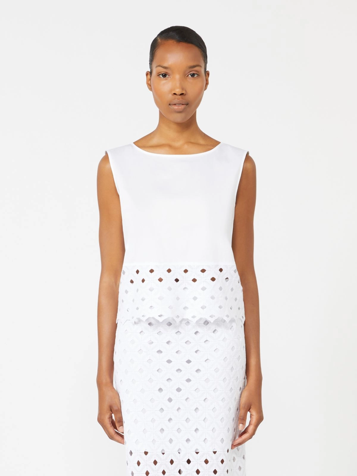 Top crop smanicato, impreziosito sul fondo da banda in pizzo macramè geometrico.