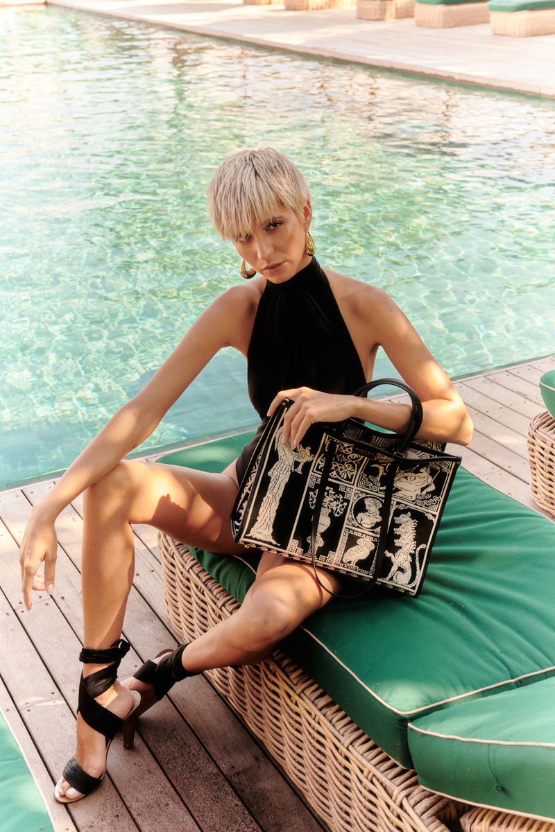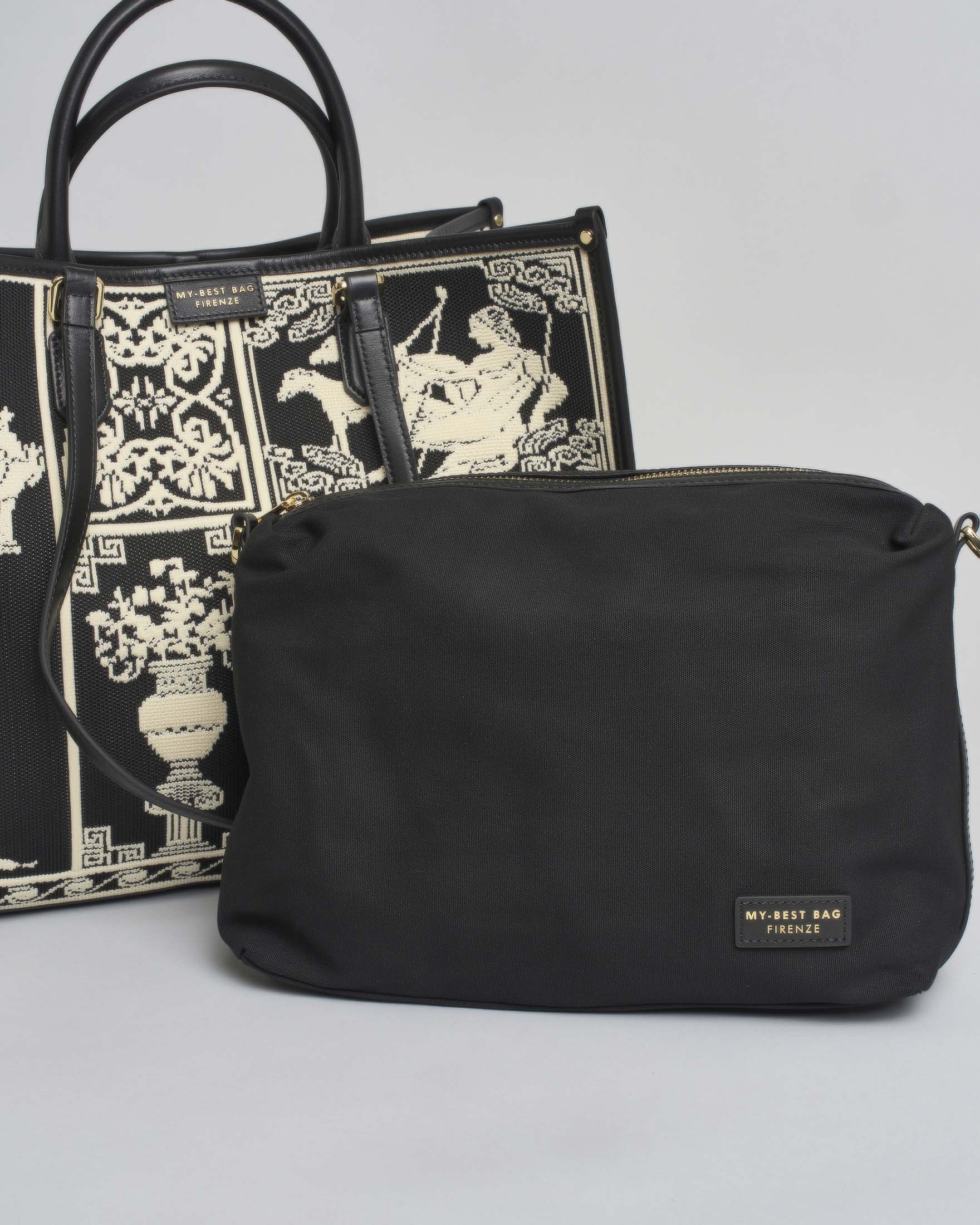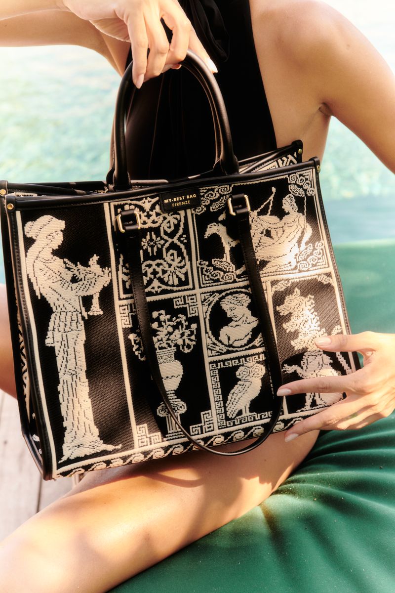 Tote bag grande nera in tessuto con ricamo all over bianco dispirazione greca. La struttura è valorizzata da base rigida con piedini protettivi in metallo. Profili e manici fissi in pelle per uso a mano e a spalla. Chiusura con listino e moschettone in metallo, etichetta logo in pelle sul fronte. Completa di pochette interna rimovibile con zip e patch logo, e tracolla regolabile e removibile.