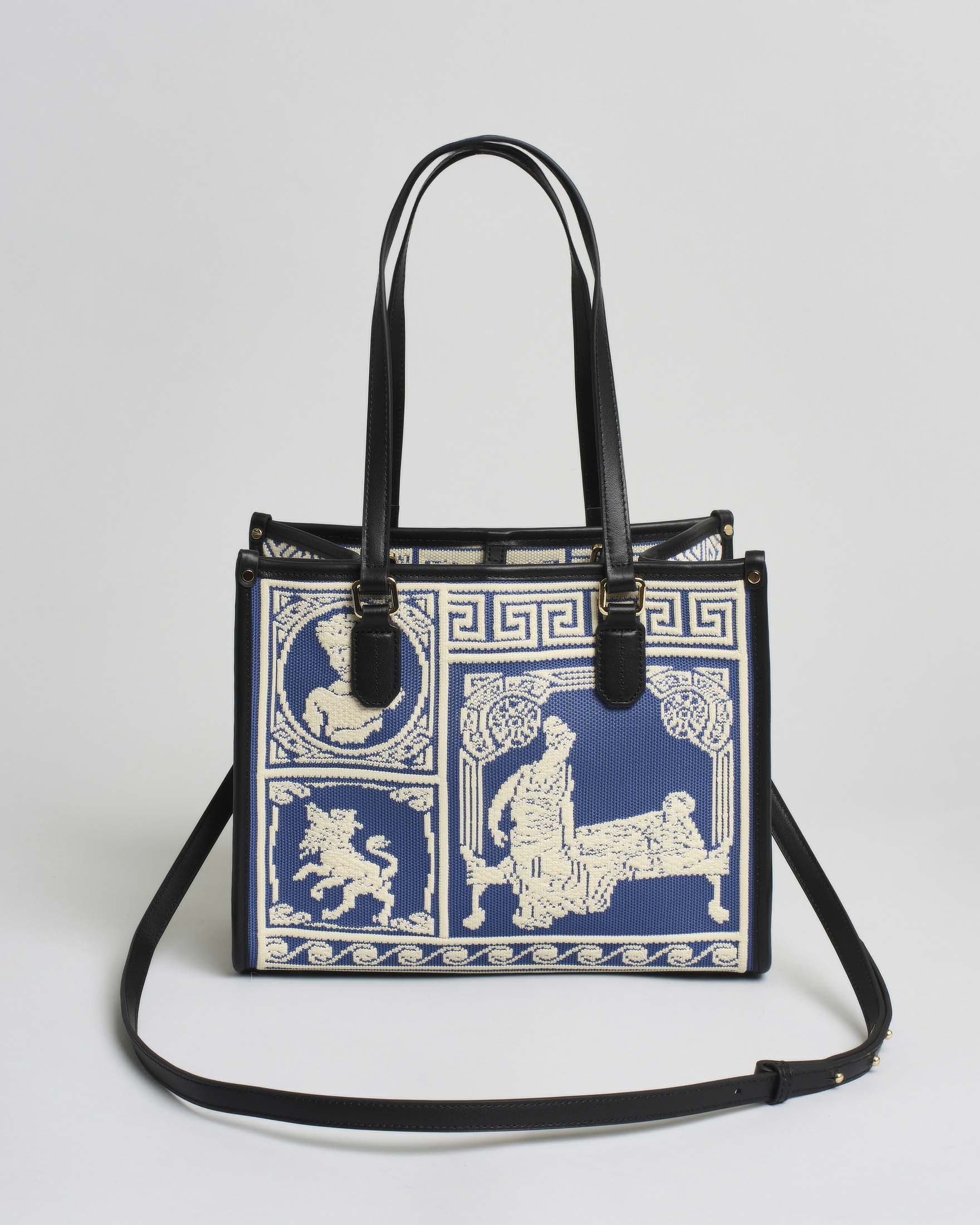 Tote bag media azzurra in tessuto con ricamo all over bianco dispirazione greca. La struttura è valorizzata da base rigida con piedini protettivi in metallo. Profili e manici fissi in pelle per uso a mano e a spalla. Chiusura con listino e moschettone in metallo, etichetta logo in pelle sul fronte. Completa di pochette interna rimovibile con zip e patch logo, e tracolla regolabile e removibile.