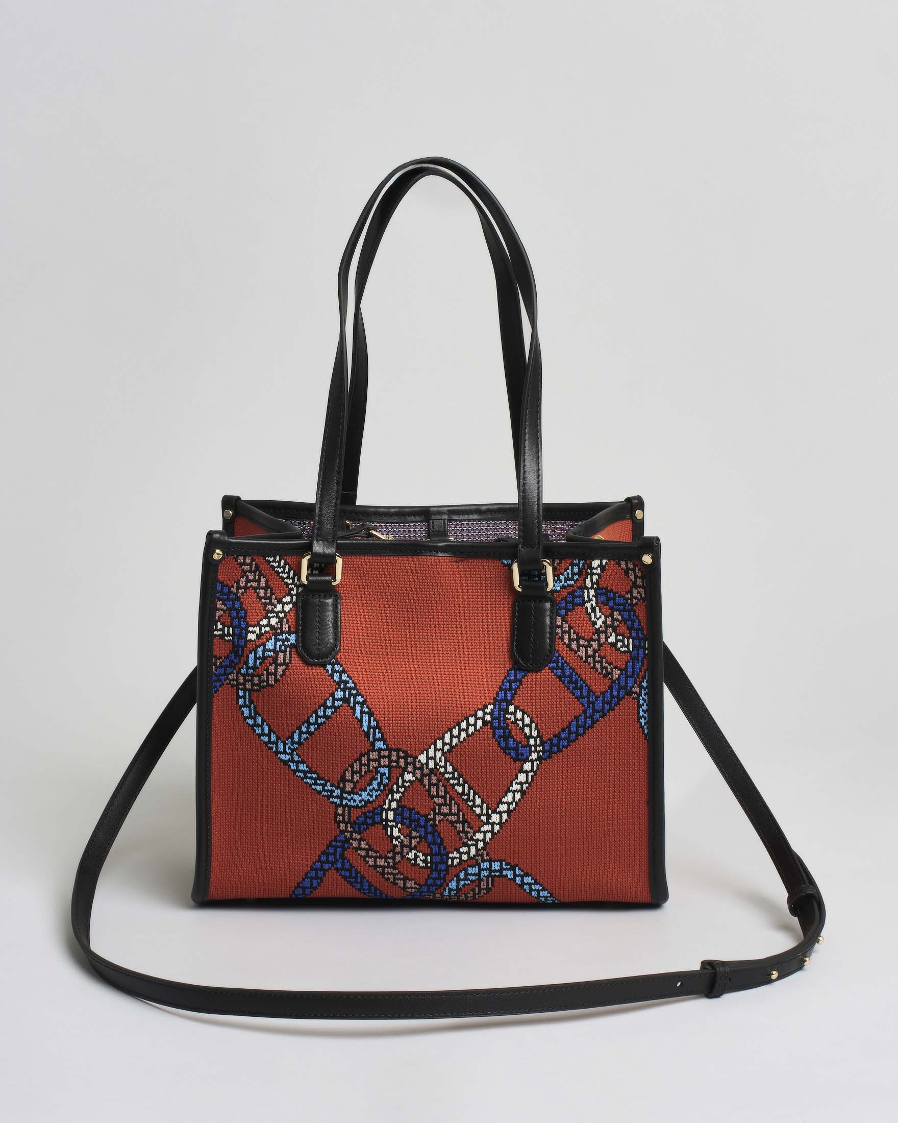 Tote bag misura media color arancio in tessuto con ricamo a catena a contrasto, dal design distintivo e contemporaneo. La base rigida è completata da piedini protettivi in metallo. Profili e manici fissi in pelle consentono luso a mano e a spalla. Chiusura con listino e moschettone in metallo, etichetta logo in pelle applicata sul fronte. Completa di pochette interna rimovibile con zip e patch logo, e tracolla regolabile e removibile.