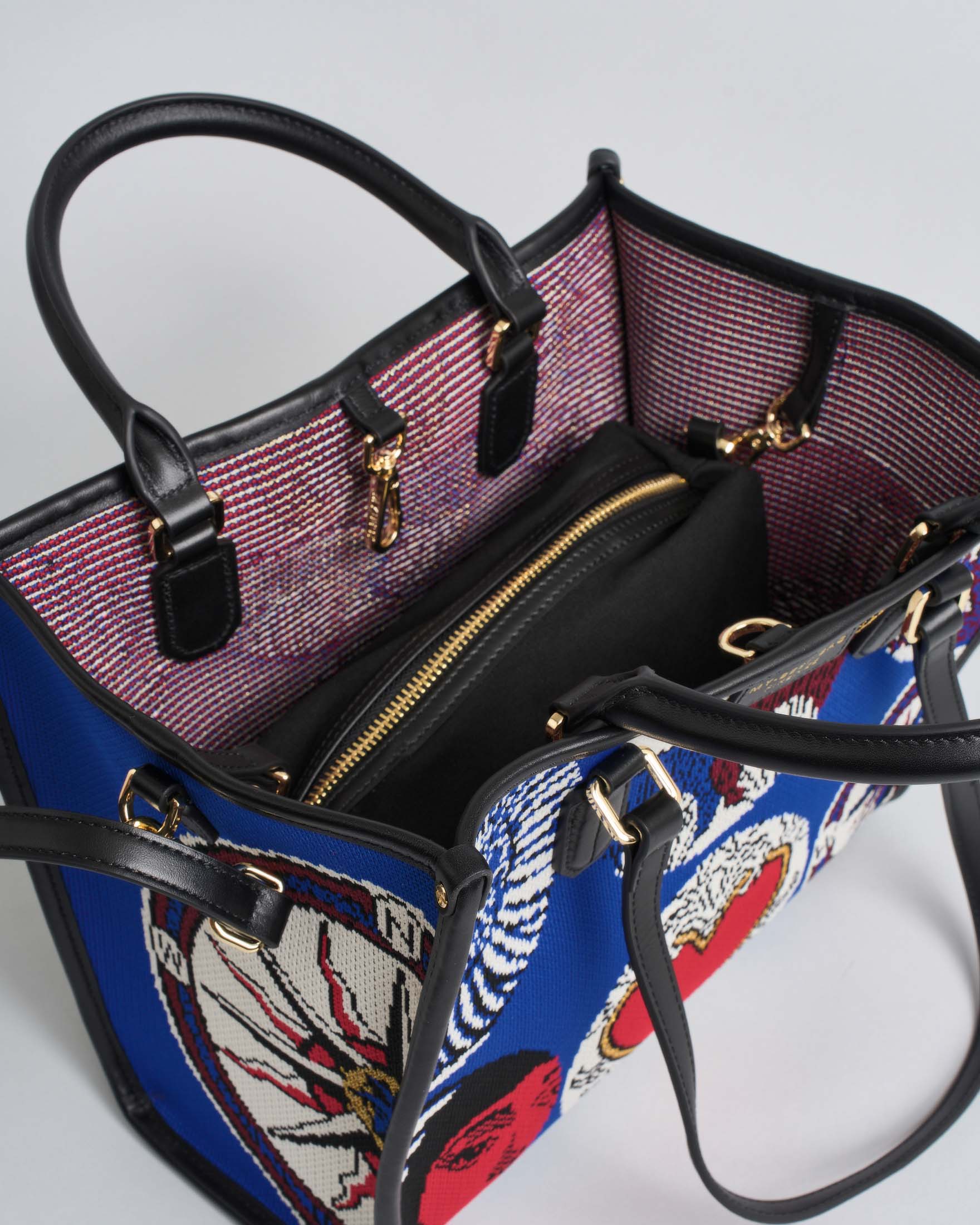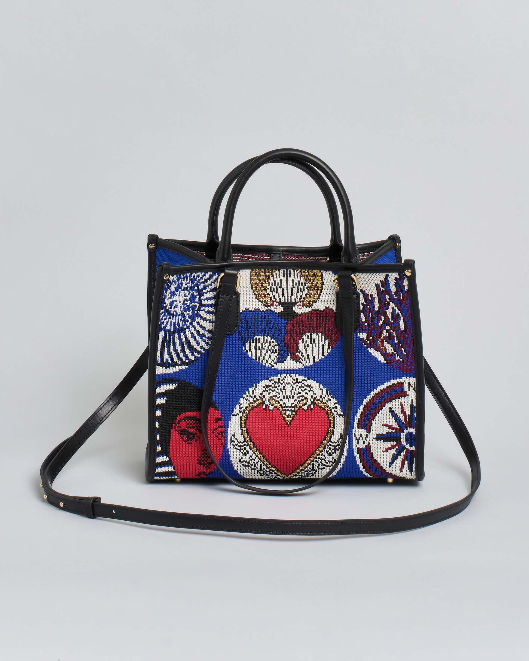 Tote bag media blu in tessuto con riquadri tondi ricamati bianchi e dettagli interni nei toni di rosso, blu e nero. Struttura con base rigida e piedini in metallo, manici fissi in pelle per uso a mano o a spalla, e chiusura con listino e moschettone. Completa di pochette interna rimovibile con zip e patch logo, e tracolla regolabile e removibile, perfetta per look quotidiani e sofisticati.