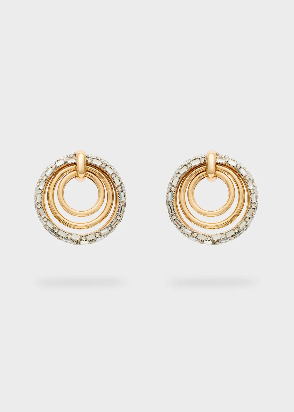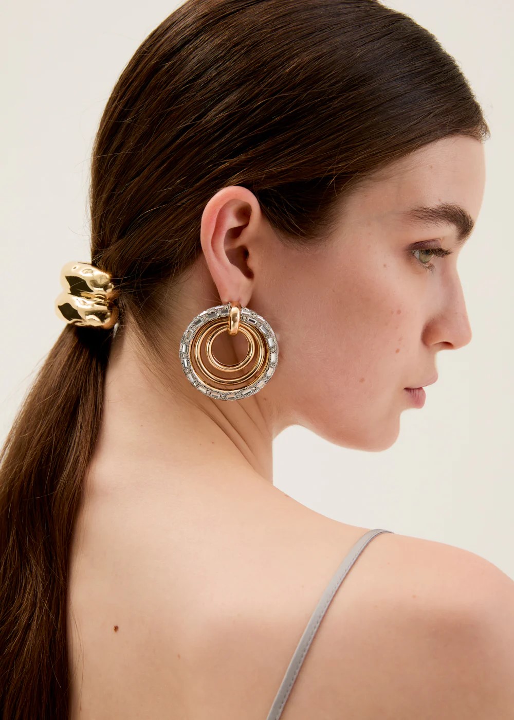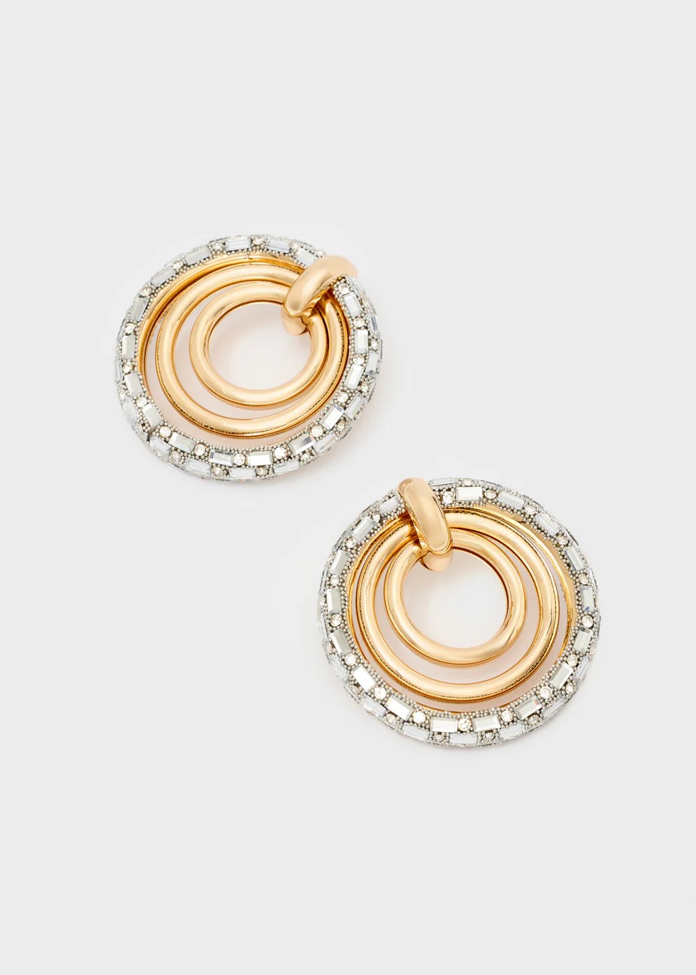 Orecchini tondi a cerchio con cerchi concentrici e dettagli luminosi, un modello raffinato e versatile che esalta la femminilità.
