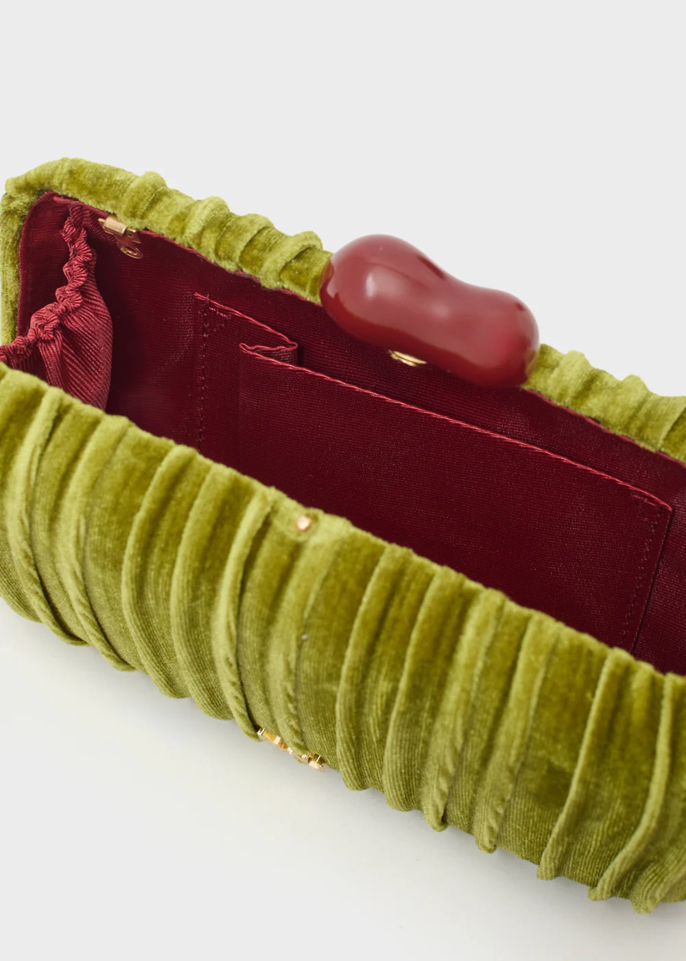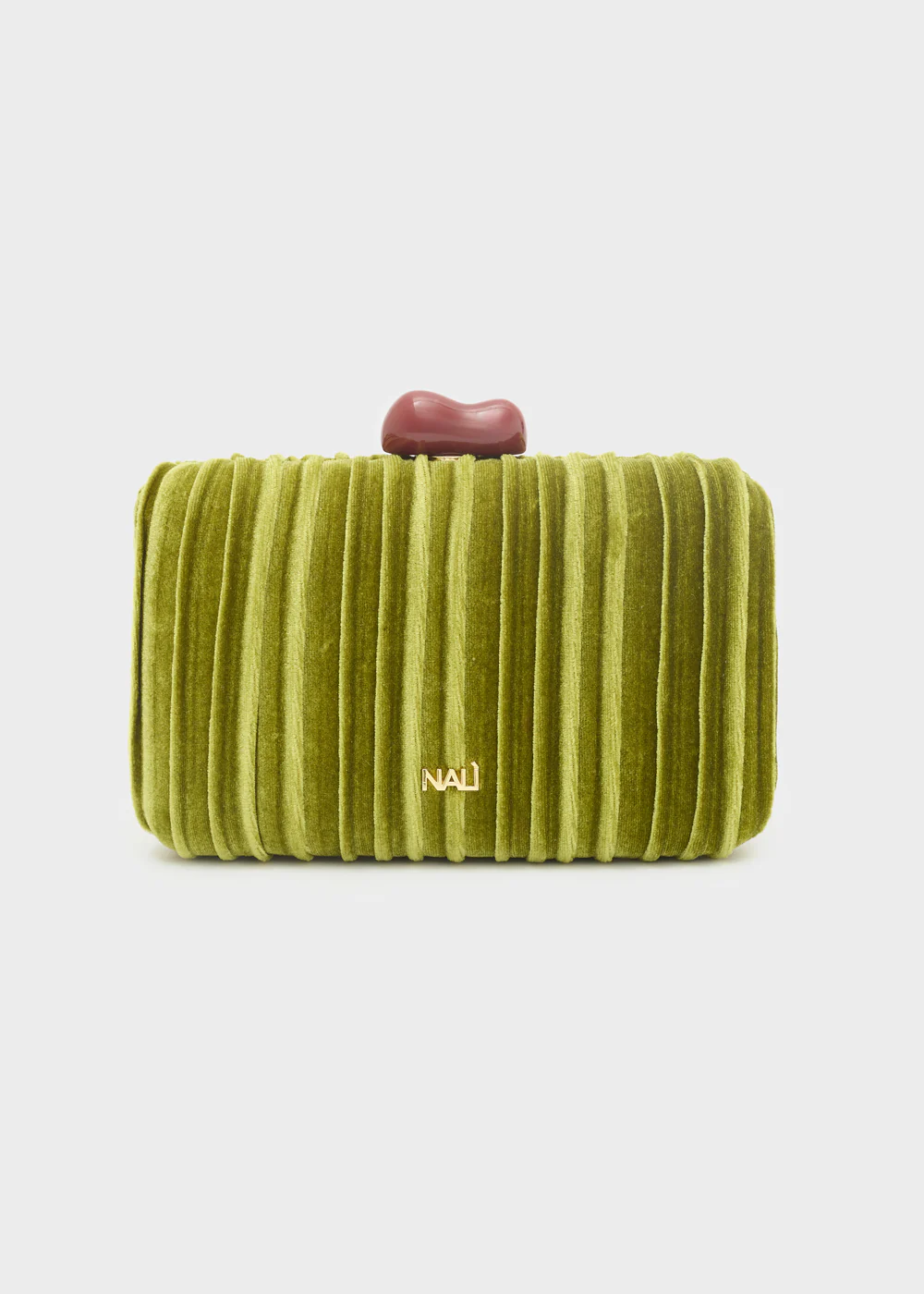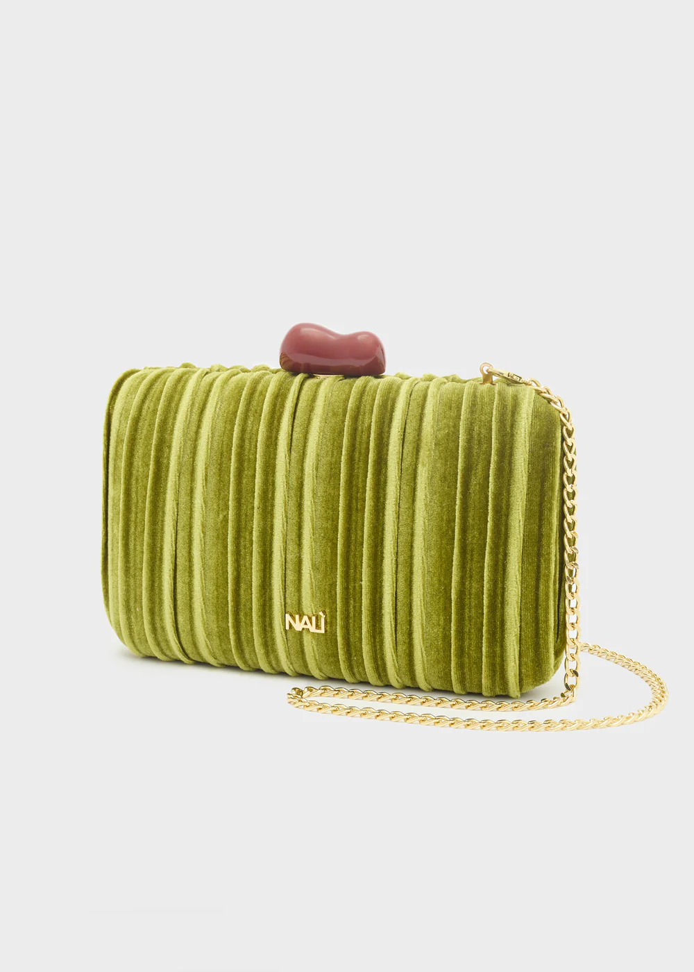 Pochette rigida in velluto con chiusura gioiello e catena dorata. Un accessorio sofisticato e originale, perfetto per serate ed eventi speciali grazie al suo design elegante e al tocco di colore raffinato.