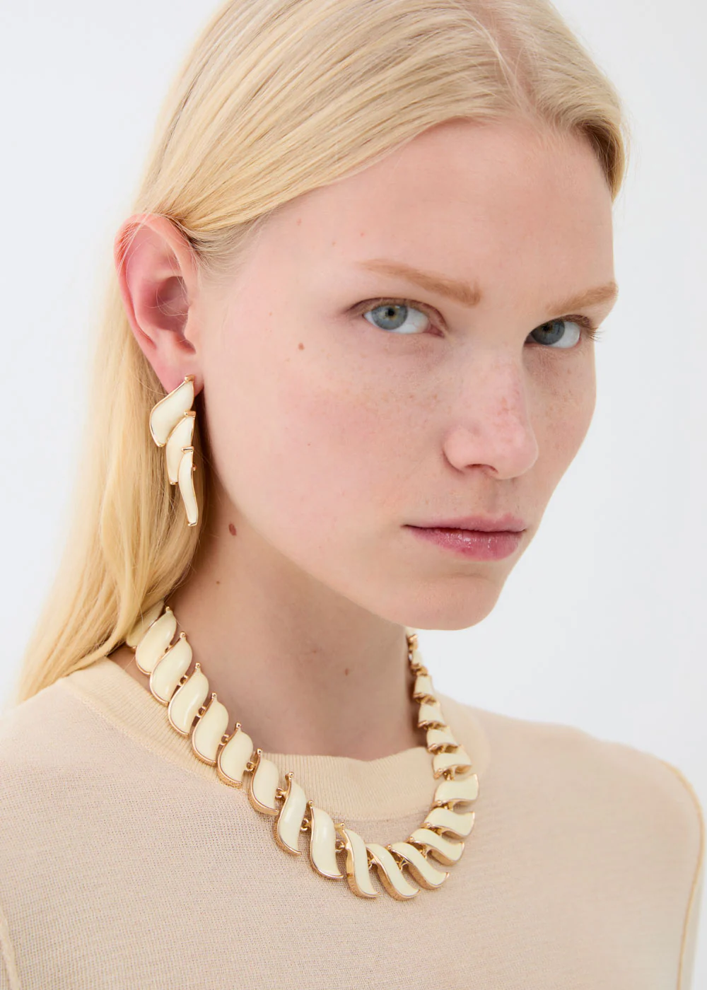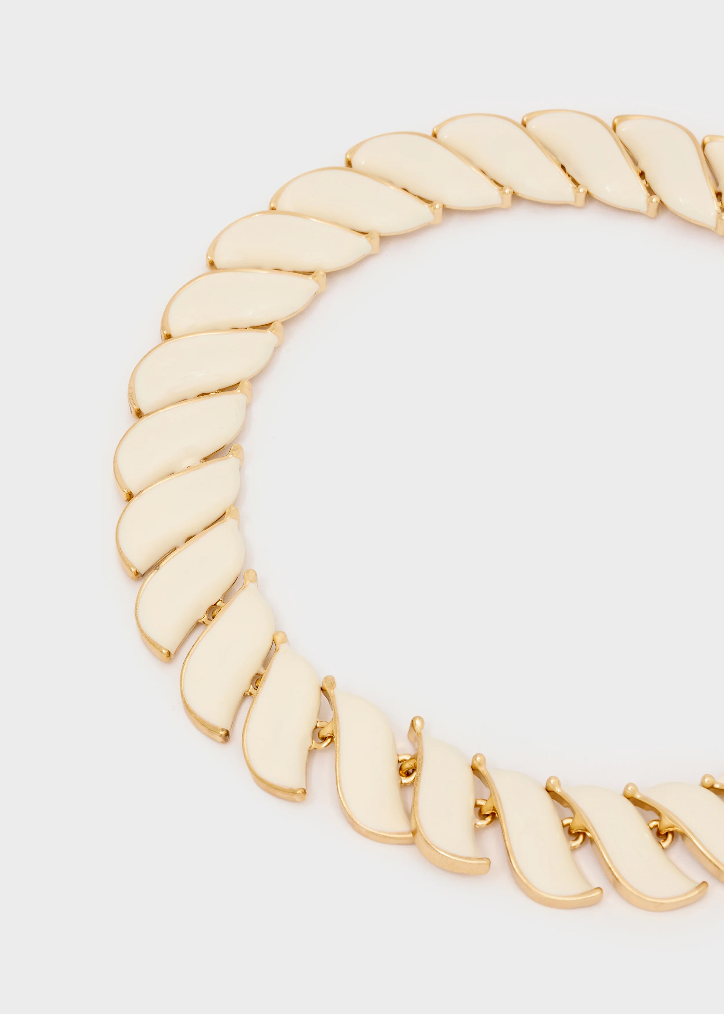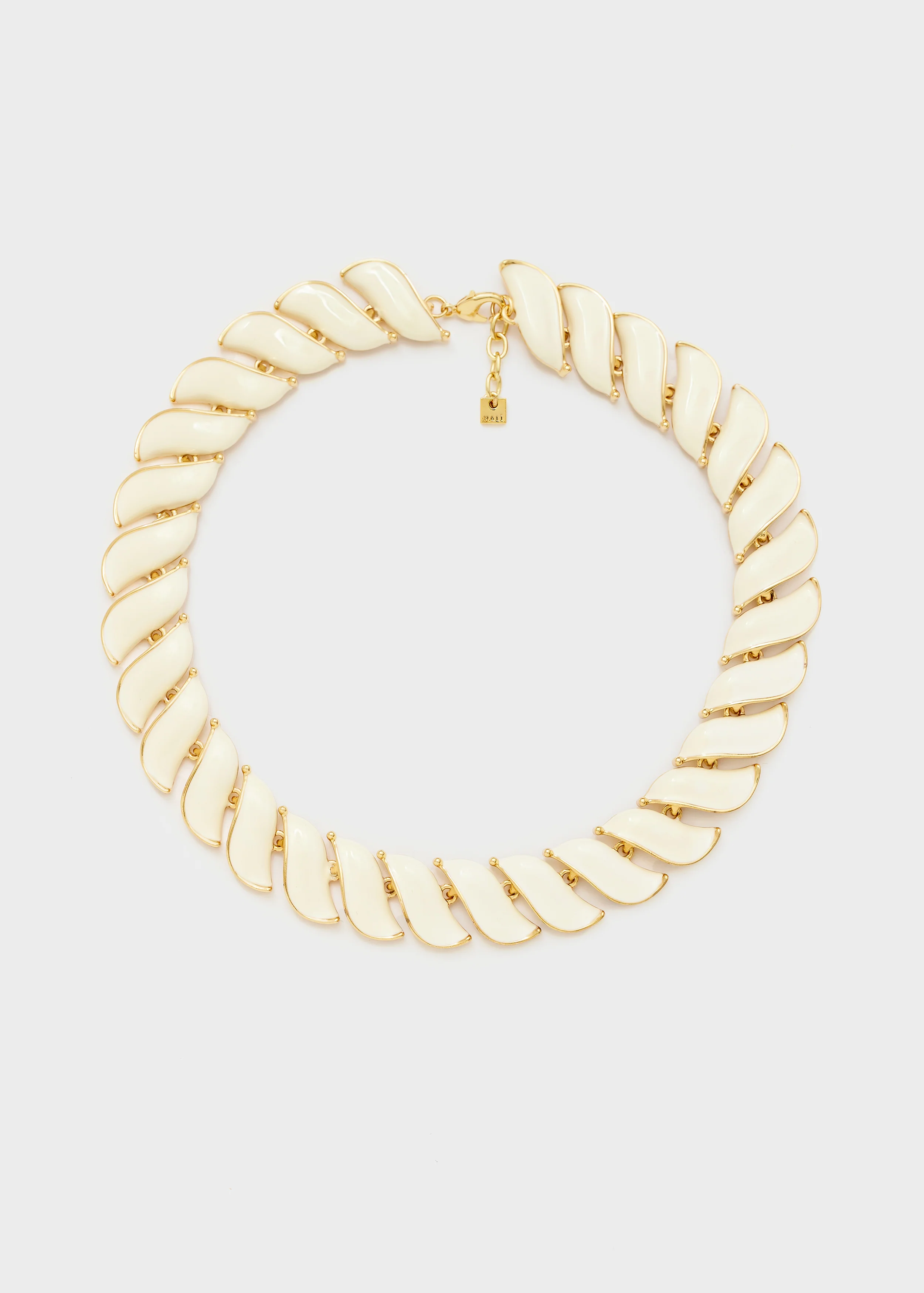 Collana girocollo composta da una sequenza armoniosa di elementi curvi color avorio con profili dorati. Il design modulare crea un movimento elegante che avvolge il collo con stile contemporaneo. Perfetta per chi ama accessori di carattere ma equilibrati, questa collana è ideale sia per look da giorno raffinati sia per outfit serali dal gusto moderno.