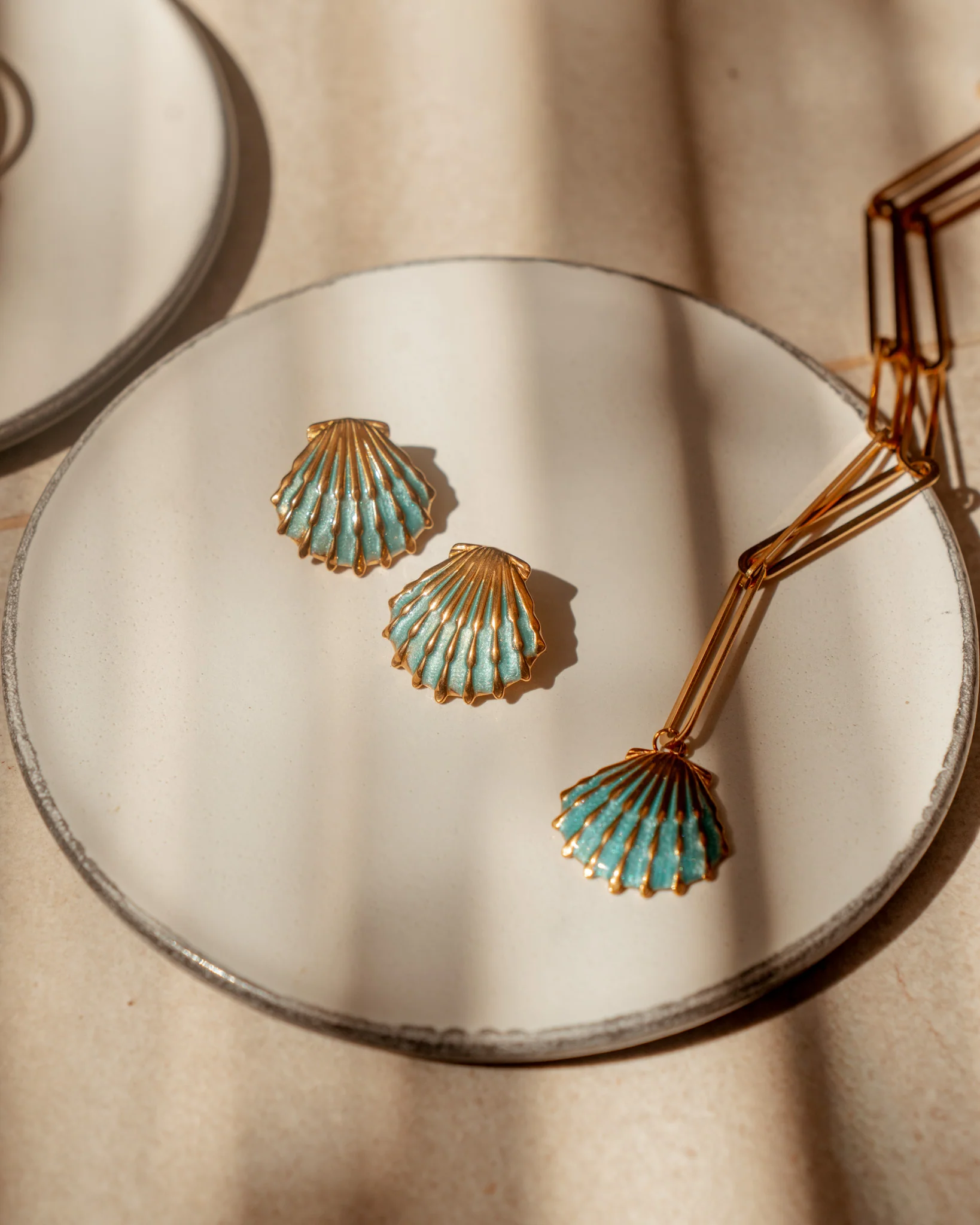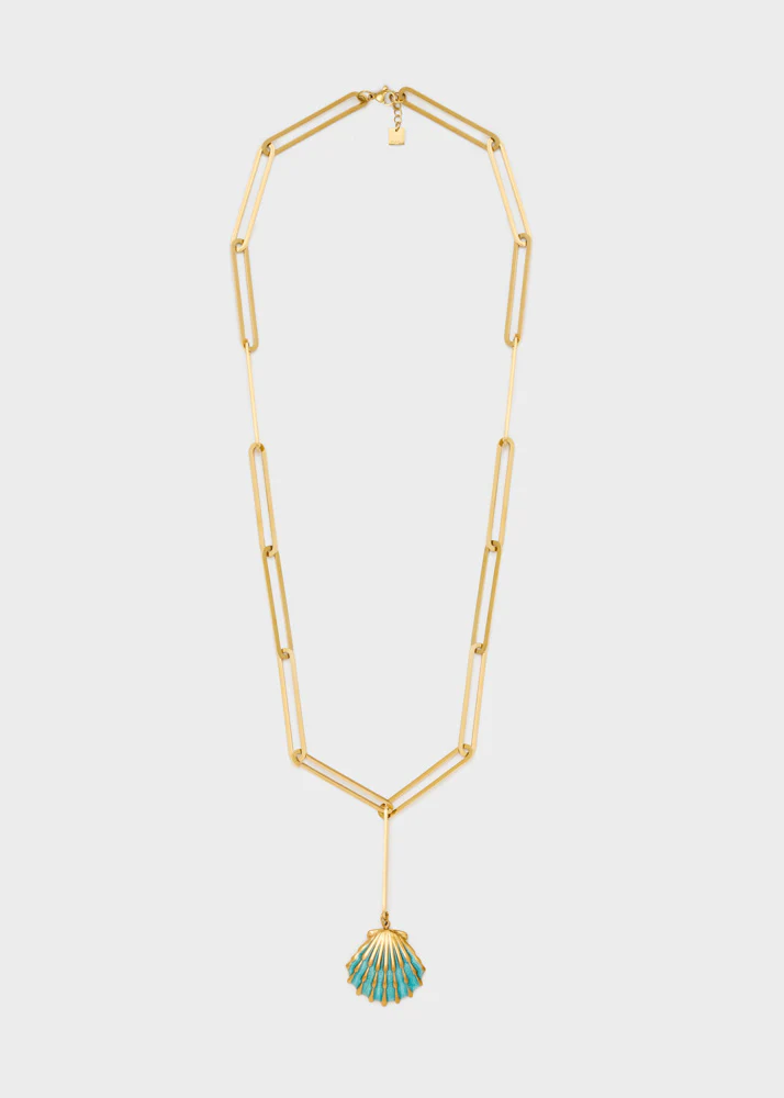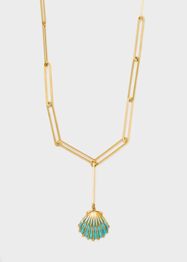 Collana con maxi maglie dorate e pendente a conchiglia smaltata, un accessorio deciso e dal forte richiamo marino.