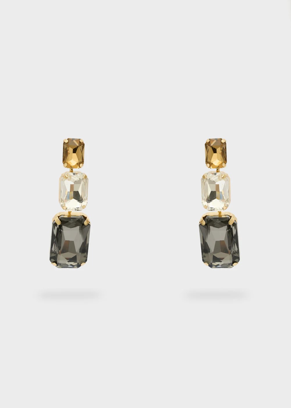 Orecchini pendenti con tre cristalli geometrici di diverse dimensioni, un design essenziale e chic per look sofisticati.
