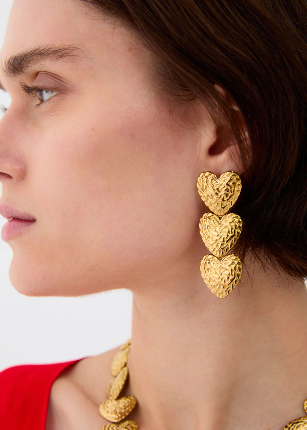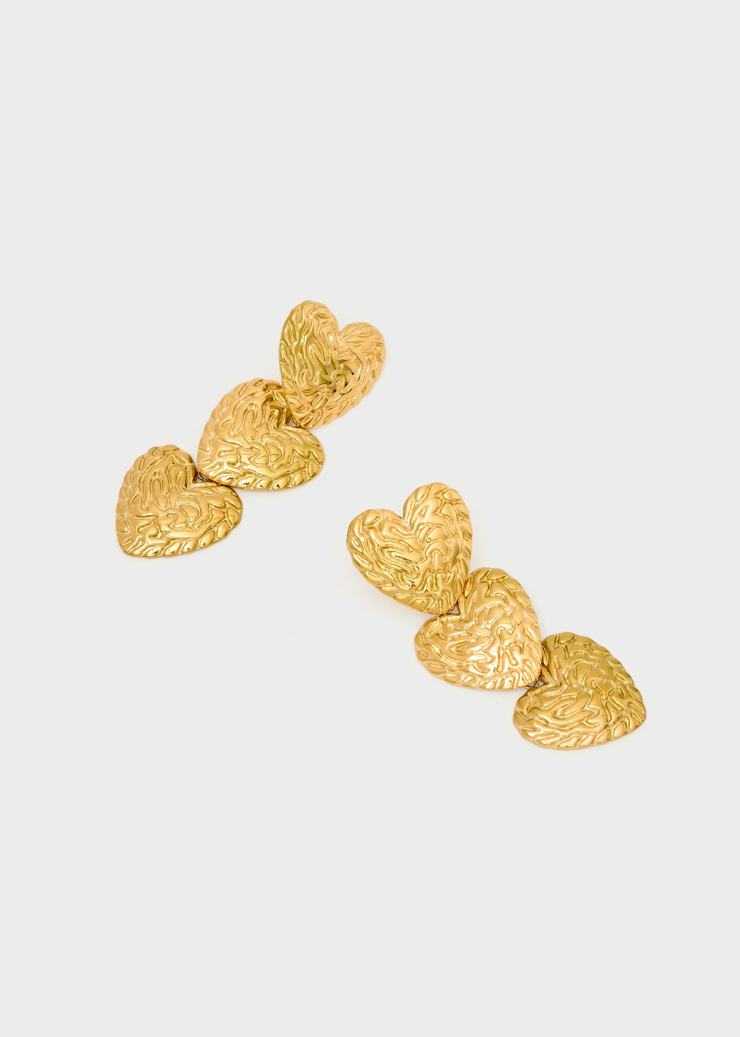 Orecchini pendenti composti da elementi a forma di cuore sovrapposti. La superficie lavorata crea un raffinato gioco di texture, perfetto per aggiungere carattere al look.