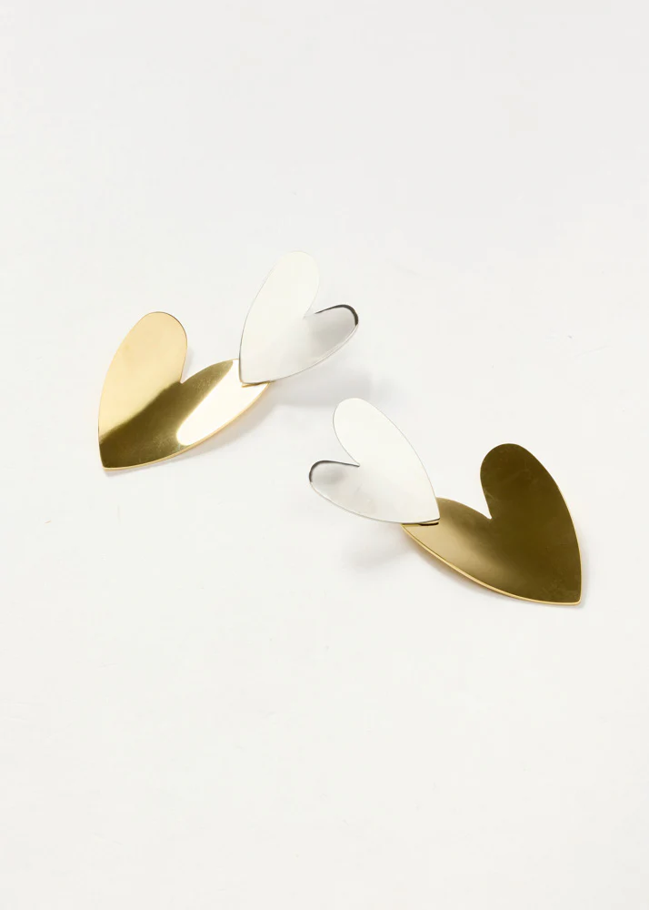 Orecchini a forma di cuore dal design scultoreo e contemporaneo, caratterizzati da una raffinata combinazione bicolore oro e argento. Le superfici lisce e specchiate creano giochi di luce eleganti che valorizzano il viso, mentre la forma fluida dona movimento e femminilità. Ideali per completare look romantici ma anche outfit moderni, questi orecchini rappresentano una scelta sofisticata per ogni occasione, dal giorno alla sera.
