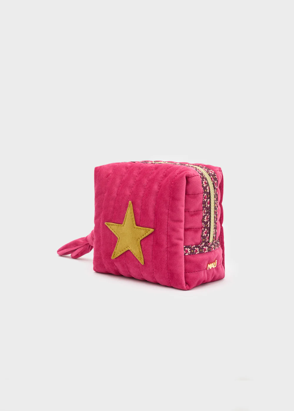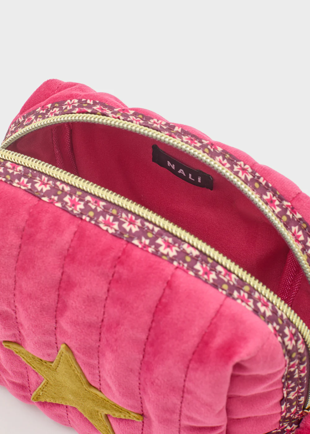 Beauty case in tessuto morbido con imbottitura trapuntata e applicazione decorativa sul davanti. Un accessorio funzionale e alla moda, ideale per custodire trucchi e oggetti personali con stile.
